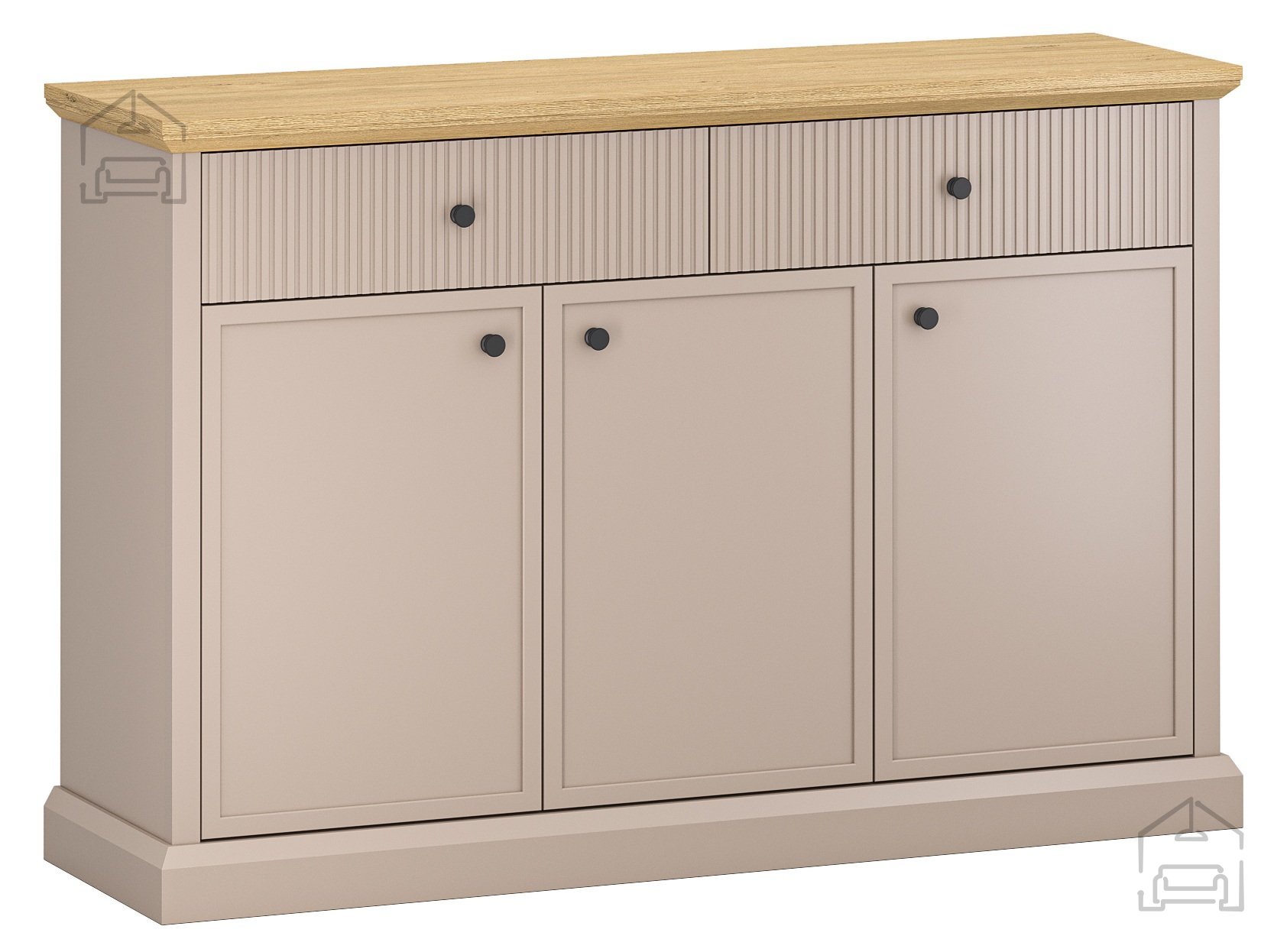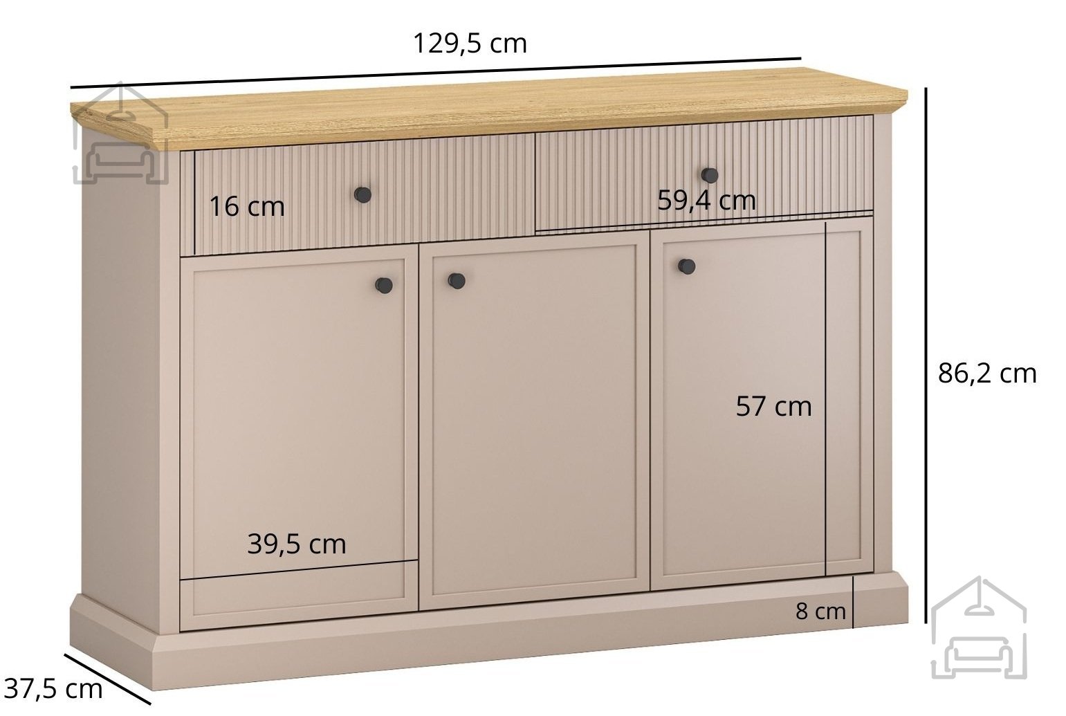 Ohišje komode je izdelano iz laminirane iverne plošče debeline 16 mm, kar zagotavlja dobro stabilnost in enostavno vzdrževanje. Zgornja plošča je dodatno ojačana in dosega debelino 38 mm, kar ji daje trdnost in vizualno močnejši vtis. Površina v odtenku taupe je dopolnjena z vrhnjo ploščo v dekorju kamnitega hrasta, ki doda naraven kontrast in toplino. Kombinacija teh dveh barv ustvarja uravnotežen videz, ki se lepo ujema z nevtralnimi stenami ali kovinskimi dodatki v prostoru.