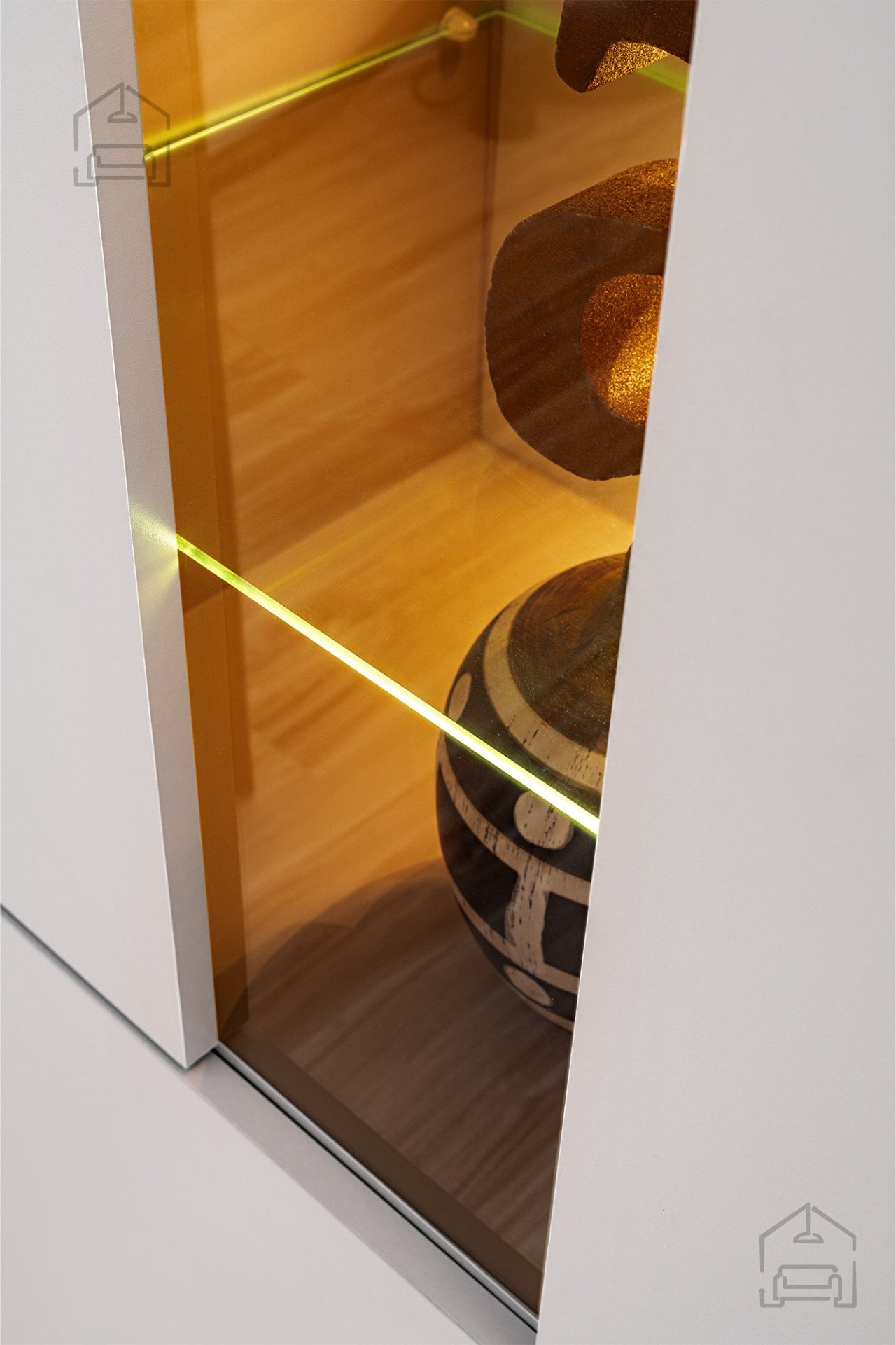 Za ustvarjanje prijetnega vzdušja v prostoru poskrbi vgrajena LED osvetlitev, ki dodaja toplino in poudari strukturo površin. Svetloba ni le estetski dodatek, temveč tudi praktičen element, saj olajša orientacijo v prostoru in izpostavi dekorativne detajle. LED tehnologija zagotavlja nizko porabo energije in dolgo življenjsko dobo, kar dopolnjuje ekološko naravnanost sodobne notranje opreme.