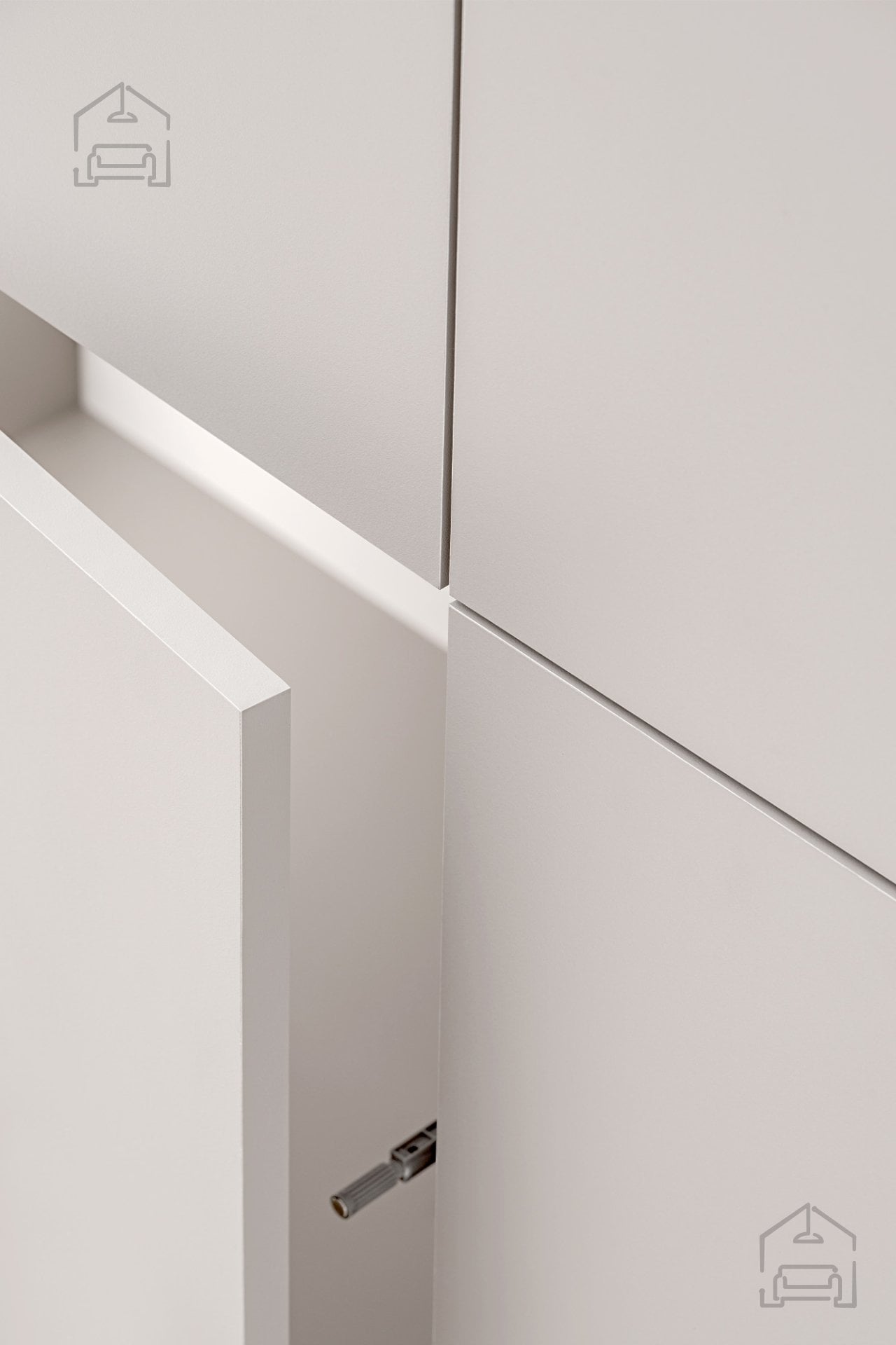 Ena ključnih prednosti kolekcije je sistem odpiranja na dotik. Namesto tradicionalnih ročajev se vrata in predali odpirajo z nežnim pritiskom na površino, kar omogoča popolnoma gladko in čisto fronto brez motečih dodatkov. Takšen pristop ne le poenostavi uporabo, temveč tudi poudari minimalistično zasnovo in eleganten značaj pohištva. Sistem je tehnično dovršen in zasnovan za dolgotrajno delovanje brez izgube učinkovitosti.