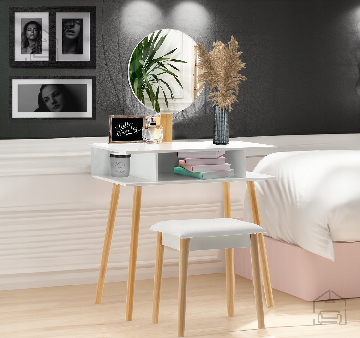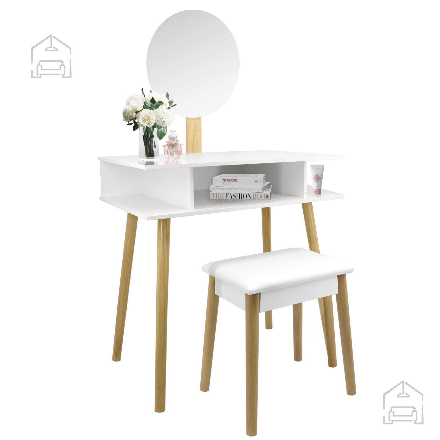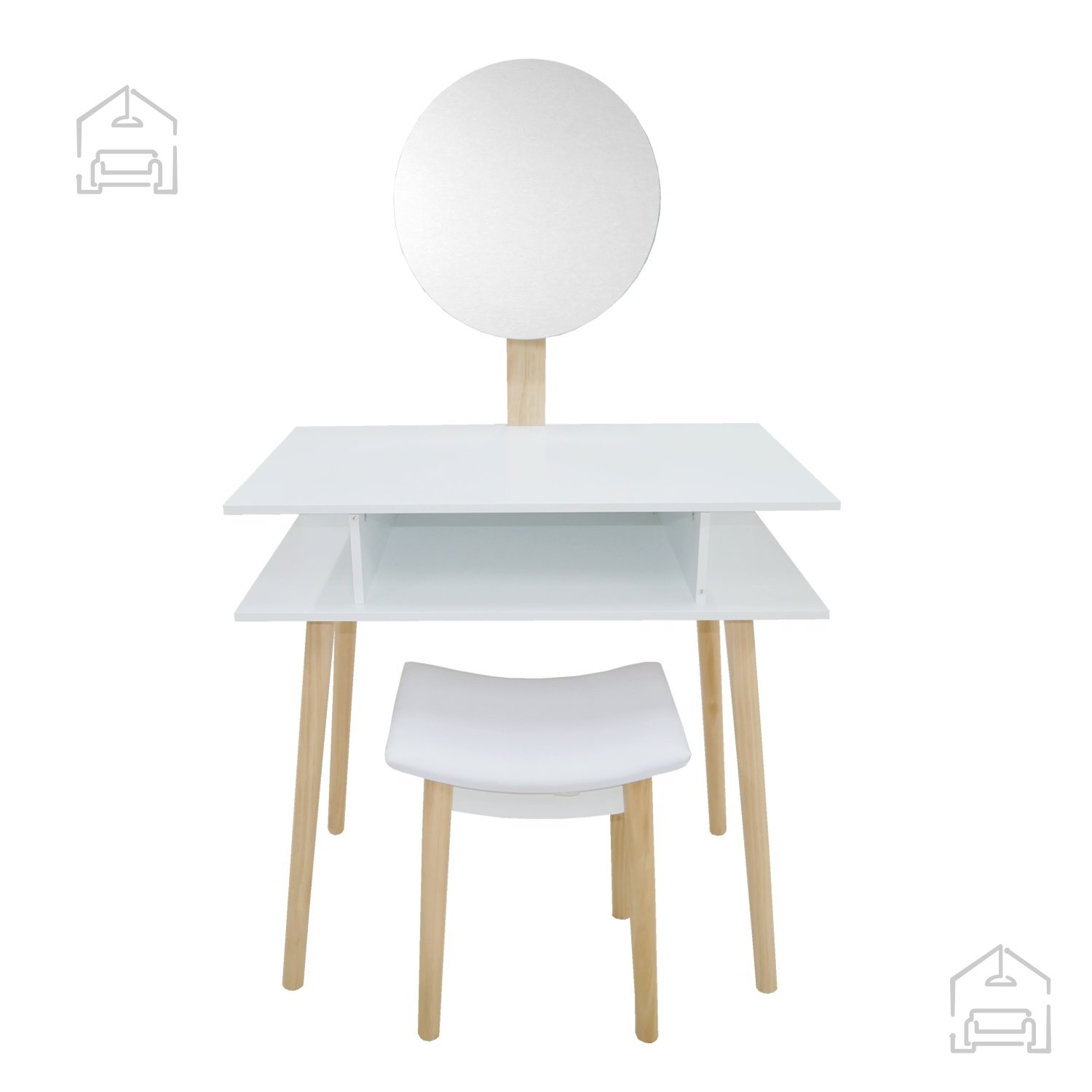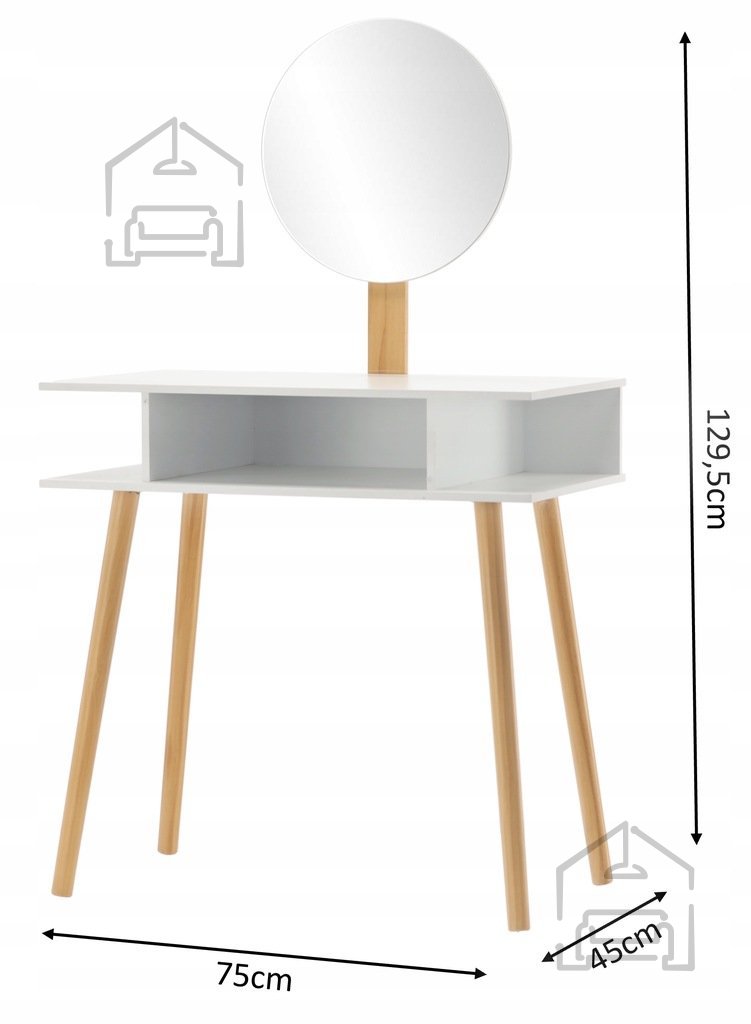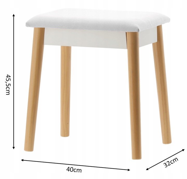 S svojimi merami 75×45×129,5 cm ponuja mizica dovolj prostora za vsakodnevno uporabo, ne da bi zavzela preveč prostora. Poleg tega je priložen tudi oblazinjen taburet (40×32×45,5 cm), ki zagotavlja udobno sedenje med ličenjem ter se po uporabi preprosto pospravi pod mizo.