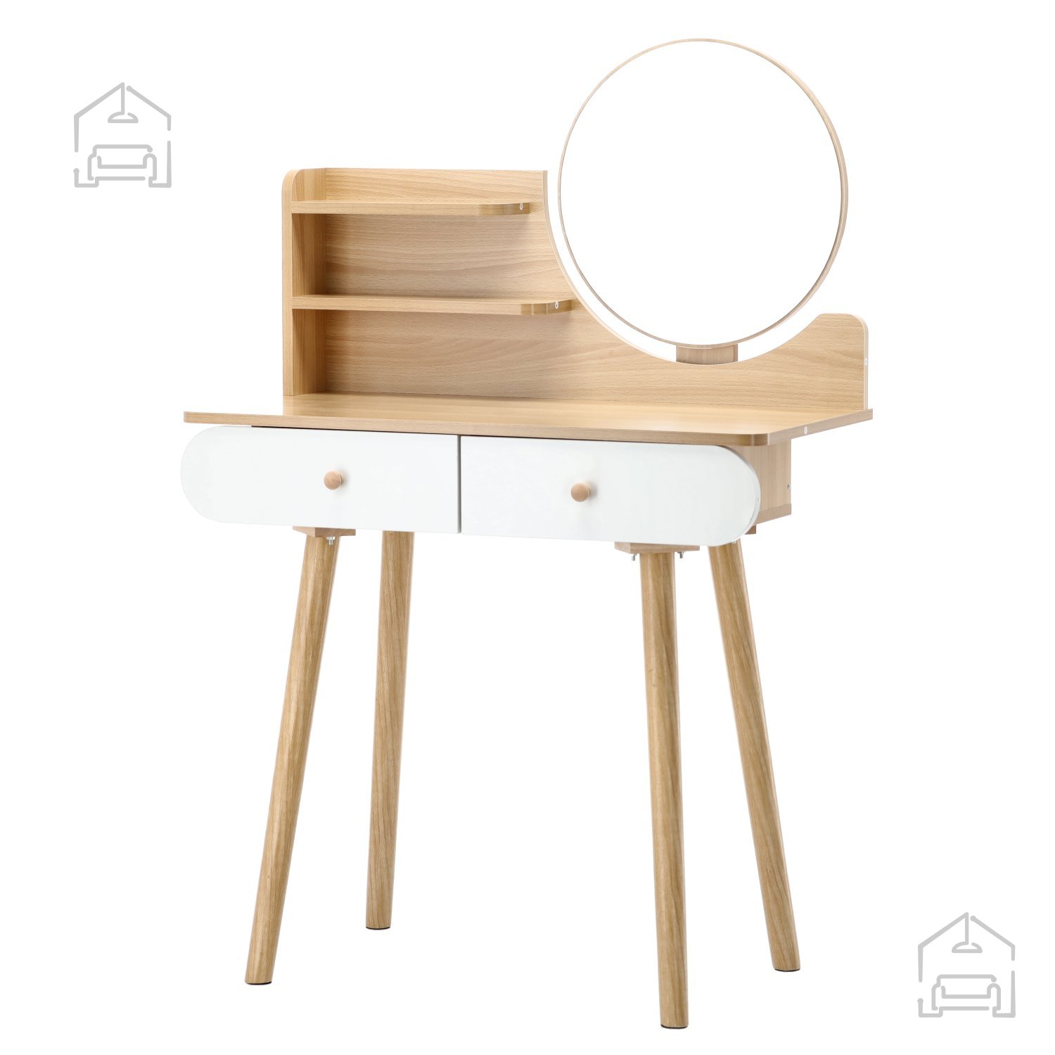 Masivni borov les in MDF plošča v kombinaciji svetlega lesa ter bele fronte: toaletna mizica z ogledalom 80 × 40 × 120 cm – Chomik. Ta elegantna toaletna mizica s prefinjenim dizajnom in praktičnim okroglim ogledalom je popolna izbira za vse, ki želijo v svojem domu ustvariti kotiček za vsakodnevno nego in sprostitev. Njena uravnotežena kombinacija naravnega videza lesa in sodobnih belih poudarkov omogoča, da se harmonično zlije z različnimi notranjimi stili – od skandinavskega minimalizma do klasične elegance. Dva prostorna predala in dve priročni polici zagotavljata dovolj prostora za shranjevanje kozmetike, nakita, dodatkov in drugih osebnih predmetov, medtem ko stabilna konstrukcija iz borovega lesa nudi zanesljivo trdnost in dolgo življenjsko dobo.