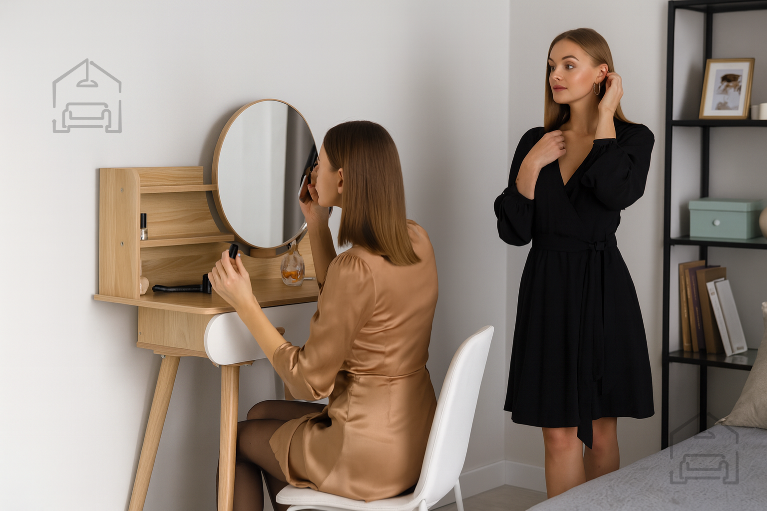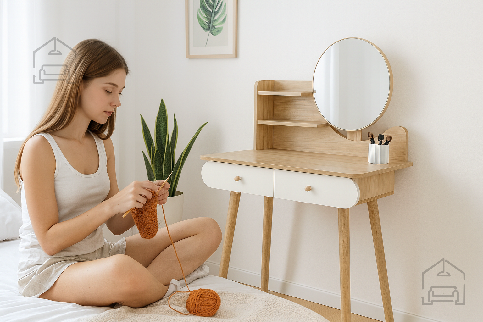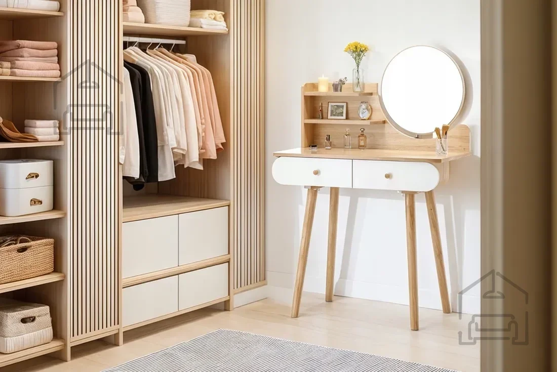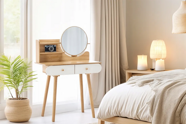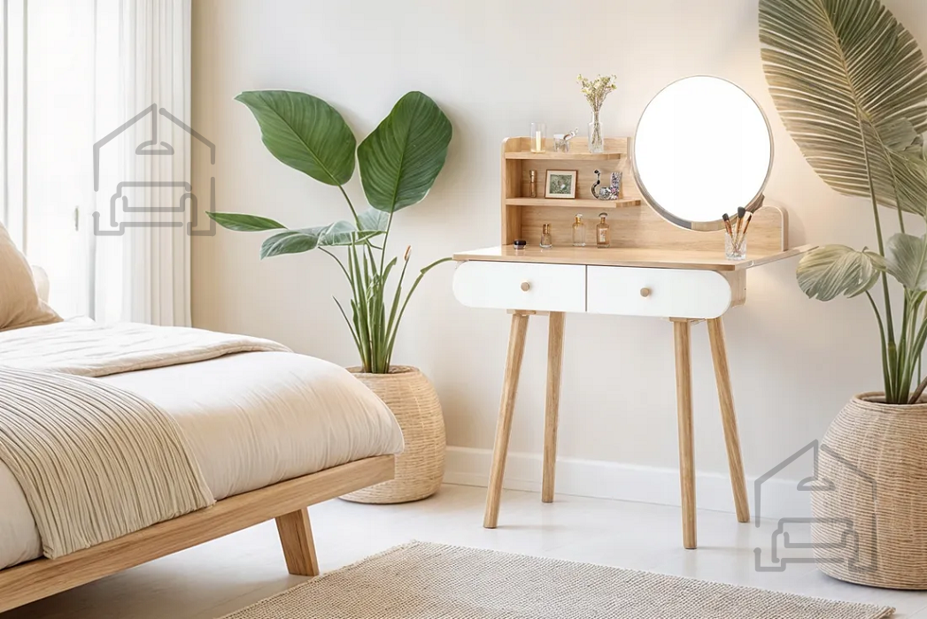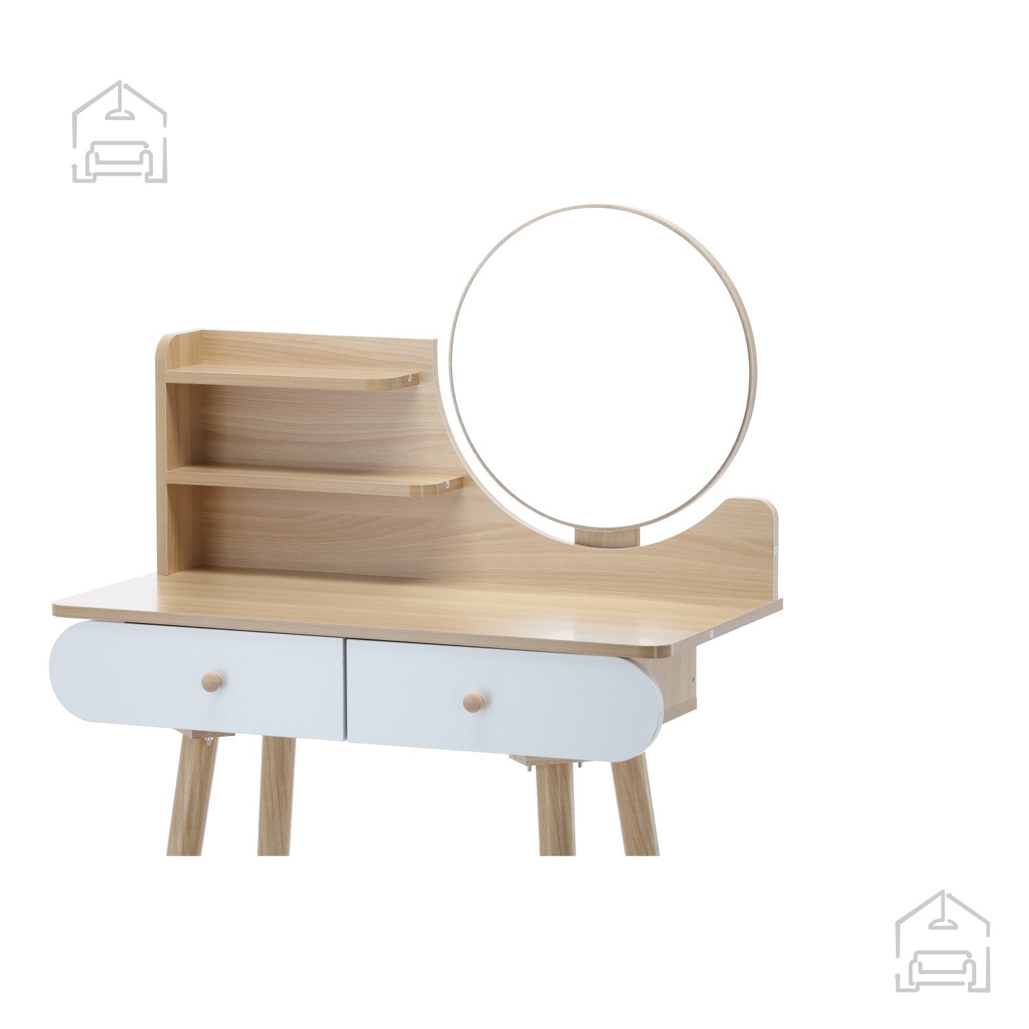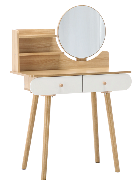 Njena univerzalna bela barva in naravni lesni odtenki omogočajo, da se toaletna mizica brez težav prilagodi različnim slogom notranje opreme. V svetlih in minimalističnih prostorih poudari čistost linij, v klasičnih pa prinese občutek topline in domačnosti. Lahko jo postavite v spalnico, garderobo ali celo kopalnico, kjer bo služila kot praktičen in estetski dodatek. Okroglo ogledalo dodaja pridih retro šarma in hkrati povečuje svetlobo v prostoru, kar je še posebej uporabno v manjših sobah.