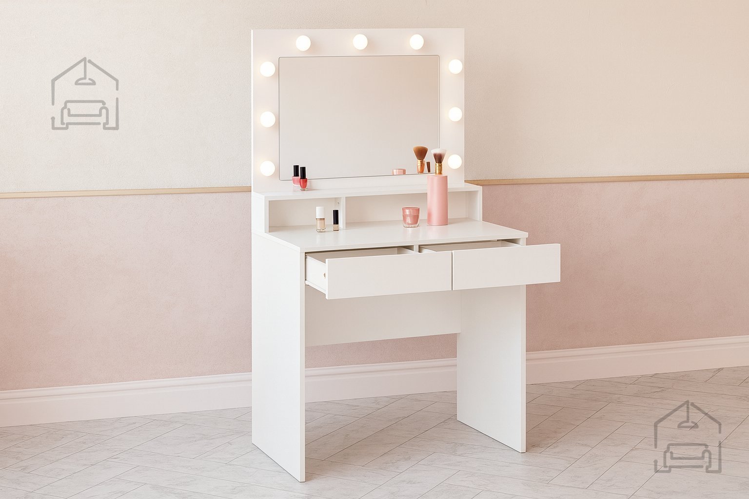 Bela kozmetična toaletna miza z LED ogledalom je popolna kombinacija funkcionalnosti in stila.