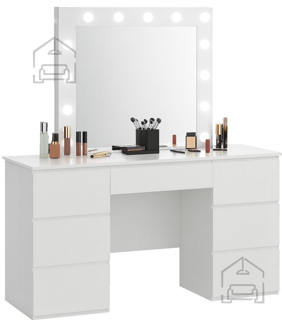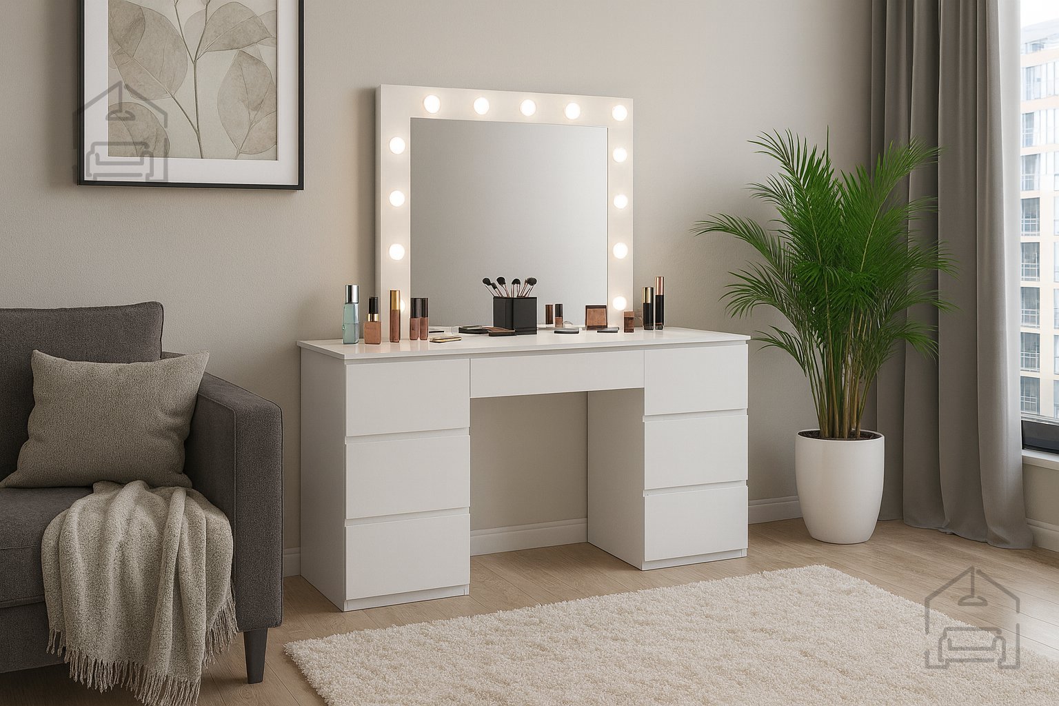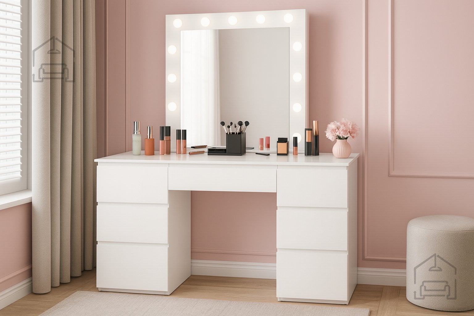 Dimenzije 132 × 43 × 152 cm zagotavljajo udobno uporabo in omogočajo, da miza za ličenje ne zavzame preveč prostora, hkrati pa ponuja dovolj površine za vse dnevne potrebe. Njena bela barva s čistimi linijami ustvarja občutek svežine in urejenosti, zato se lepo poda tako v spalnico kot v garderobno sobo. LED ogledalo z belo svetlobo v velikosti 50 × 55 cm omogoča natančno nanašanje ličil, nego kože ali urejanje pričeske tudi v slabših svetlobnih pogojih. Svetloba je enakomerna in prijetna za oči, kar zmanjšuje utrujenost in omogoča daljše, udobno delo pred ogledalom.