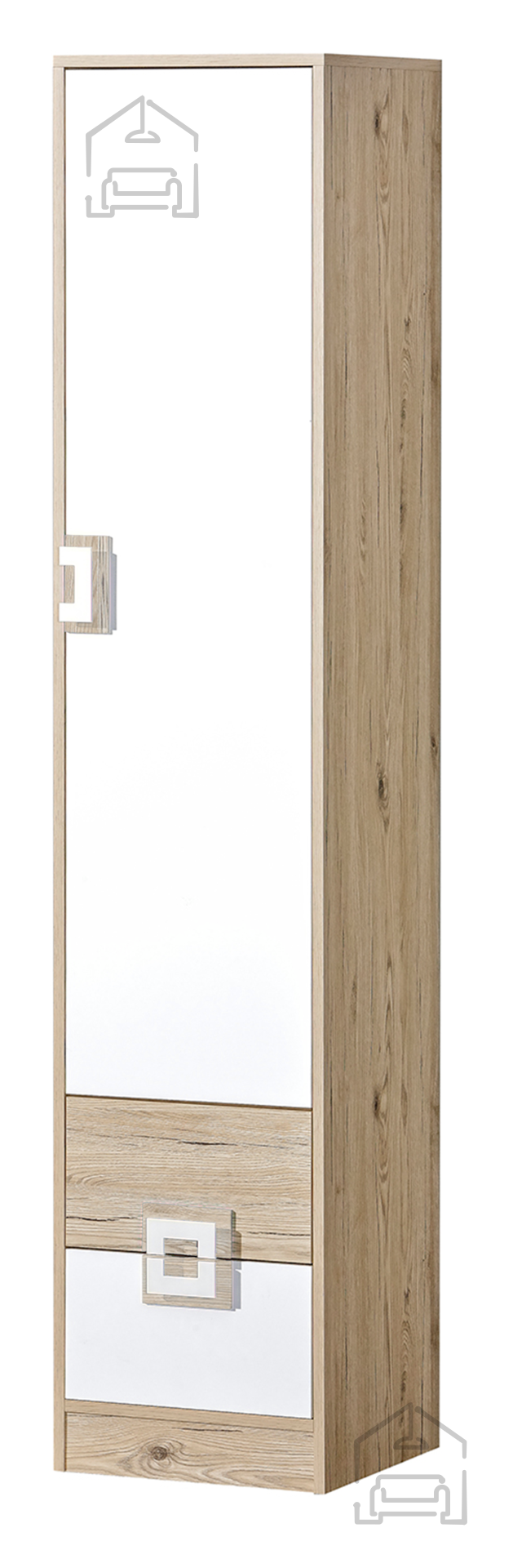 Barvna kombinacija hrasta in bele ustvarja prijetno ravnovesje med toplino lesa in svežino svetlih tonov. Takšna barvna shema je primerna za sodobne interierje, kjer želimo doseči občutek odprtosti in zračnosti. Regal Nico 5 se lepo ujema z drugimi kosi pohištva v naravnih odtenkih, sivih tonih ali z belimi površinami. Hrastova tekstura daje občutek domačnosti, bela pa poskrbi za vizualno lahkotnost.