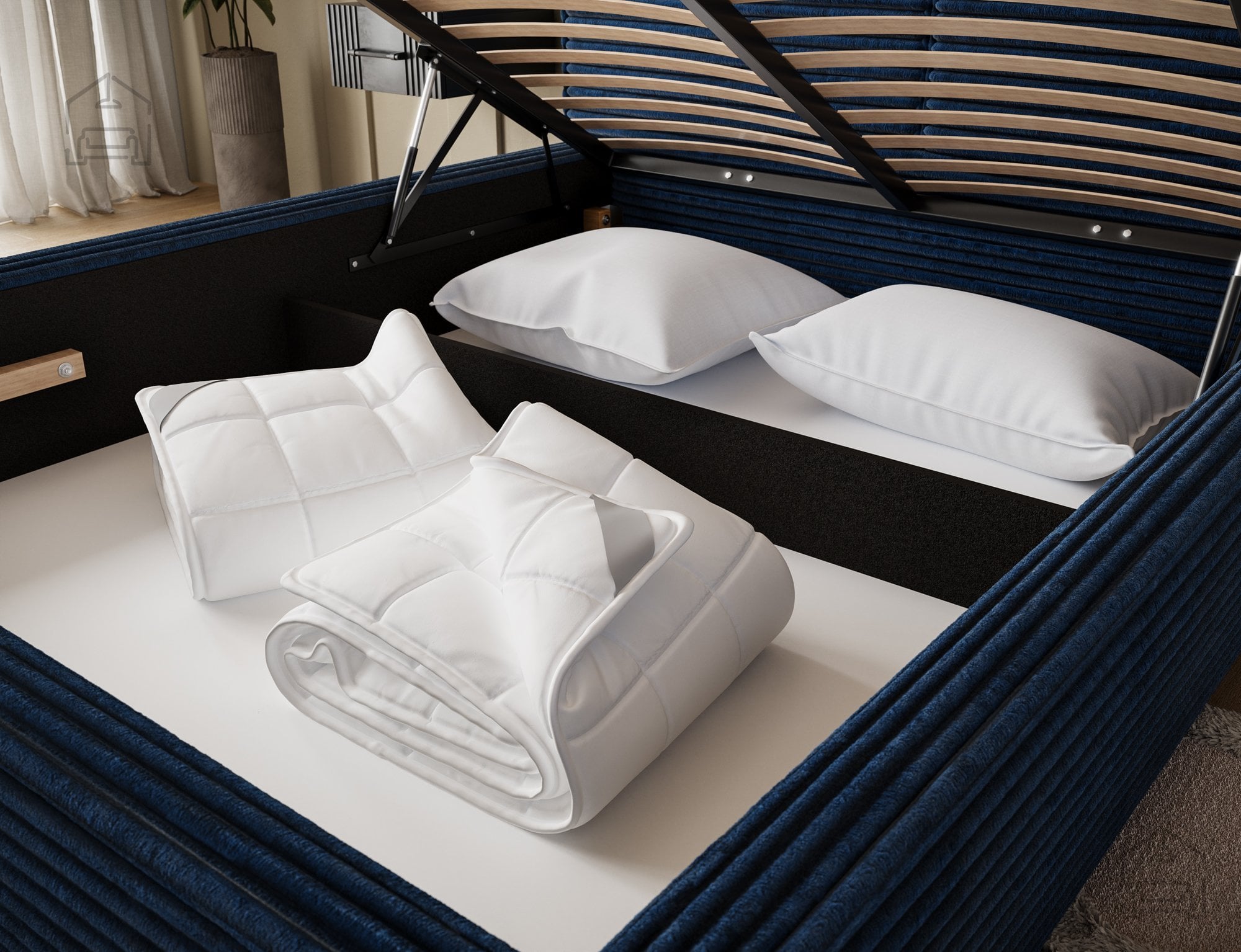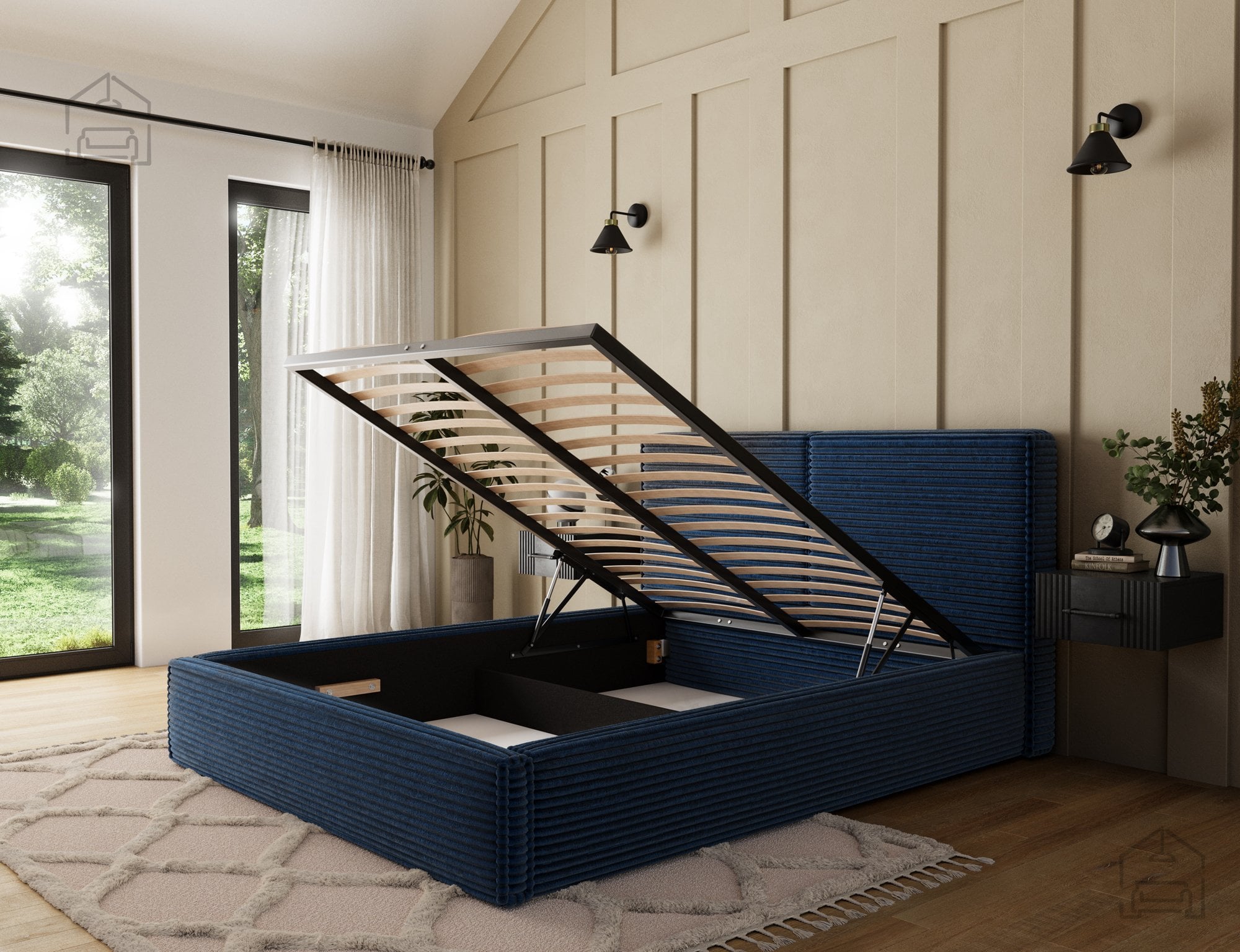 Postelja Pesillo je več kot le estetski kos pohištva – ponuja tudi praktične rešitve. Vgrajen dvižni mehanizem omogoča preprost dostop do prostornega predala za posteljnino, kjer lahko shranjujete odeje, blazine ali sezonsko posteljnino. S tem se učinkovito izkoristi prostor pod ležiščem, kar je še posebej koristno v manjših stanovanjih.