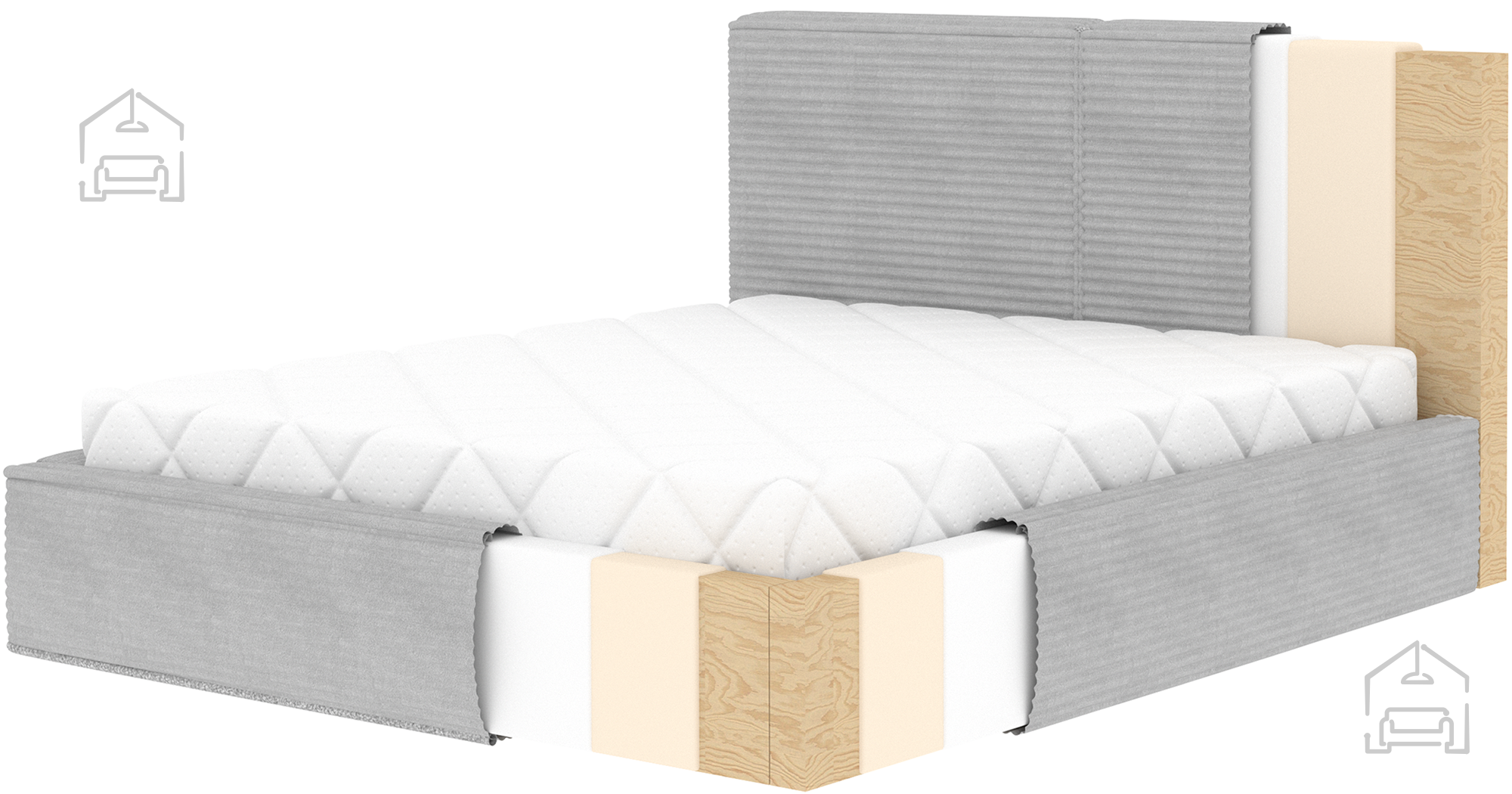 Model je zasnovan kot boxspring postelja, kar pomeni, da vključuje ležišče in letveno dno. Takšna konstrukcija izboljša zračenje in podaljša življenjsko dobo vzmetnice. Vzglavje je mehko oblazinjeno, notranje polnilo iz pene T2130 pa zagotavlja primerno oporo in udobje. Višina sedišča znaša približno 32 cm, kar omogoča udoben vstop in izstop iz postelje.