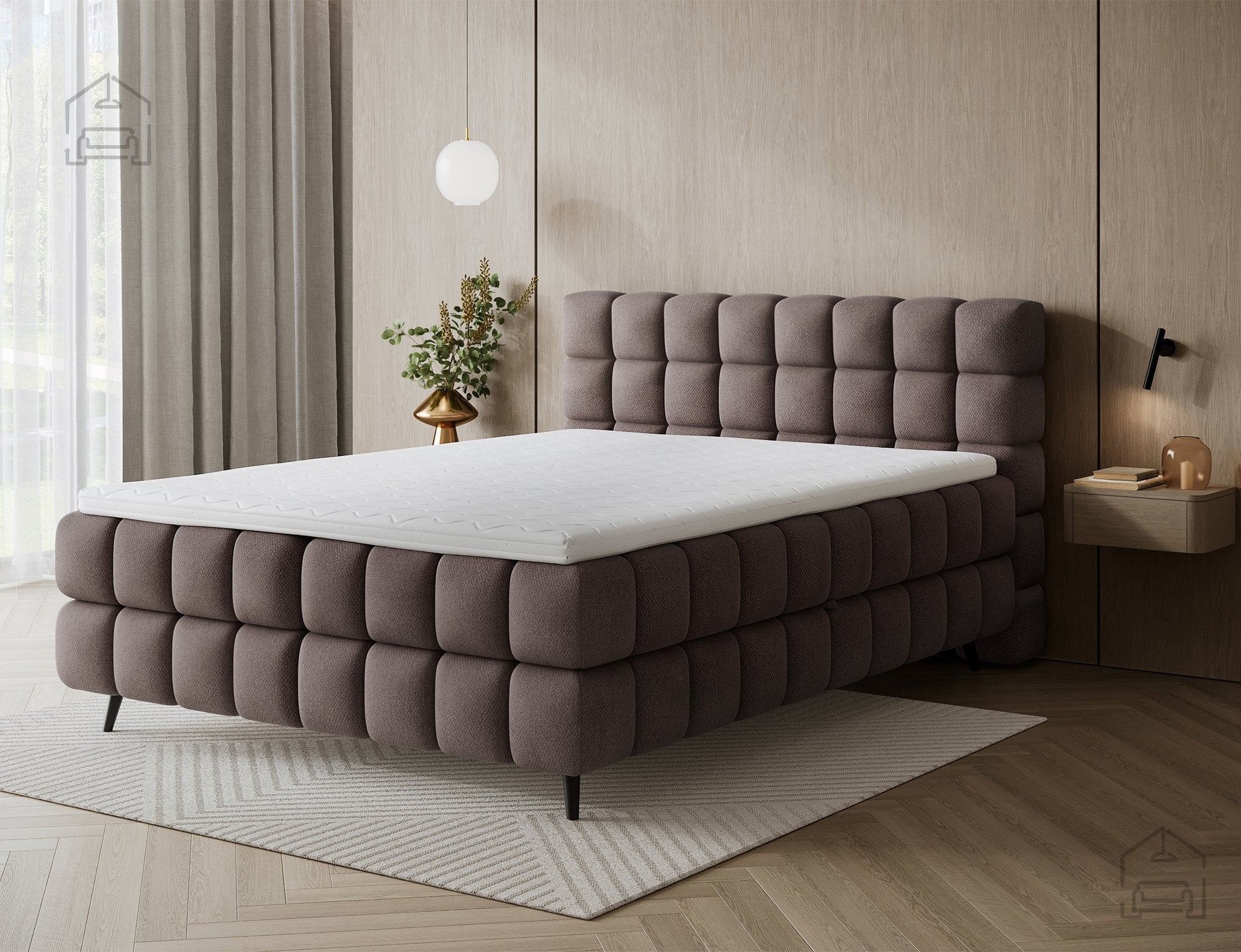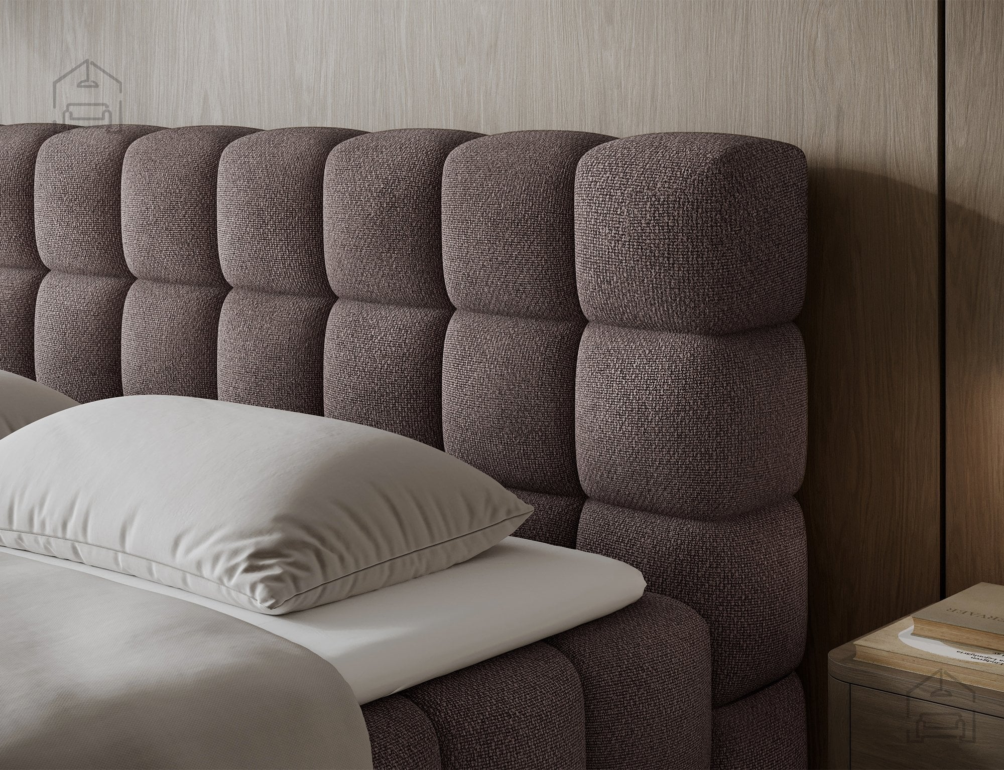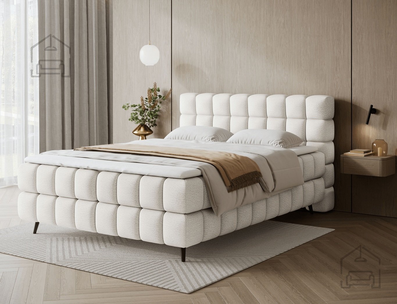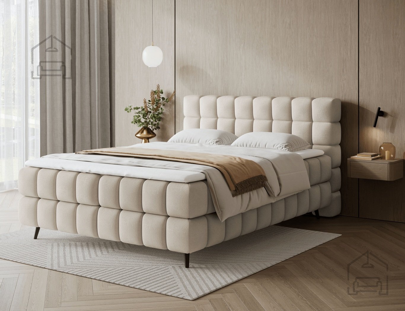 Osnova postelje je izdelana iz lesa, ki zagotavlja stabilnost in dolgo življenjsko dobo konstrukcije. Posteljni okvir je tapeciran v kakovostno tkanino, prikazano na sliki v odtenku Tonall 22. Ta tekstura doda prostoru občutek topline in sodobne elegance. Zahvaljujoč premišljeni kombinaciji materialov in detajlov se Sabeno lepo poda tako v minimalistične kot tudi v klasično opremljene spalnice.