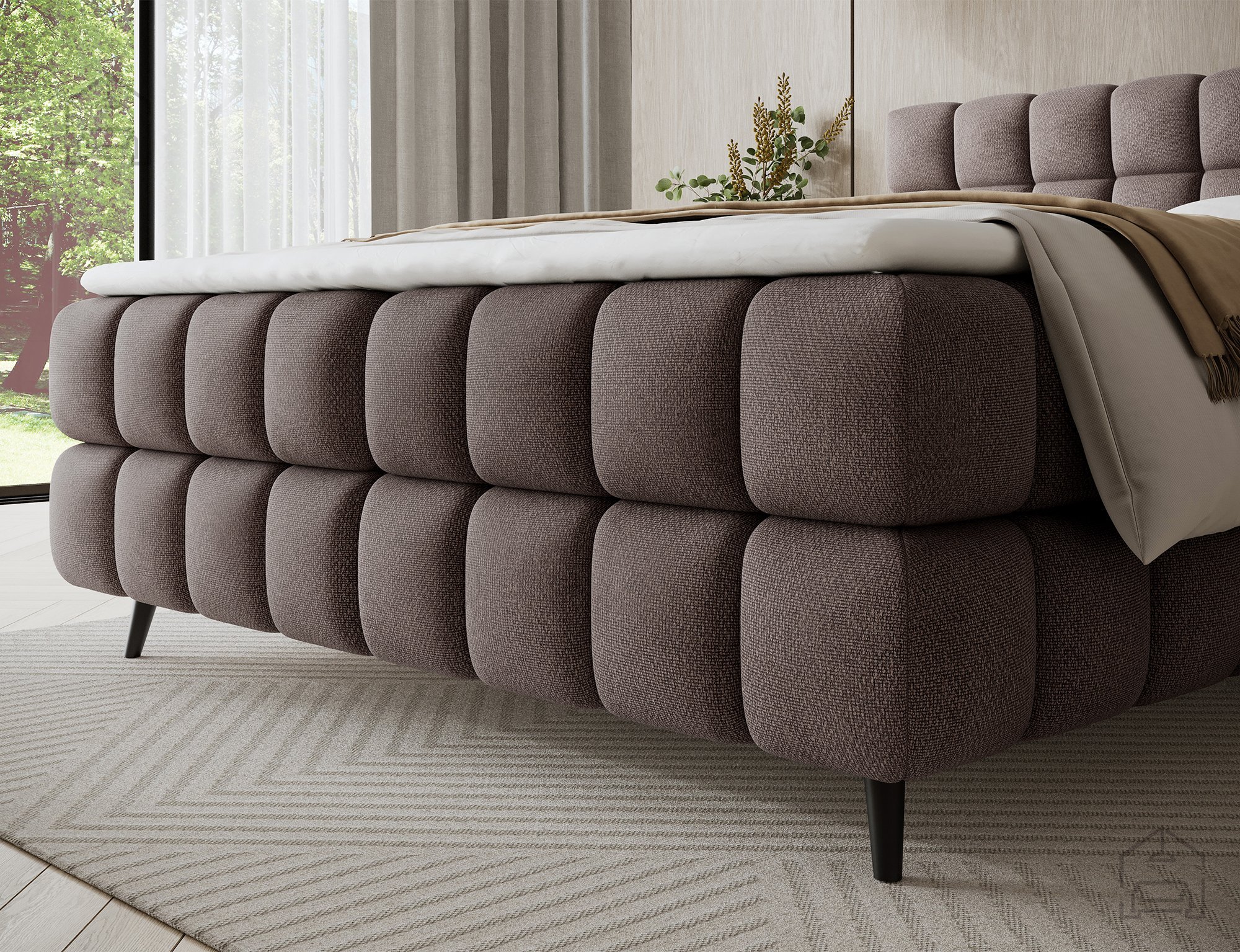 Sabeno stoji na elegantnih lesenih nogicah v črni barvi, ki konstrukciji dodajo vizualno lahkotnost in stabilnost. Njihova višina omogoča enostavno čiščenje prostora pod posteljo, kar je pomembno za vsakodnevno higieno in vzdrževanje spalnice. Kombinacija črnih nogic in mehke tkanine v izbranem odtenku ustvari uravnotežen kontrast, ki doda prostoru pridih sodobne estetike.