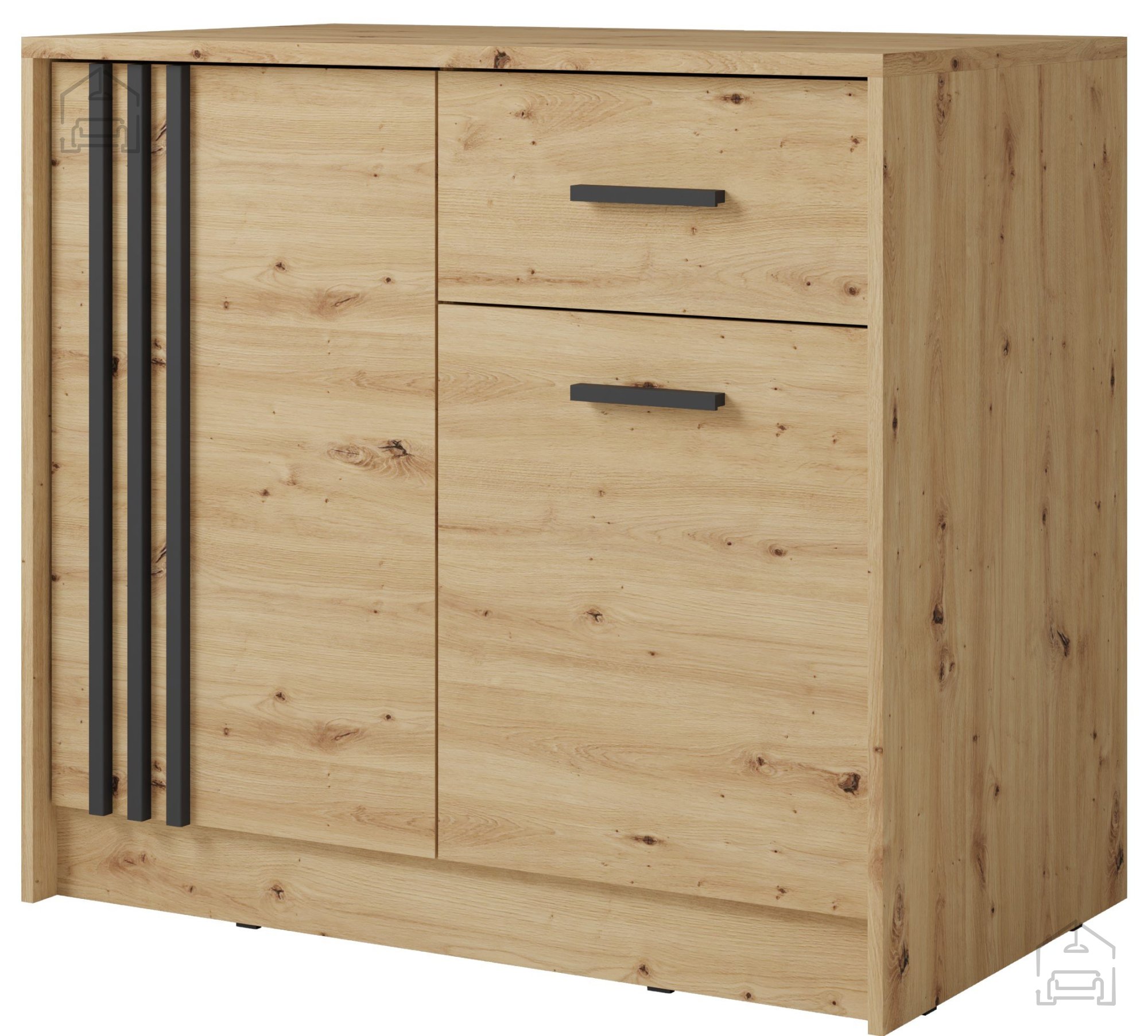 Izdelek je oblikovan v barvi hrast artisan, ki prinaša občutek naravne topline in domačnosti. Ta odtenek se lepo ujema s kontrastnimi črnimi detajli, kar daje komodi značaj sodobnega pohištva z industrijskim pridihom. Kombinacija teh barv omogoča enostavno usklajevanje z drugimi kosi notranje opreme – tako z lesenimi kot kovinskimi elementi.