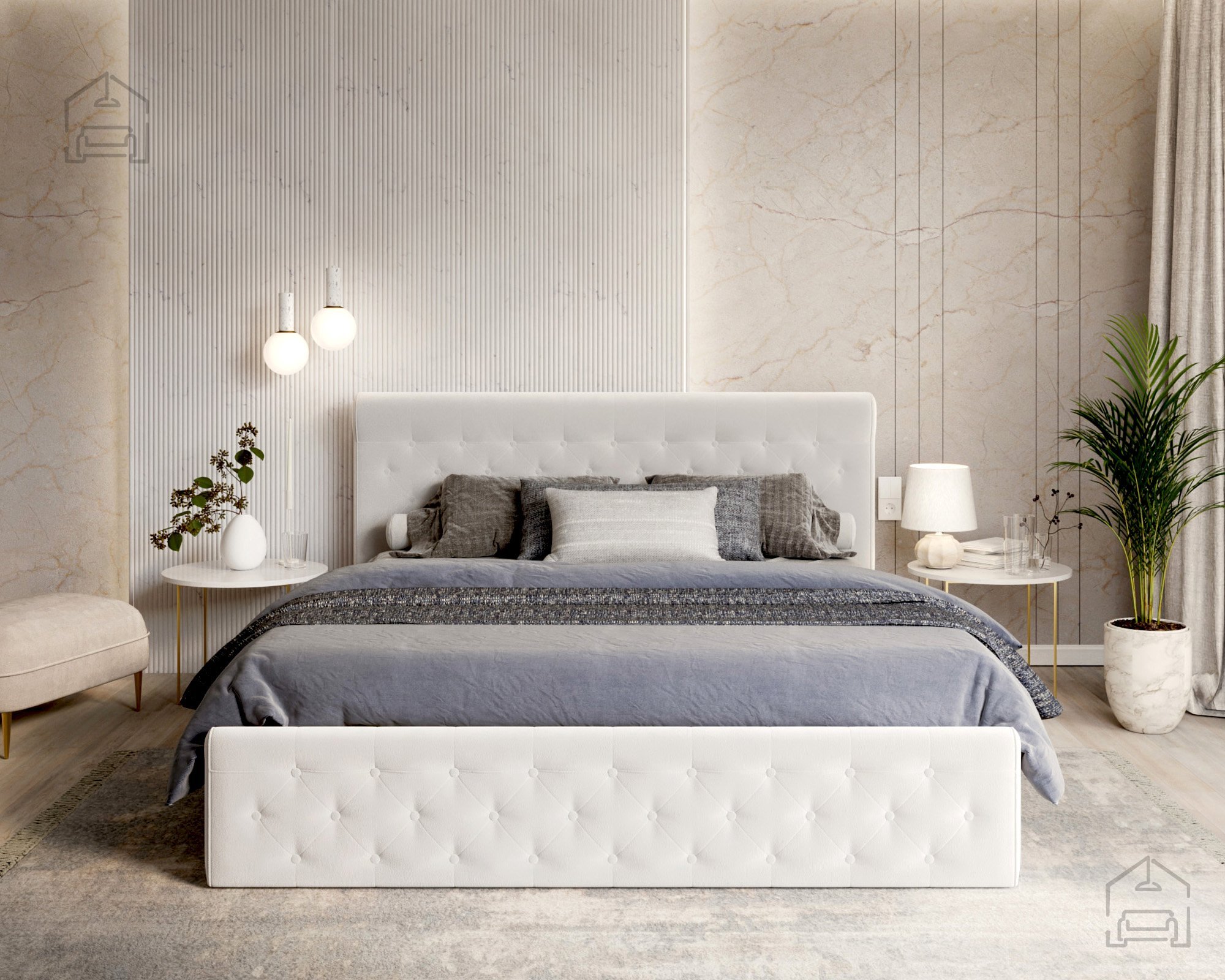 Okvir postelje je tapeciran, kar ji daje občutek mehkobe in topline. Na voljo je v več barvah in različnih tkaninah, da se lahko harmonično zlije z obstoječo notranjo opremo. Vodoravno prešito vzglavje in sprednji del postelje dodajata vizualno strukturo in eleganco, hkrati pa ponujata udobno oporo pri branju, gledanju televizije ali sproščanju pred spanjem.