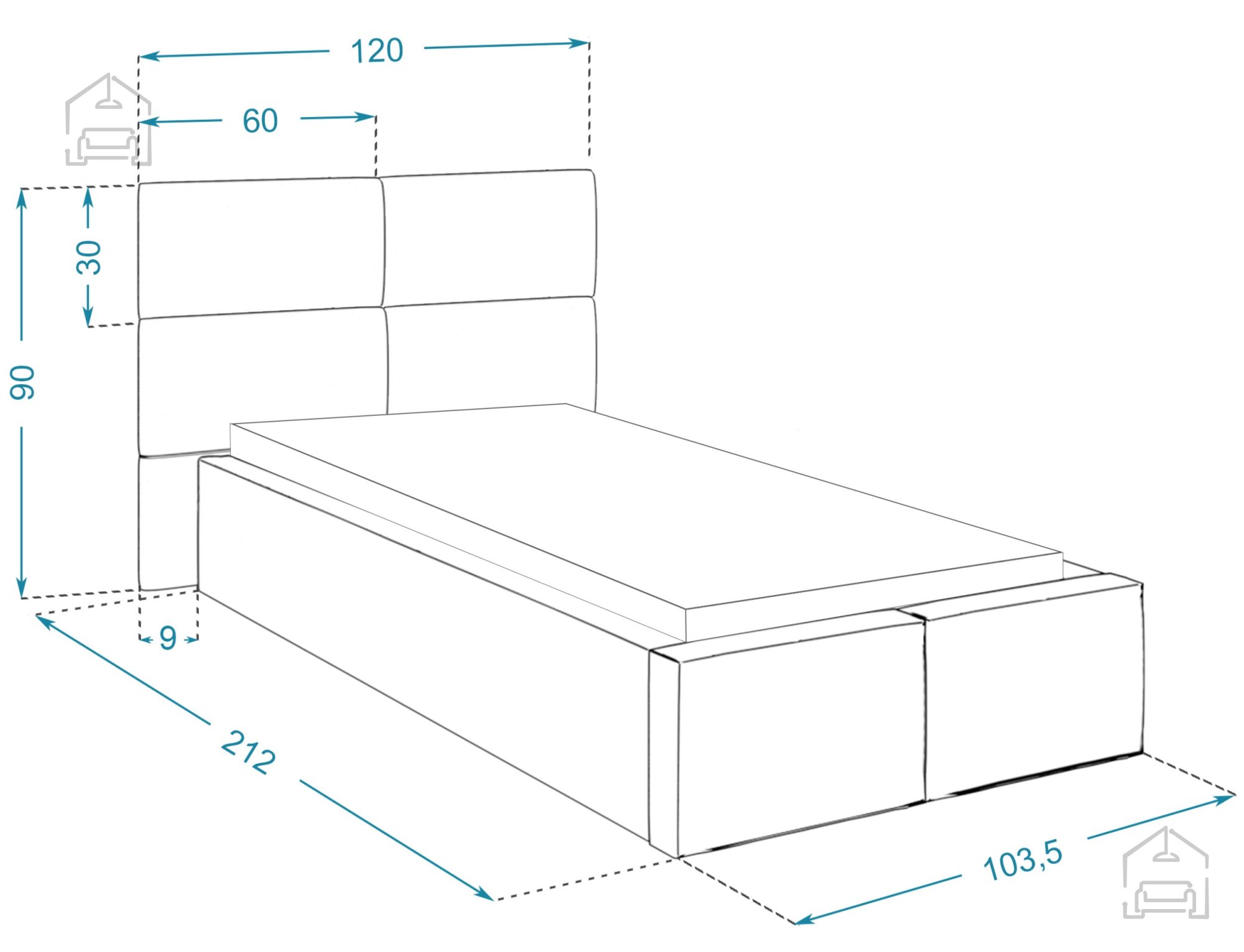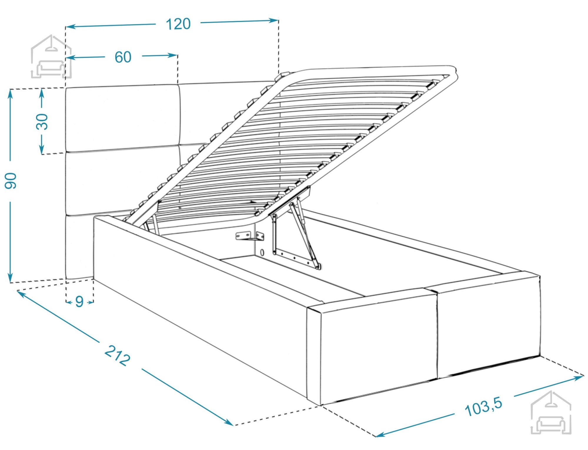• Dimenzije postelje: širina 103 cm, globina 212 cm, višina 90 cm