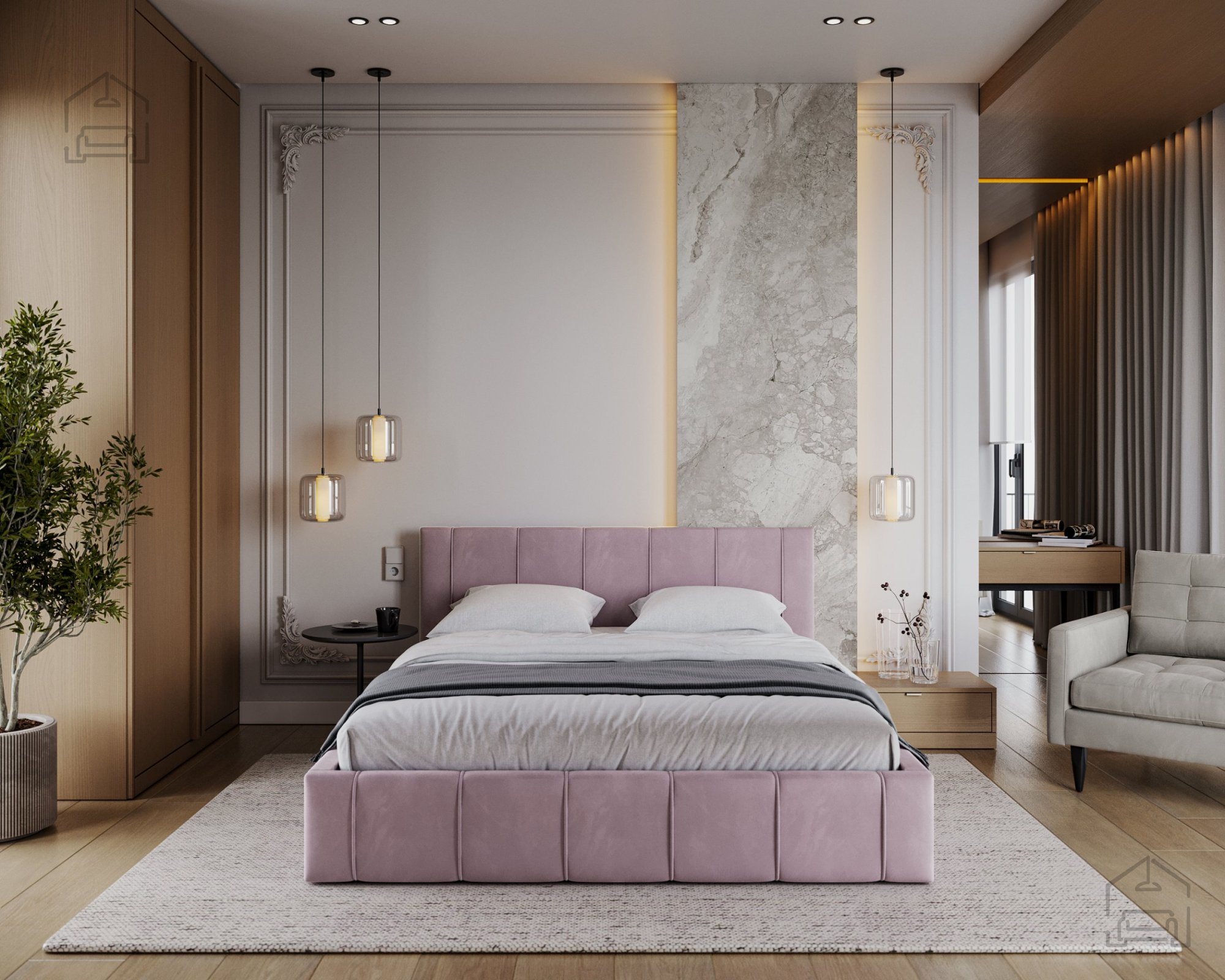 Vodoravno prešito vzglavje in sprednji del postelje dodajata pridih prefinjenosti in vizualne urejenosti. Takšen dizajn ni le estetsko privlačen, temveč tudi praktičen – mehko vzglavje omogoča udobno naslanjanje pri branju, gledanju televizije ali jutranjem srkanju kave. Ne glede na izbrano barvo tkanine prešiti šivi ustvarjajo subtilno, a opazno strukturo, ki prostoru daje značaj.