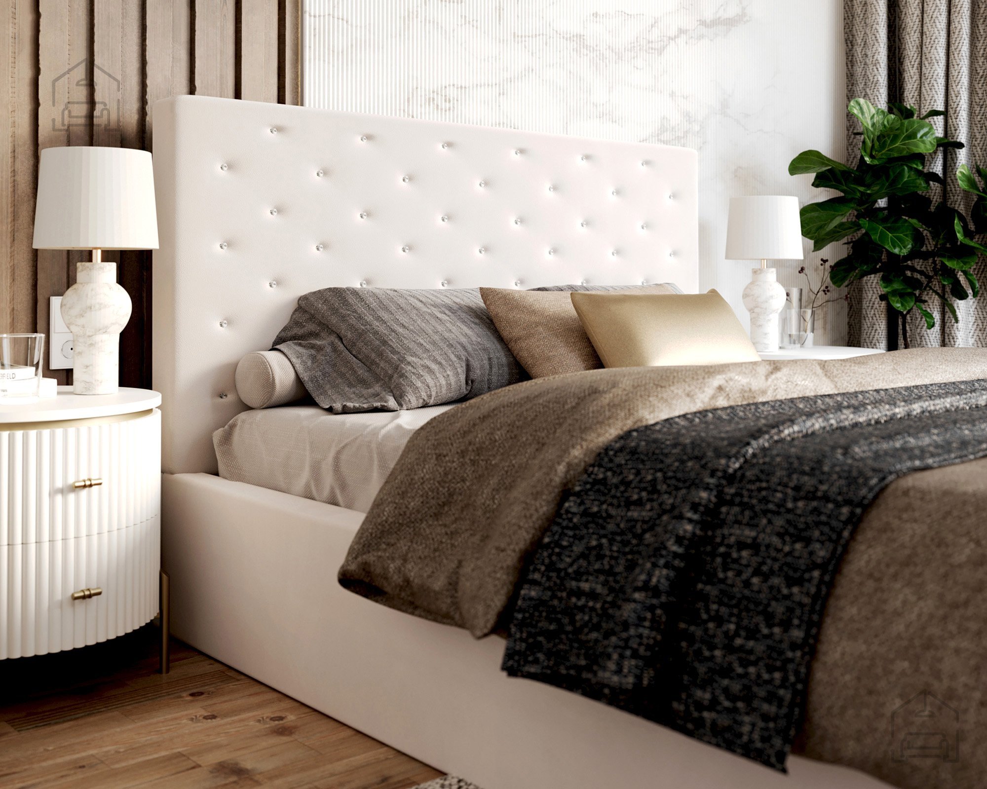 Okvir postelje Passion je tapeciran in dodatno ojačan z notranjo leseno ter iveralno osnovo, kar zagotavlja stabilnost in dolgo življenjsko dobo. Polnilo iz pene T-25 prispeva k prijetnemu občutku mehkobe, hkrati pa ohranja obliko tudi po dolgotrajni uporabi. Vzglavje in sprednji del postelje sta vodoravno prešita, kar ustvarja občutek urejenosti in dodelanosti. Takšen detajl daje postelji značaj in se lepo ujema z različnimi teksturami posteljnine ali dekorativnih blazin.