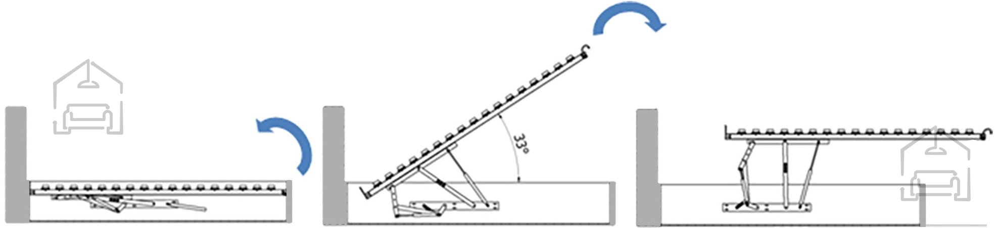 Postelja Justin se ponaša z izjemno praktičnim sistemom dviga ležišča. Dvižni mehanizem je lesen in omogoča, da se ležalna površina dvigne vzporedno s posteljnim okvirjem, kar omogoča lahek dostop do shranjevalnega prostora. Ta prostor je velik in sega vse do tal, zato je primeren za shranjevanje posteljnine, odej ali sezonskih oblačil. Zaradi zasnove, pri kateri dno predala neposredno počiva na tleh, lahko v njem brezskrbno hranite tudi težje predmete, ne da bi tvegali poškodbo konstrukcije.