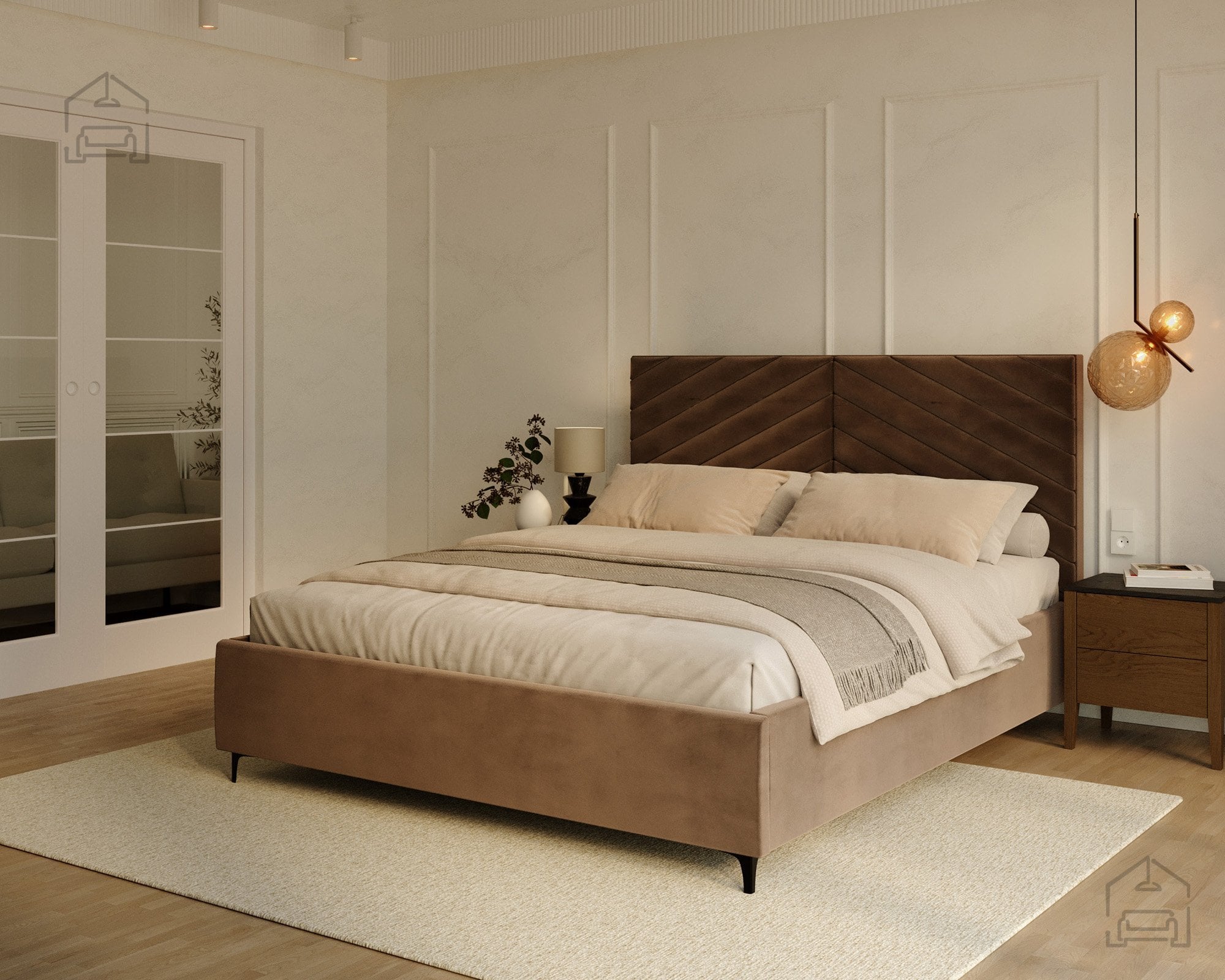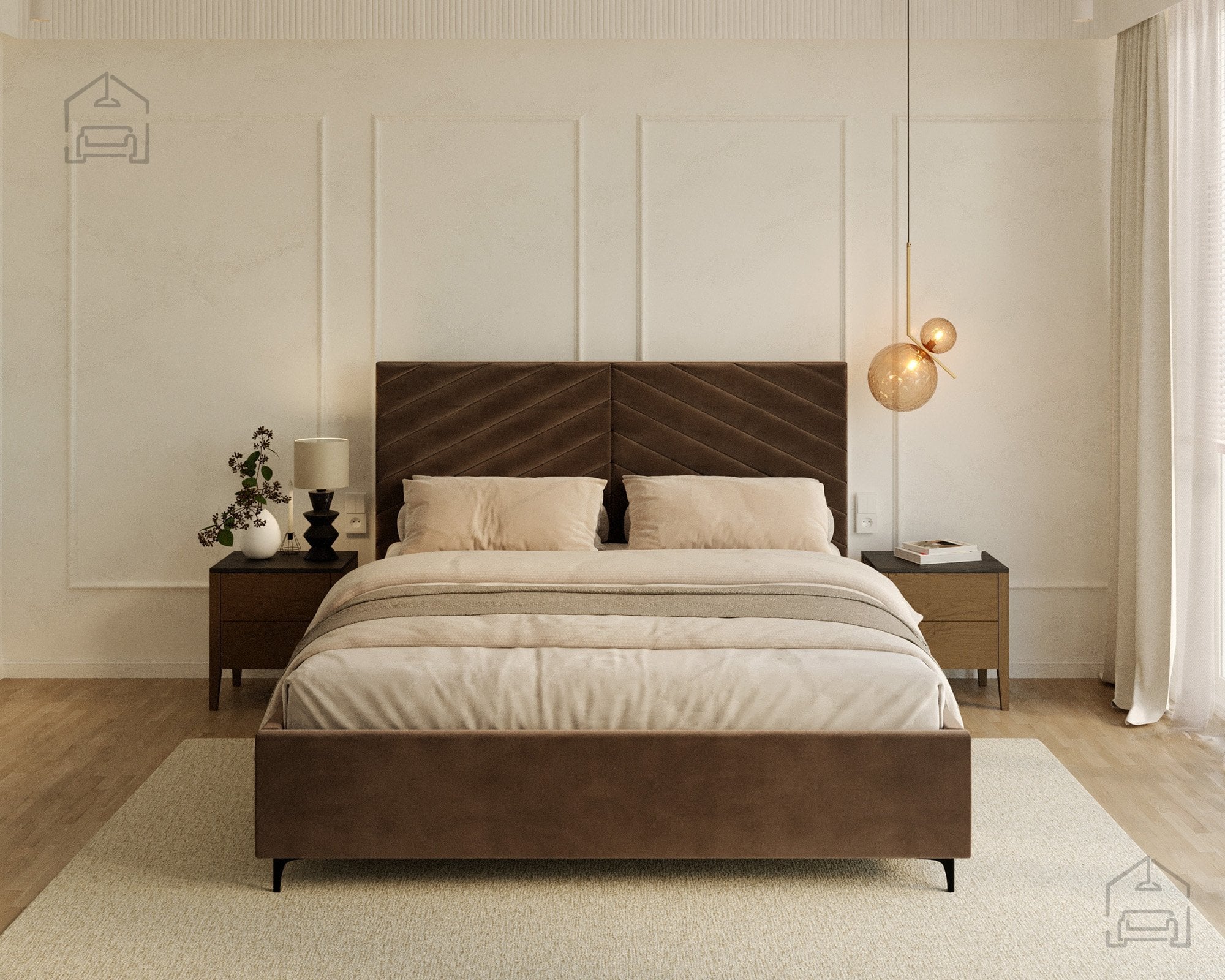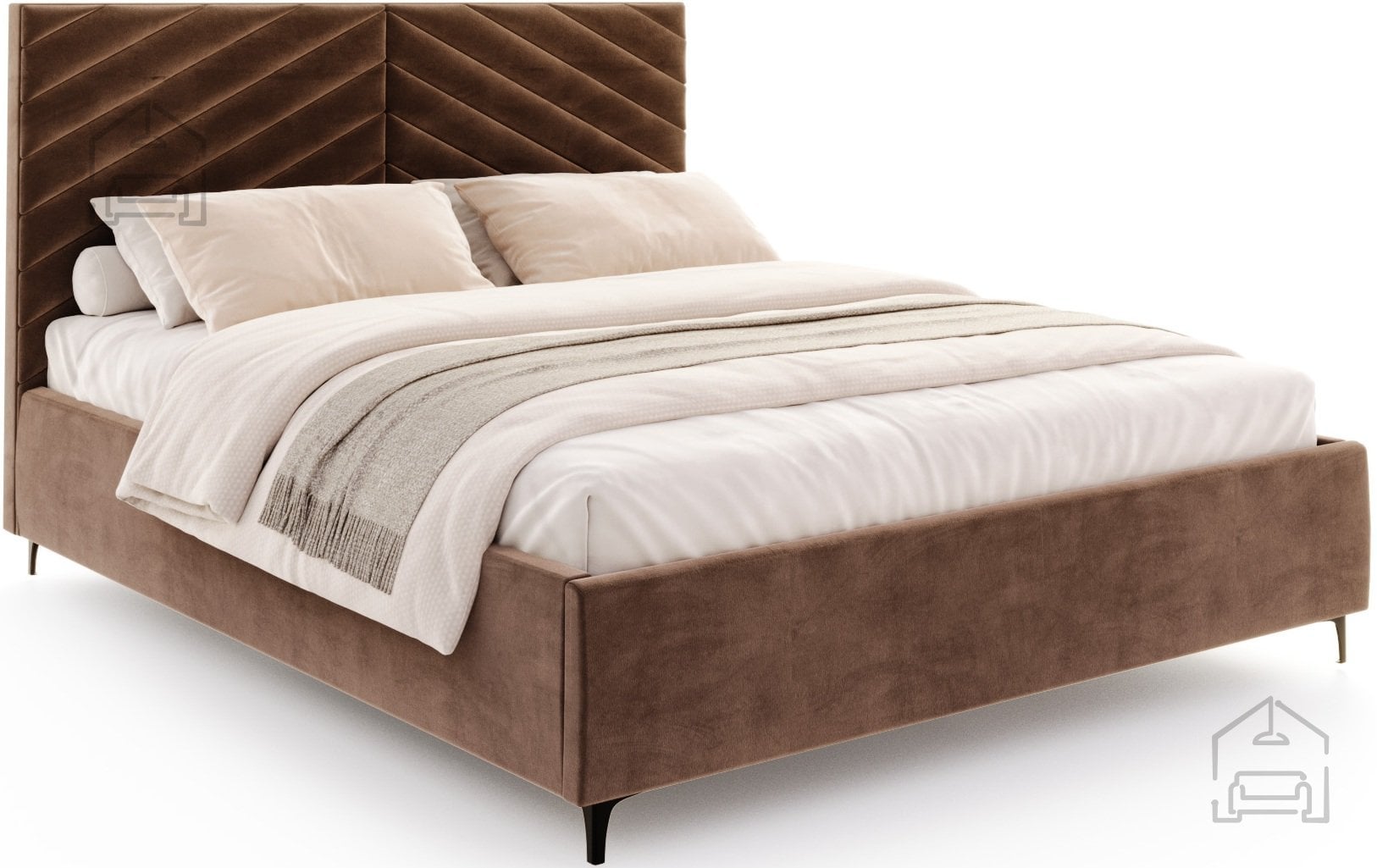 Oblazinjenje je možno izbrati v različnih barvah in vrstah tkanin, kar omogoča prilagoditev videza spalnici. Tkanina Trinity Brown, predstavljena na sliki, združuje toplino naravnih tonov in mehko teksturo, ki deluje prijetno na dotik. Kombinacija s subtilnimi dekorativnimi nogicami daje postelji pridih lahkotnosti in prefinjenosti. Vse komponente so izbrane z mislijo na dolgo življenjsko dobo in enostavno vzdrževanje.