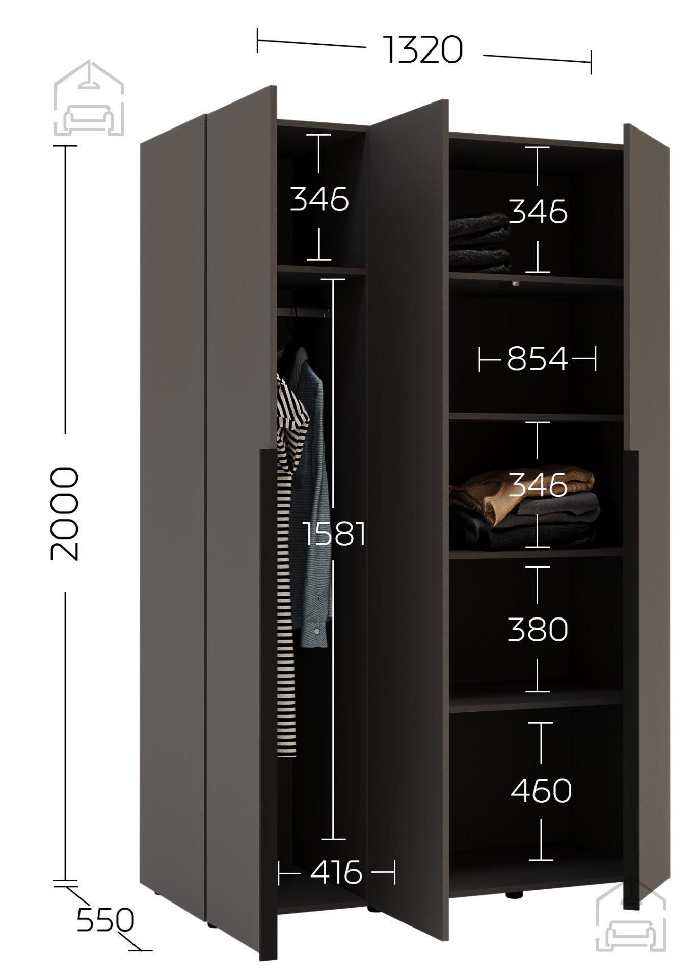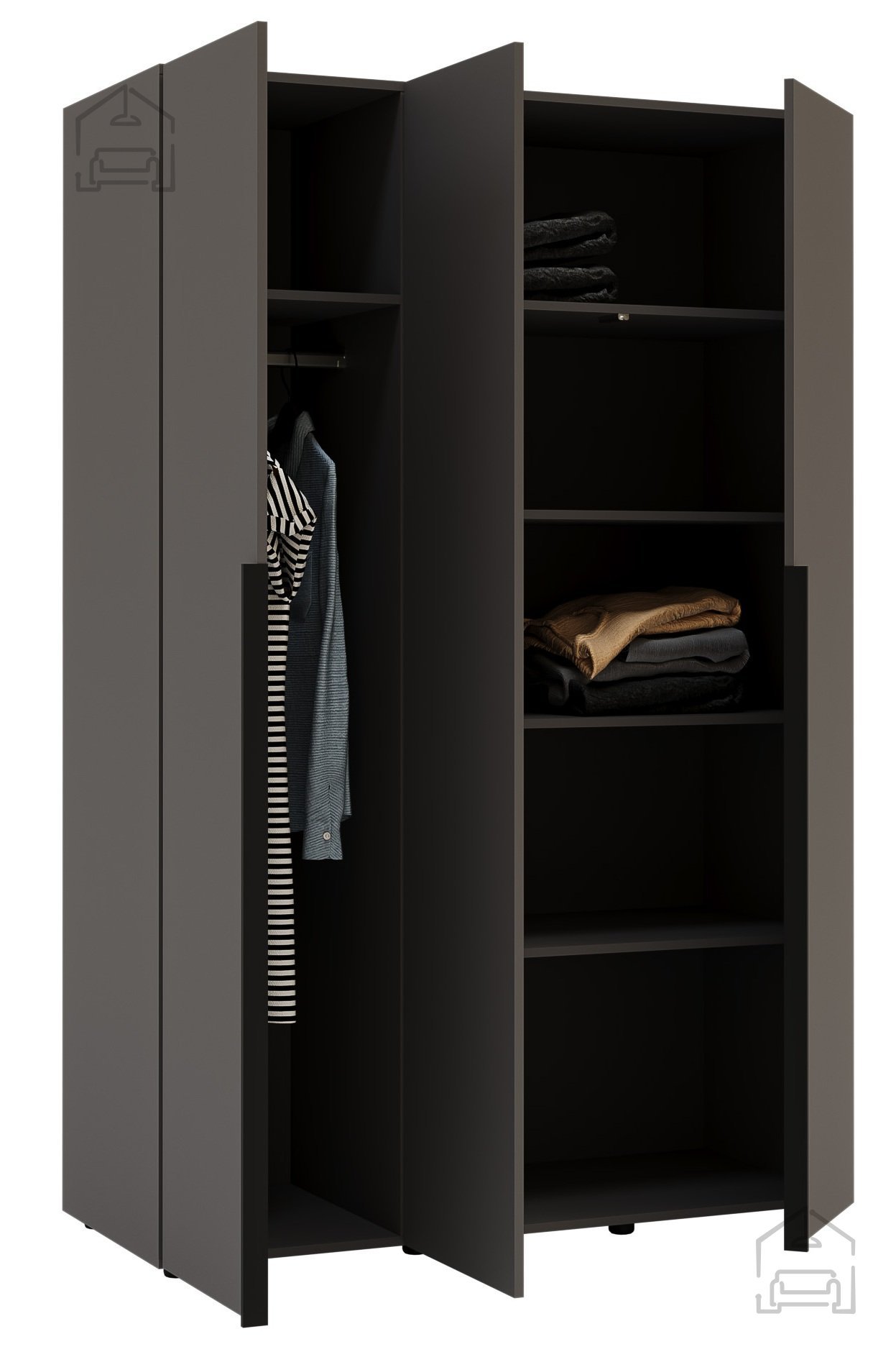 Posebna prednost garderobne omare je prefinjena grafitno siva barva, ki se odlično ujema z različnimi stili notranje opreme. Minimalističen, a hkrati prestižen videz bo vašemu prostoru dodal pridih urejenosti in sodobnosti. Zaradi nevtralnega tona se omara harmonično sklada tako z naravnimi lesenimi toni kot tudi z bolj drznimi barvnimi kombinacijami, zato jo lahko enostavno vključite v obstoječo opremo doma.