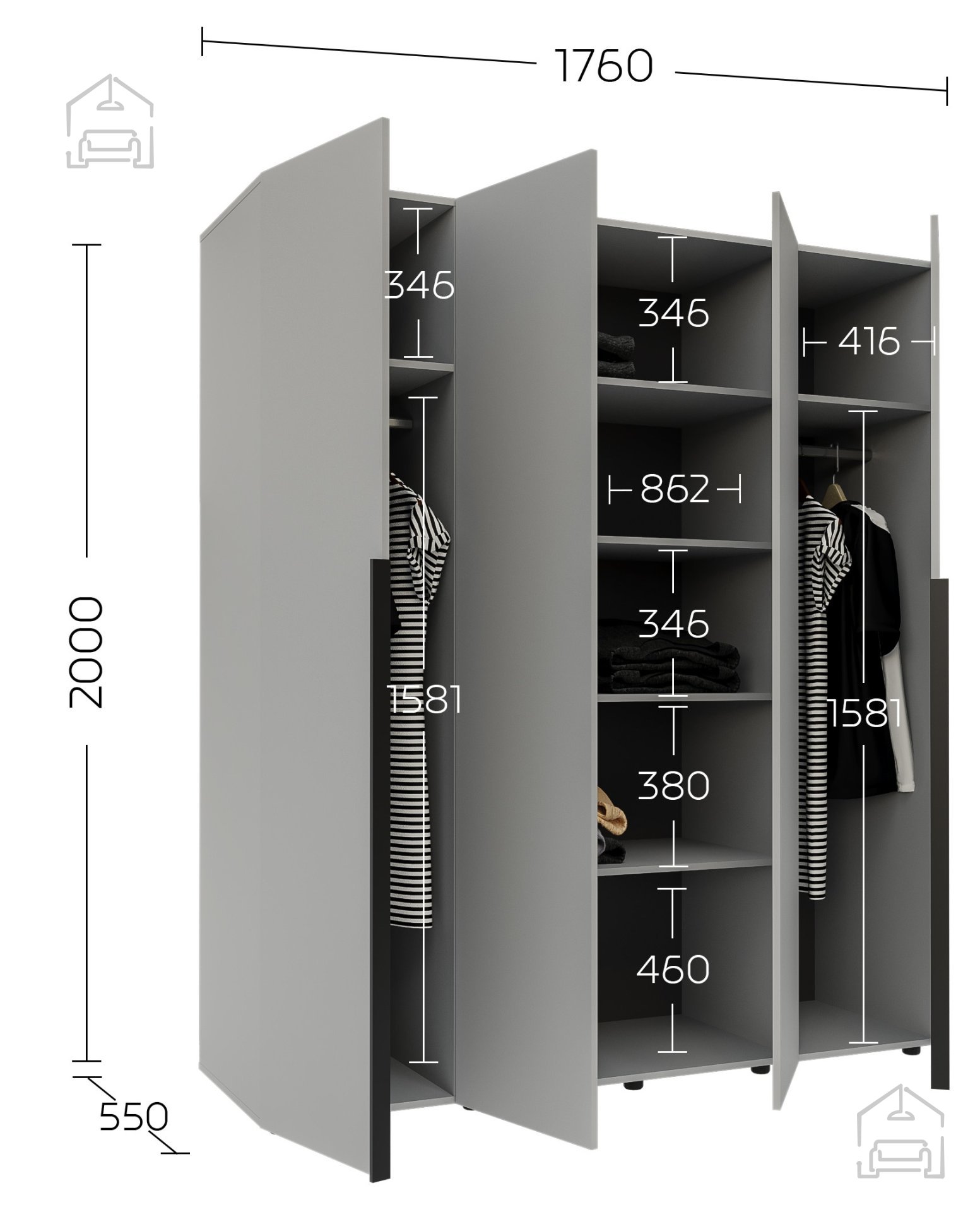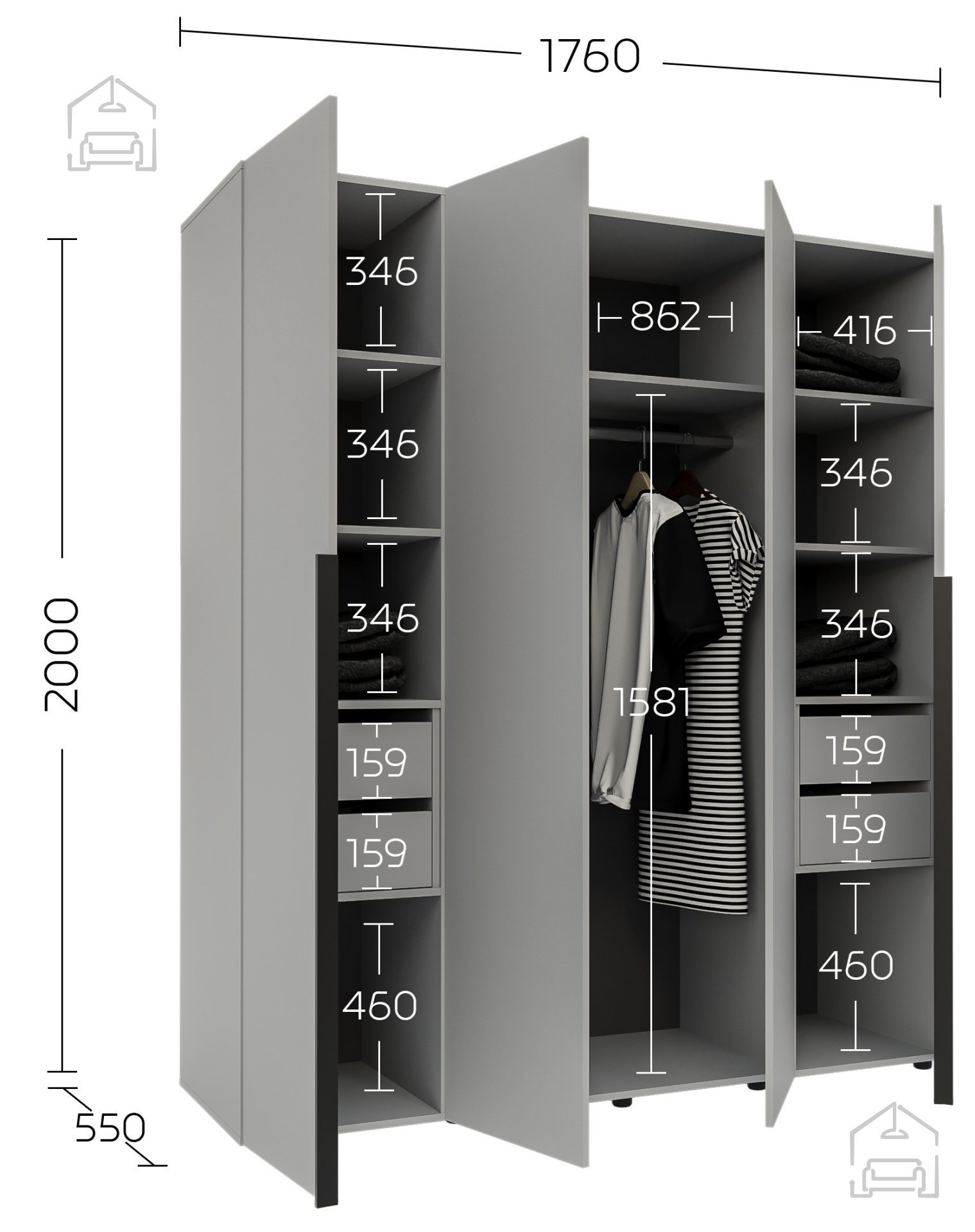 Omara s štirimi vrati ponuja obilico prostora za shranjevanje oblačil, dodatkov in drugih predmetov. V notranjosti se nahajajo prostorne police in obešalni del, kar omogoča optimalno razporeditev garderobe glede na vaše potrebe. Zaradi premišljene notranje strukture boste imeli vedno pregled nad vsebino, ne glede na to, ali gre za sezonska oblačila, obutev ali posteljnino. Dimenzije 176x55x200 cm ponujajo idealno razmerje med prostornostjo in kompaktnostjo, zato se omara lepo prilega tudi manjšim prostorom. Za tiste, ki si želijo še več prostora, je na voljo možnost dokupa zgornje omare ali dodatnih predalov – popolna rešitev za popolno prilagoditev vašim potrebam.