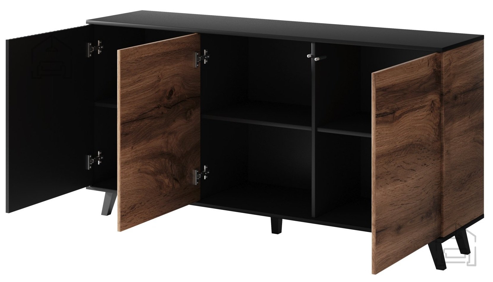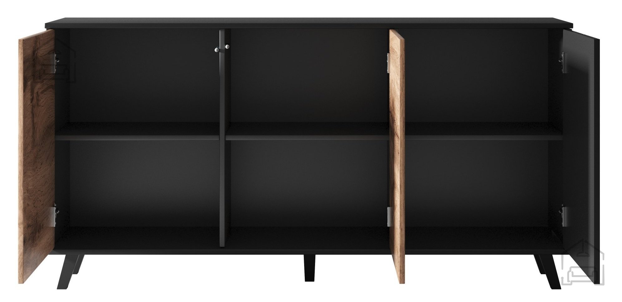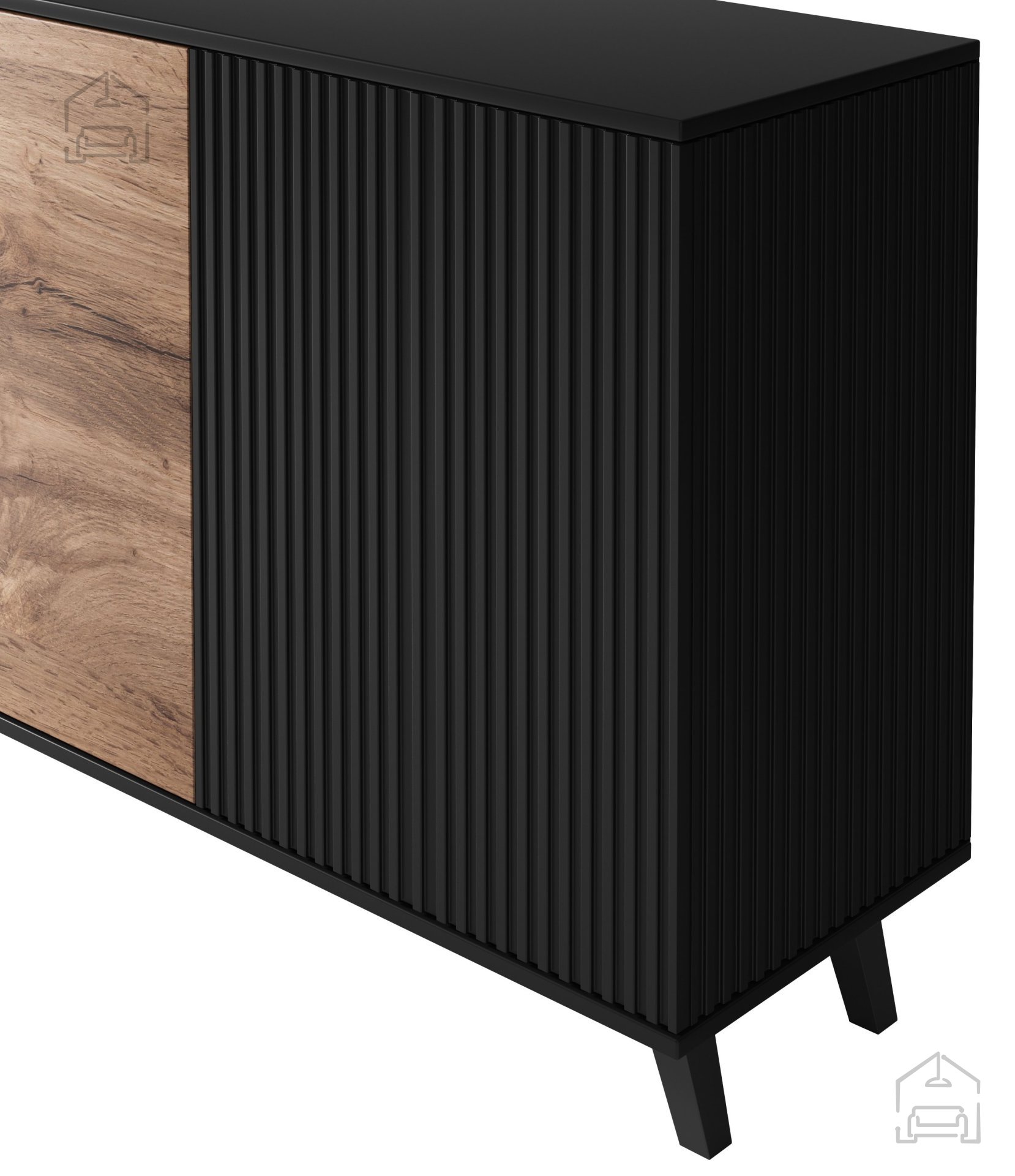 Komoda ima kompaktne, a prostorne dimenzije 160x40x82 cm, kar omogoča optimalno razporeditev prostora v dnevni sobi, jedilnici ali predsobi. Izdelana je iz furnirane pohištvene plošče, ki posnema naravno strukturo lesa hrasta votan. Površina je gladka, enostavna za čiščenje in odporna proti vsakodnevnim obremenitvam. Kovinski deli so prašno lakirani v črno barvo, kar zagotavlja dodatno zaščito pred praskami in obrabo ter daje celoti prefinjen, sodoben videz.