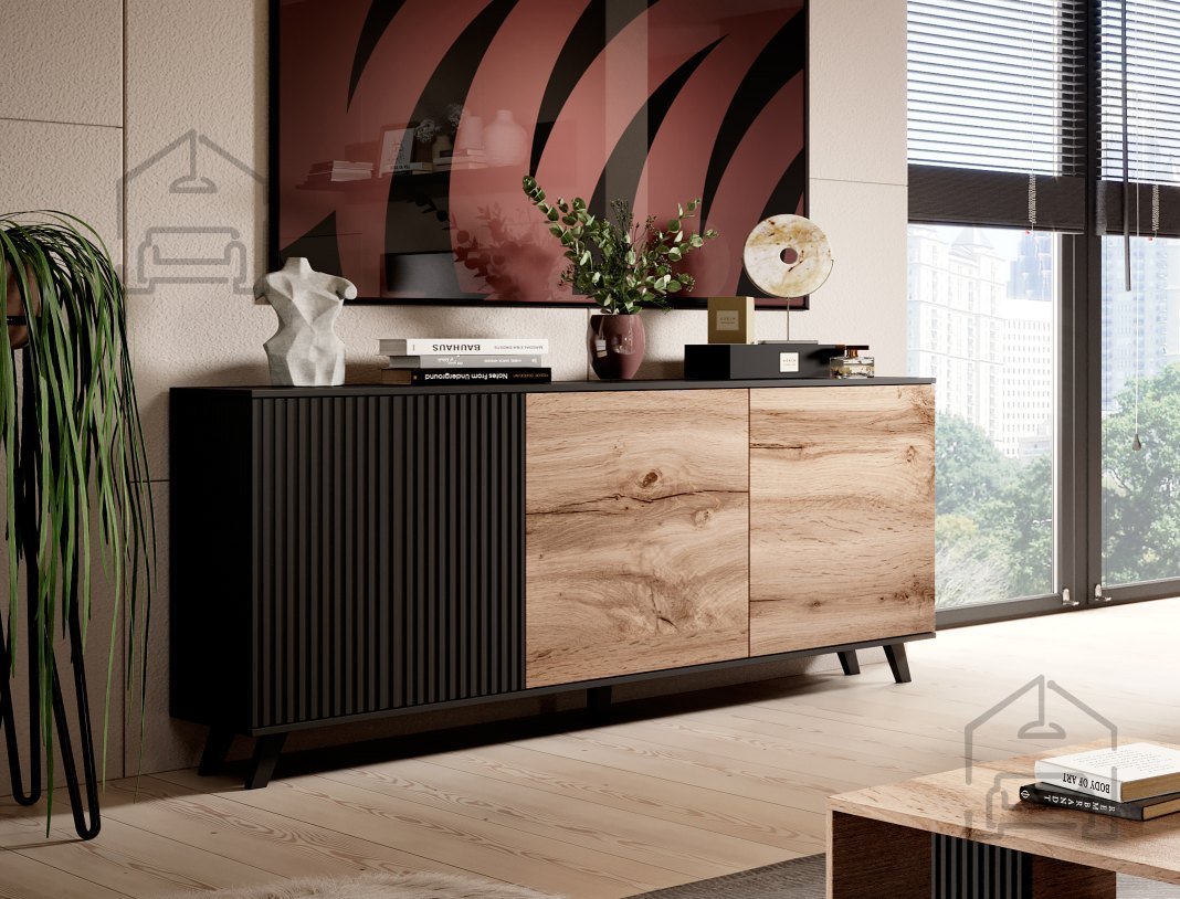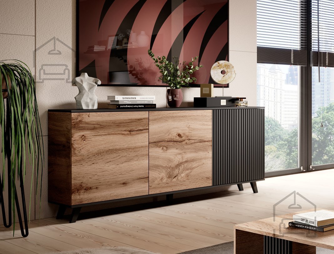 Barvna kombinacija hrasta votan in črne barve ustvarja kontrast, ki je hkrati topel in sodoben. Lesni ton daje občutek naravnosti in domačnosti, črna kovinska konstrukcija pa doda pridih industrijske elegance. Takšna kombinacija omogoča enostavno ujemanje z drugimi kosi pohištva in dekorativnimi elementi v prostoru. Komoda se lepo poda k minimalističnim belim stenam, betonskim površinam ali tekstilom v nevtralnih tonih.