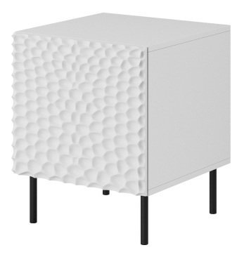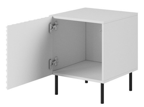 Kombinacija bele barve in črnih kovinskih nog ustvarja subtilen kontrast, ki poudarja sodoben značaj omaric. Zaradi kompaktnih mer se komplet odlično prilega tudi manjšim spalnicam ali garsonjeram, kjer je pomembna optimalna izraba prostora.