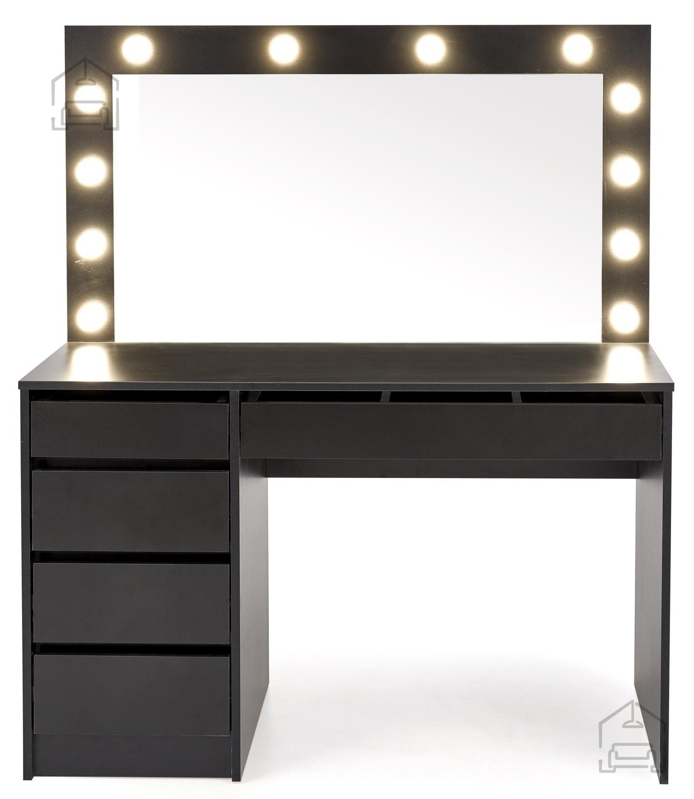 Miza za ličenje Hollywood XL – Halmar je elegantna in funkcionalna izbira za vse, ki želijo ustvariti profesionalno osvetljen prostor za ličenje v udobju svojega doma. Z dimenzijami 120×55×140 cm nudi dovolj prostora za shranjevanje kozmetike, pripomočkov in dodatkov, hkrati pa s svojim sodobnim dizajnom v črni barvi poudari prefinjenost vsake spalnice ali garderobne sobe. Izdelana je iz kakovostne pohištvene plošče, prevlečene z dekorativno folijo, kar zagotavlja trpežnost, enostavno čiščenje ter obstojnost barve skozi čas. LED sistem okoli ogledala poskrbi za optimalno osvetlitev, ki omogoča natančno nanašanje ličil v vseh svetlobnih pogojih.