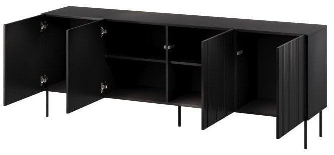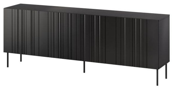 Ohišje komode je izdelano iz laminirane plošče debeline 16 mm, ki zagotavlja stabilnost ter odpornost proti praskam in obrabi. Fronte iz MDF plošč debeline 16 mm krasijo subtilni vidni utori, ki dajejo pohištvu prefinjeno teksturo in sodoben videz. Površina v črni barvi je univerzalna in se zlahka ujema z različnimi barvnimi kombinacijami in slogom notranje opreme – od minimalističnega do industrijskega.