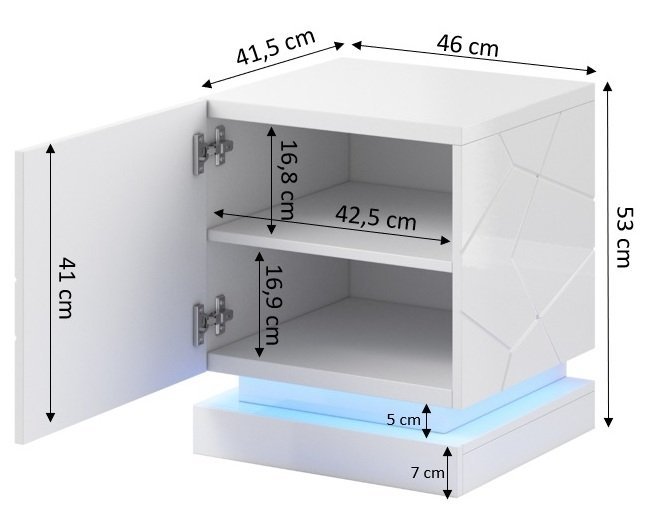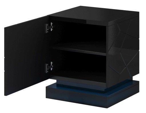Posebnost kompleta je možnost dodatne osvetlitve. Izbirate lahko med modro ali RGB osvetlitvijo, ki se naroča posebej. Svetlobni učinek poskrbi za prijetno atmosfero v spalnici, še posebej v večernih urah. Prižgana osvetlitev poudari sijajno površino in subtilno osvetli okolico, kar ustvari občutek topline in udobja.