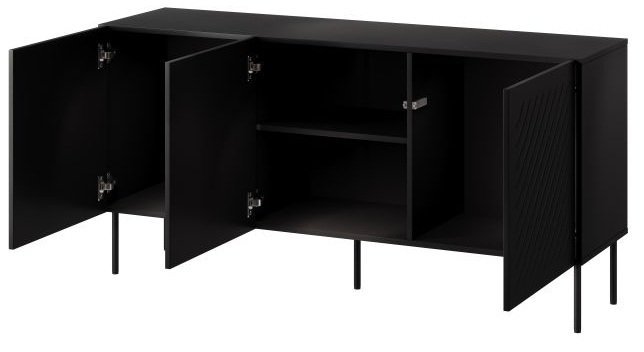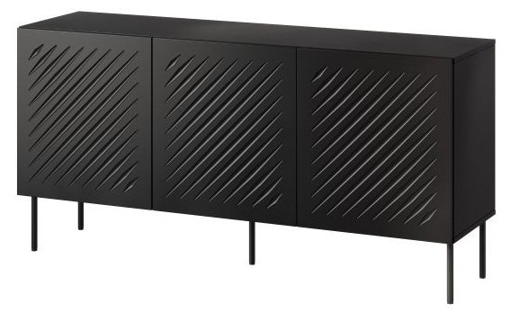 Ohišje komode je izdelano iz laminirane plošče debeline 16 mm, kar ji daje stabilnost in odpornost proti vsakodnevni uporabi. Fronte iz MDF plošče debeline 16 mm so dodatno oblikovane z vidnimi utori, ki ustvarjajo subtilno strukturo in dodajajo vizualno globino. Površina v črni barvi deluje razkošno in moderno, brezčasna barvna kombinacija pa omogoča enostavno usklajevanje z drugimi kosi pohištva v prostoru.