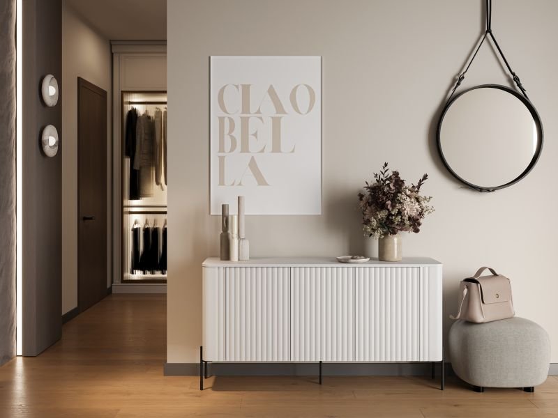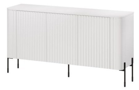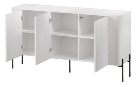 Bela barva fronte in ohišja omogoča, da se komoda Vera 150 cm brez težav vključi v različne barvne sheme prostora. Sijajna površina MDF front poudarja čistočo linij in svetlost prostora, medtem ko kontrastne črne kovinske noge dodajo sodoben značaj. Takšna kombinacija materialov in barv je posebej priljubljena v skandinavskem in minimalističnem slogu notranje opreme, kjer prevladujejo svetli toni in naravni materiali.