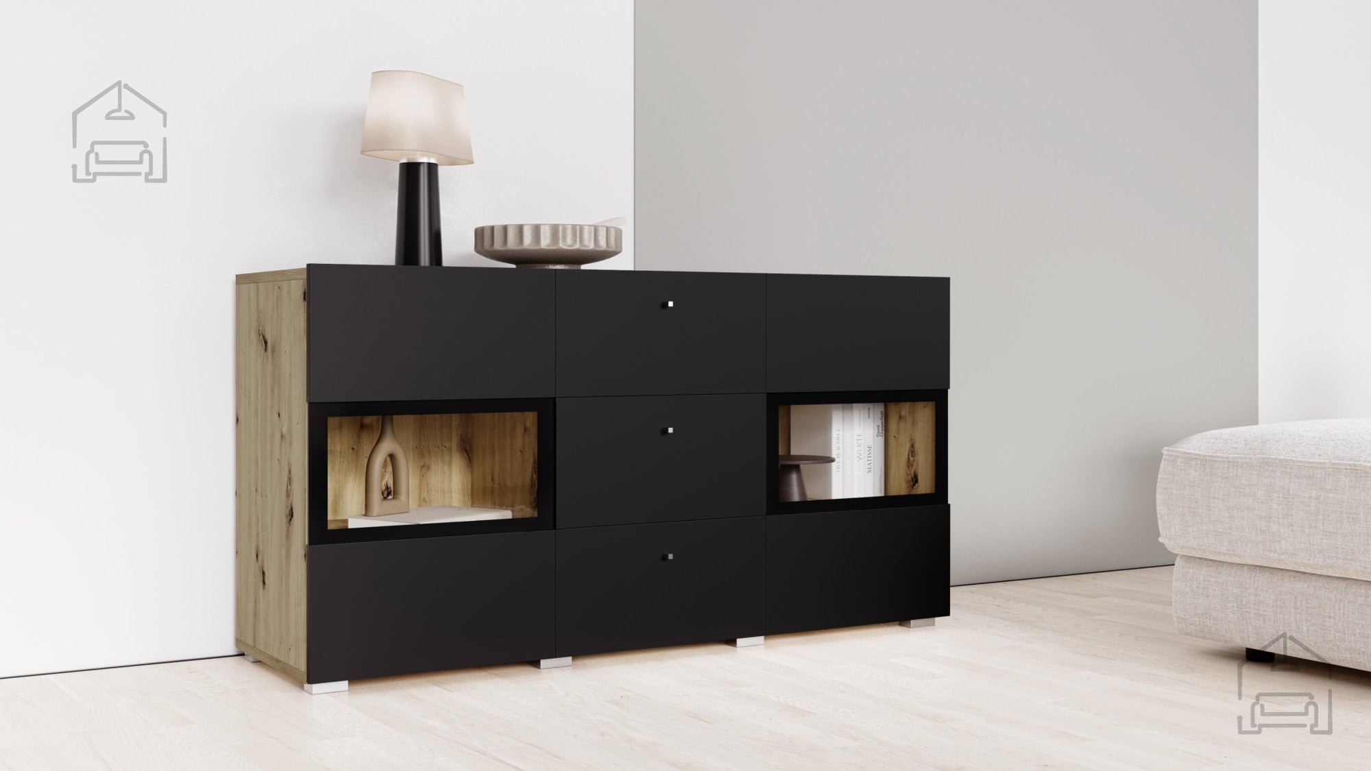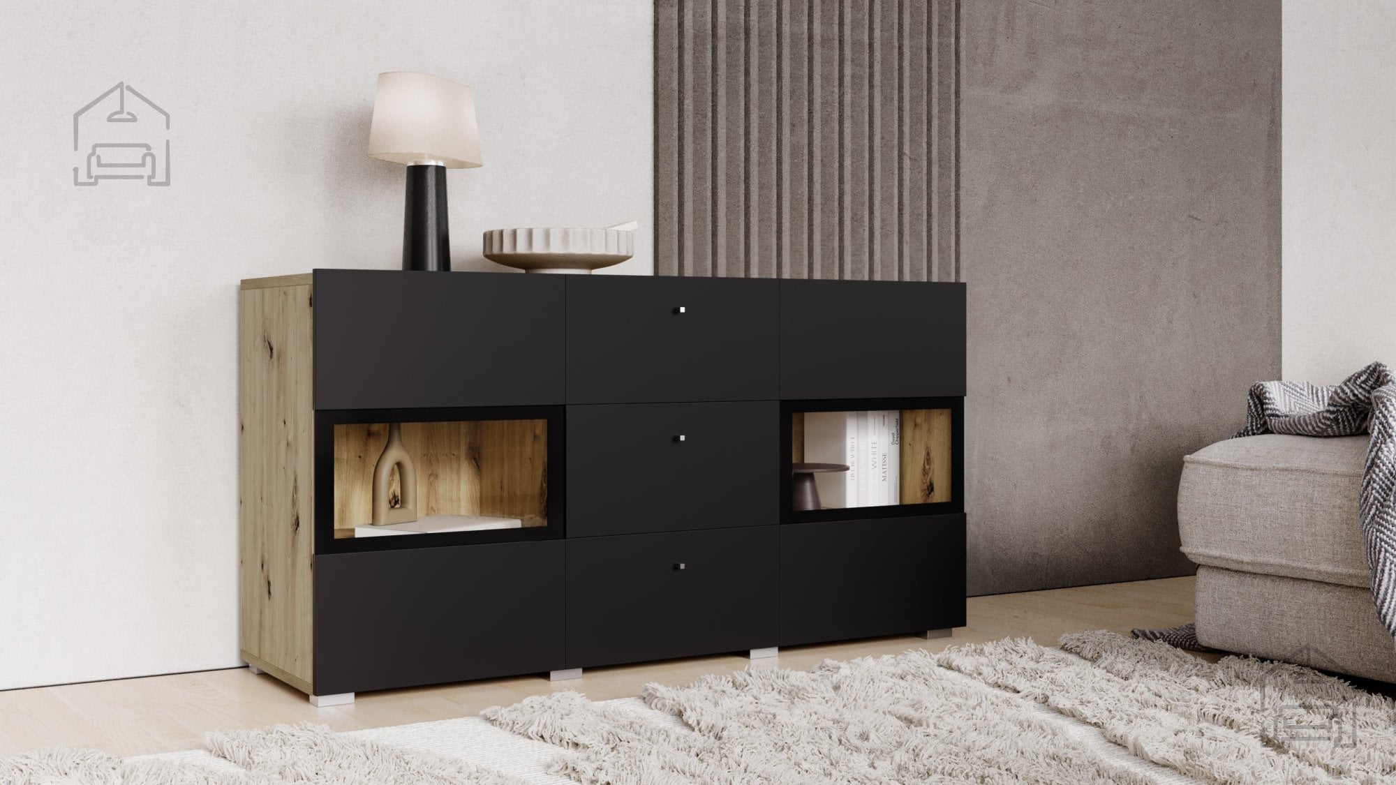 Barvna kombinacija toplega lesa artisan in elegantne črne supermat površine ustvarja sodobno, a brezčasno estetiko. Poudarjeni kontrasti prinašajo občutek dinamike in prefinjenosti, medtem ko minimalistične linije omogočajo, da komoda deluje skladno v različnih interierjih – od modernih do klasično urejenih prostorov. Elegantni ročaji in čiste linije poudarjajo funkcionalni značaj izdelka.