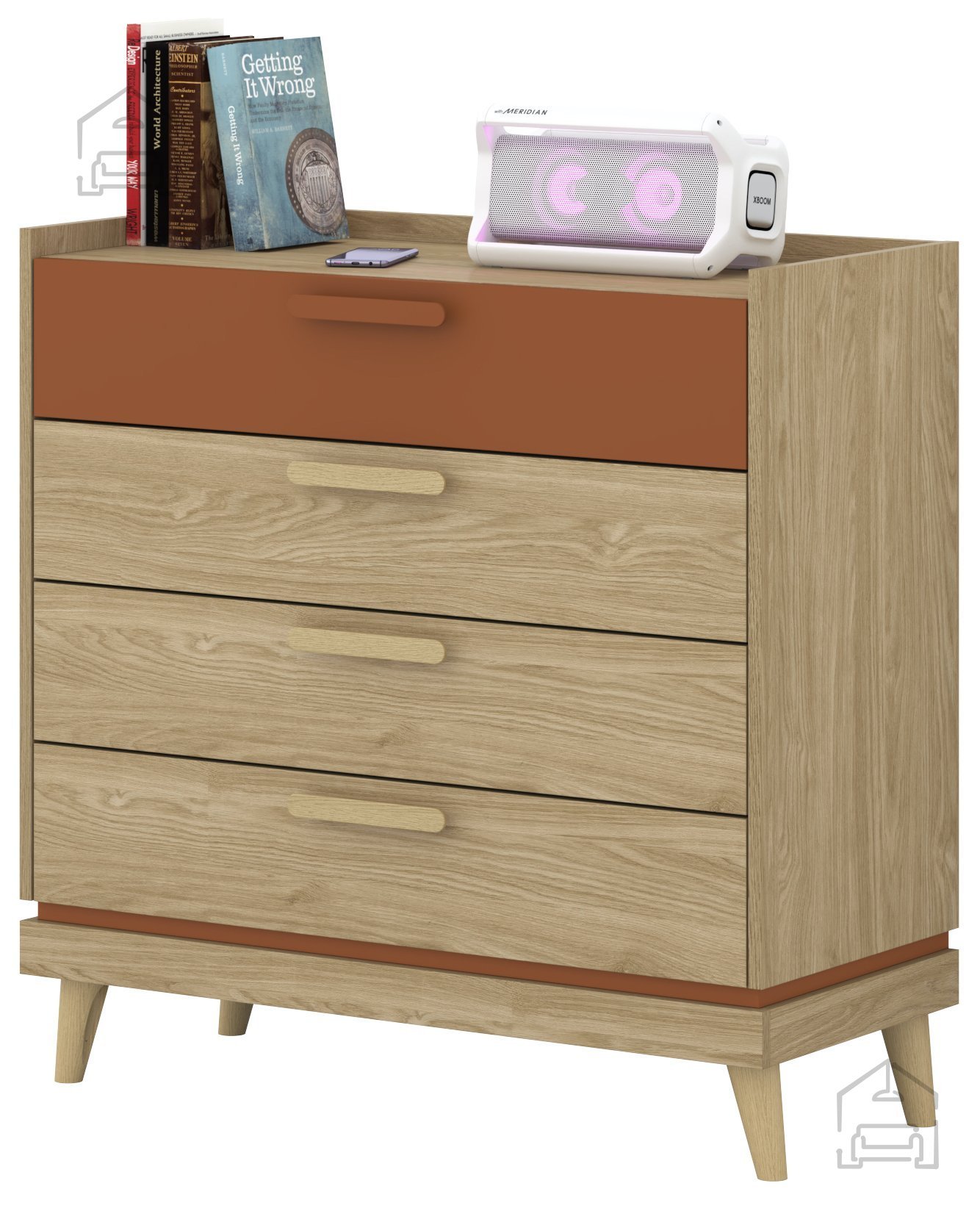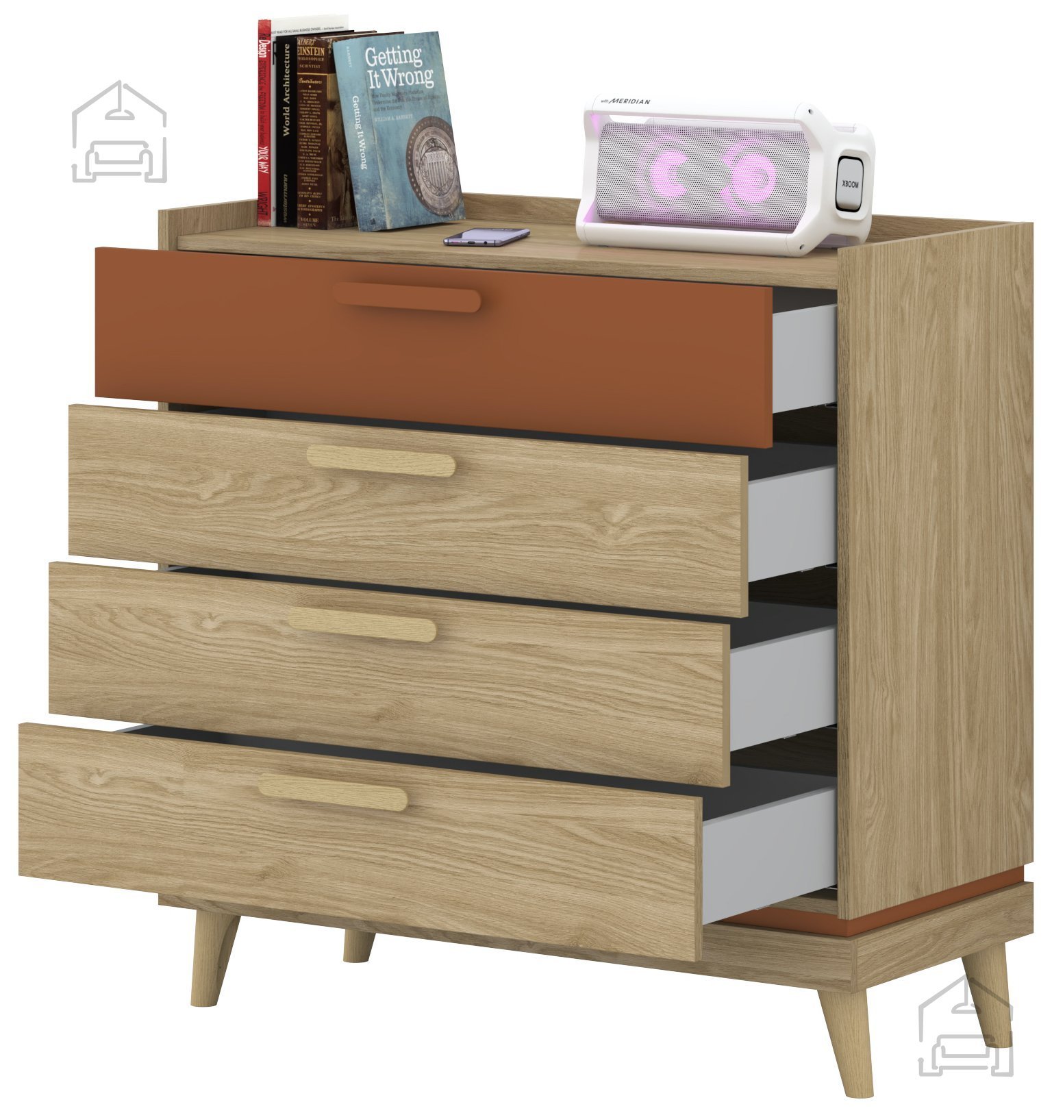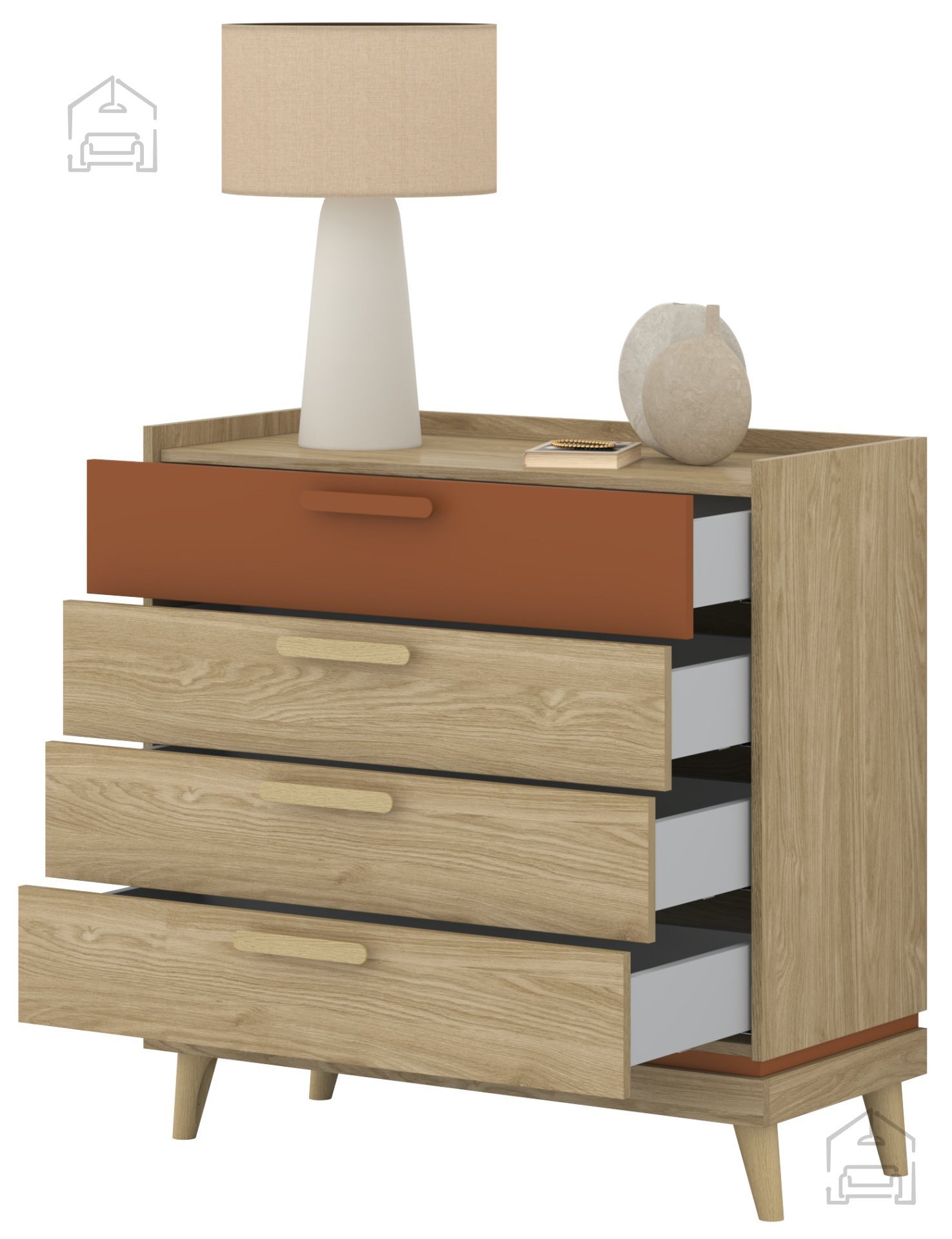 Dimenzije 90x40x90 cm omogočajo, da komoda ponuja dovolj prostora za shranjevanje, ne da bi zavzela preveč prostora. Ta ravnotežna razmerja so idealna za dnevno sobo, spalnico, predsobo ali celo jedilnico. Čiste linije, naravna barva oljenega hrasta in subtilen kontrast z odtenkom opeke ustvarjajo prijeten občutek domačnosti, obenem pa dodajo pridih sodobnega dizajna.
