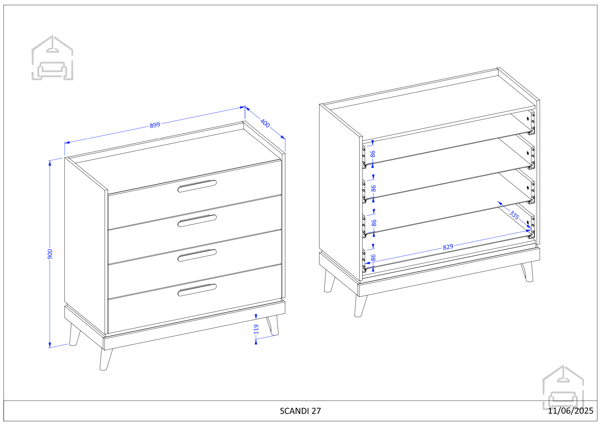 Izdelana je iz kakovostne pohištvene plošče debeline 15 mm in 22 mm, kar zagotavlja trdnost in dolgo življenjsko dobo. ABS robovi dodatno ščitijo površine pred udarci in obrabo, zato bo komoda še dolgo ohranila brezhiben videz. Plastične nogice poskrbijo za stabilnost in enostavno premikanje, hkrati pa ščitijo tla pred praskami.