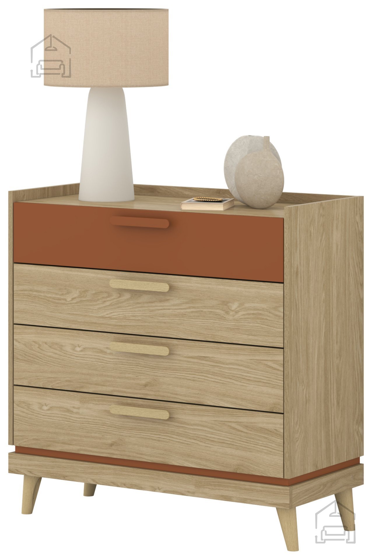 Topel videz hrasta v kombinaciji z elegantnim odtenkom opeke ustvarja občutek topline in domačnosti. Ta barvna kombinacija se odlično ujema z nevtralnimi toni sten, pohištva in tekstila, zato jo lahko enostavno vključite v obstoječo opremo vašega doma. Le nekaj dekorativnih dodatkov – na primer keramična vaza, sveča ali okvirjena fotografija – pa bo komodi dodalo osebni pečat.