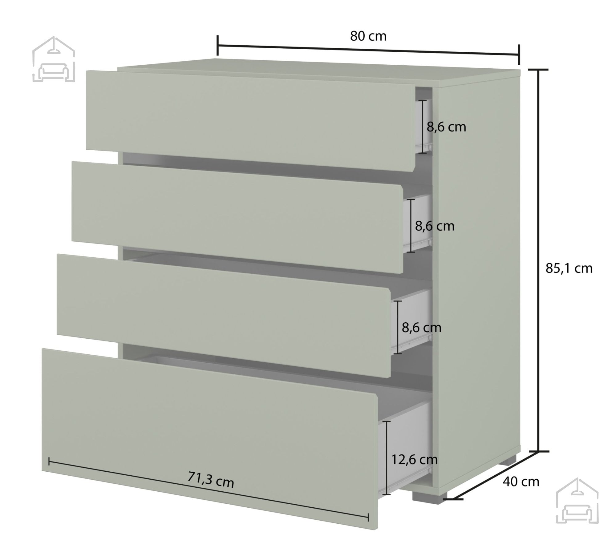Komoda je opremljena s štirimi prostornimi predali, ki omogočajo urejeno shranjevanje različnih predmetov. Predali se odpirajo gladko in tiho, kar prispeva k udobju uporabe. Zaradi pregledne notranje razporeditve se komoda odlično obnese tako za shranjevanje oblačil kot manjših gospodinjskih predmetov, dokumentov ali dodatkov za dnevno sobo. Njena praktičnost se pokaže tudi v manjših stanovanjih, kjer je pomemben vsak centimeter prostora.