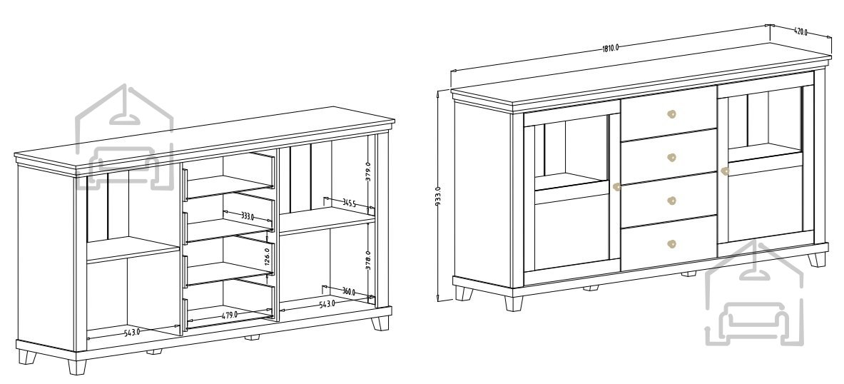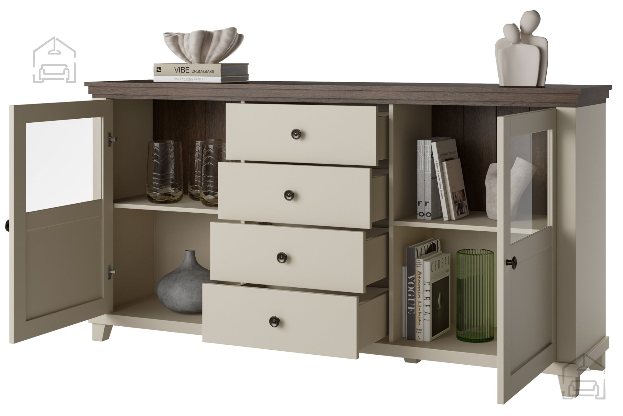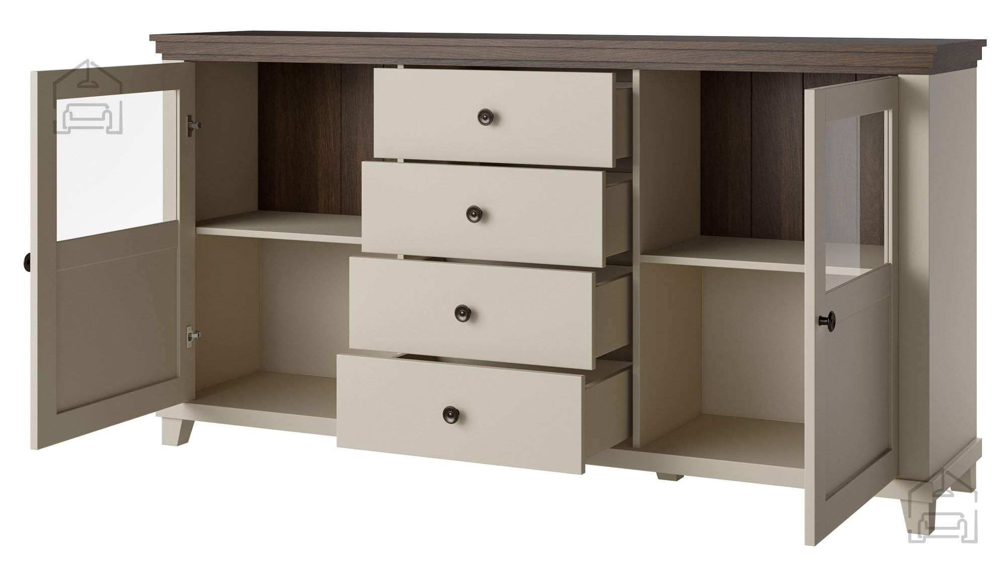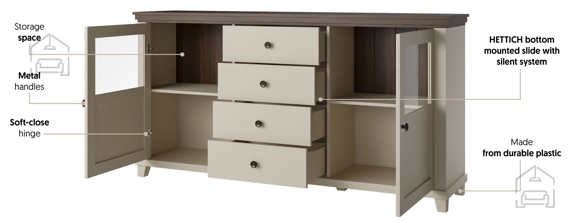 Komoda meri 181x42x93 cm in ponuja premišljeno razporeditev shranjevalnih površin. Opremljena je z dvema vratoma in štirimi prostornimi predali, kar omogoča učinkovito organizacijo različnih predmetov – od dokumentov, tekstila in namiznih dodatkov do dekorativnih elementov. Takšna struktura olajša ohranjanje reda v prostoru in omogoča jasen pregled nad shranjenimi stvarmi.