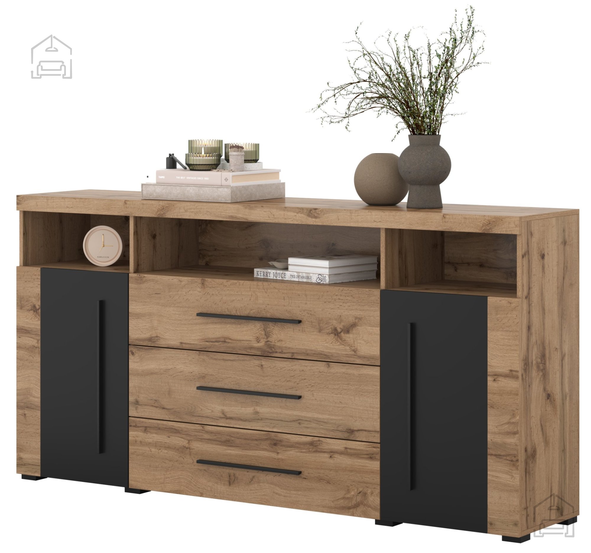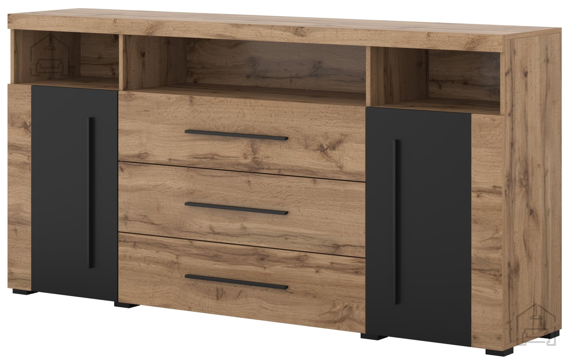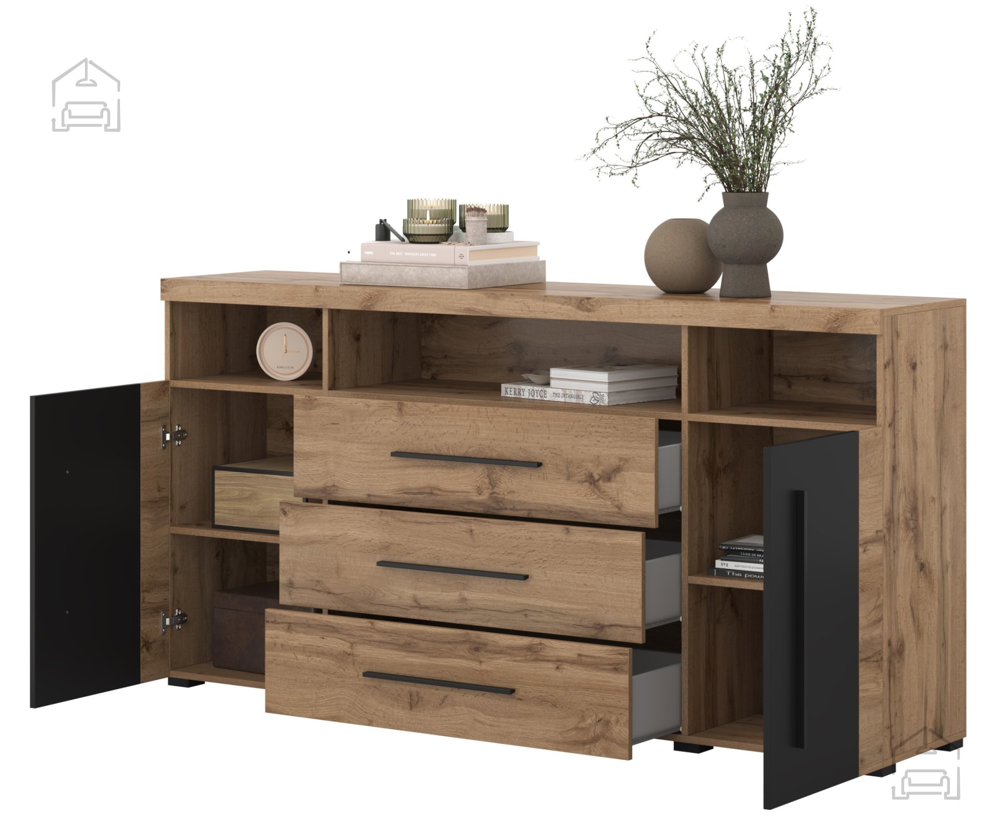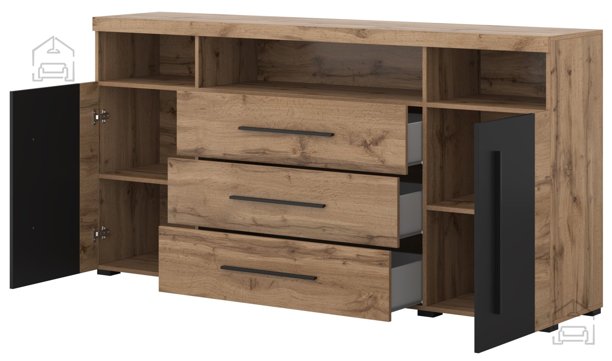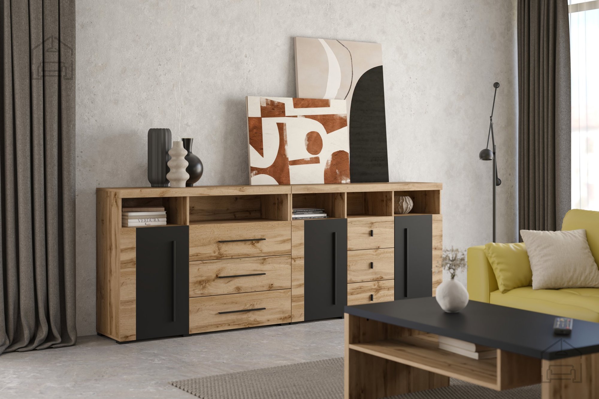 Komoda Roger – Helvetia meble je elegantna in funkcionalna rešitev za sodobne bivalne prostore. S svojo širino 182 cm in kombinacijo toplih tonov hrasta wotan ter kontrastne črne mat barve ustvarja uravnotežen in sodoben videz, ki se lepo ujema z različnimi interierji. Komoda je izdelana iz kakovostne laminirane plošče, ki je odporna na praske in vlago, kar zagotavlja dolgo življenjsko dobo in enostavno vzdrževanje. Robovi so obdelani s tehnologijo ABC, ki dodatno ščiti površine pred udarci in poškodbami, hkrati pa doprinese k urejenemu videzu celotnega kosa pohištva.