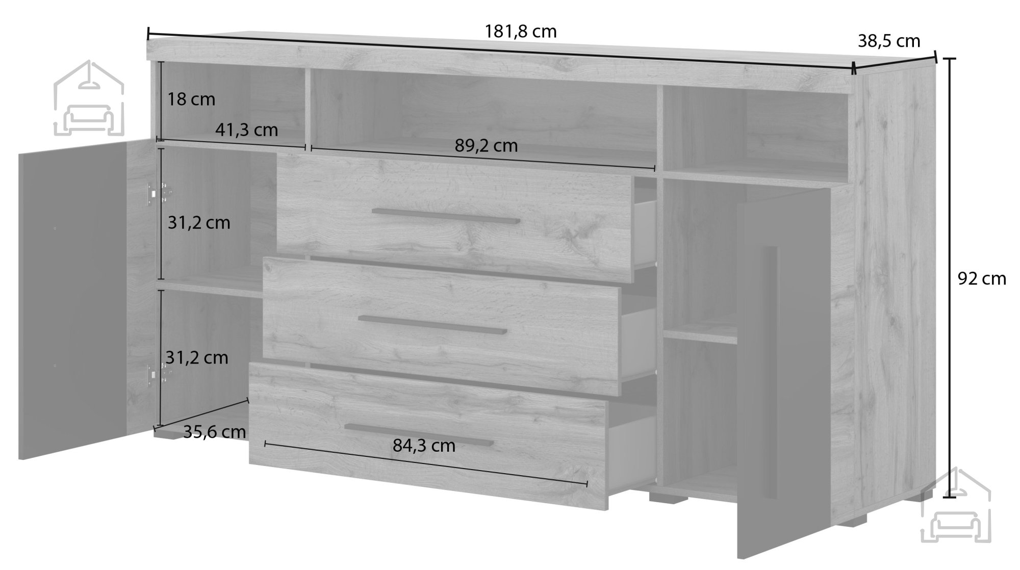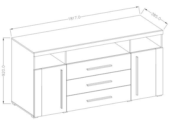 Komoda Roger meri 182x39x92 cm in ponuja optimalno razmerje med prostornostjo in kompaktnostjo. Notranja razporeditev vključuje dva vrata in tri predale, kar omogoča enostavno ločevanje predmetov po namenu. Predali so primerni za shranjevanje manjših predmetov, kot so dokumenti, tekstil ali dodatki, medtem ko prostor za vrati nudi dovolj prostora za večje kose, kot so posoda, knjige ali dekorativni elementi. Zaradi premišljene postavitve je komoda primerna za dnevne sobe, spalnice, hodnike ali celo pisarne.
