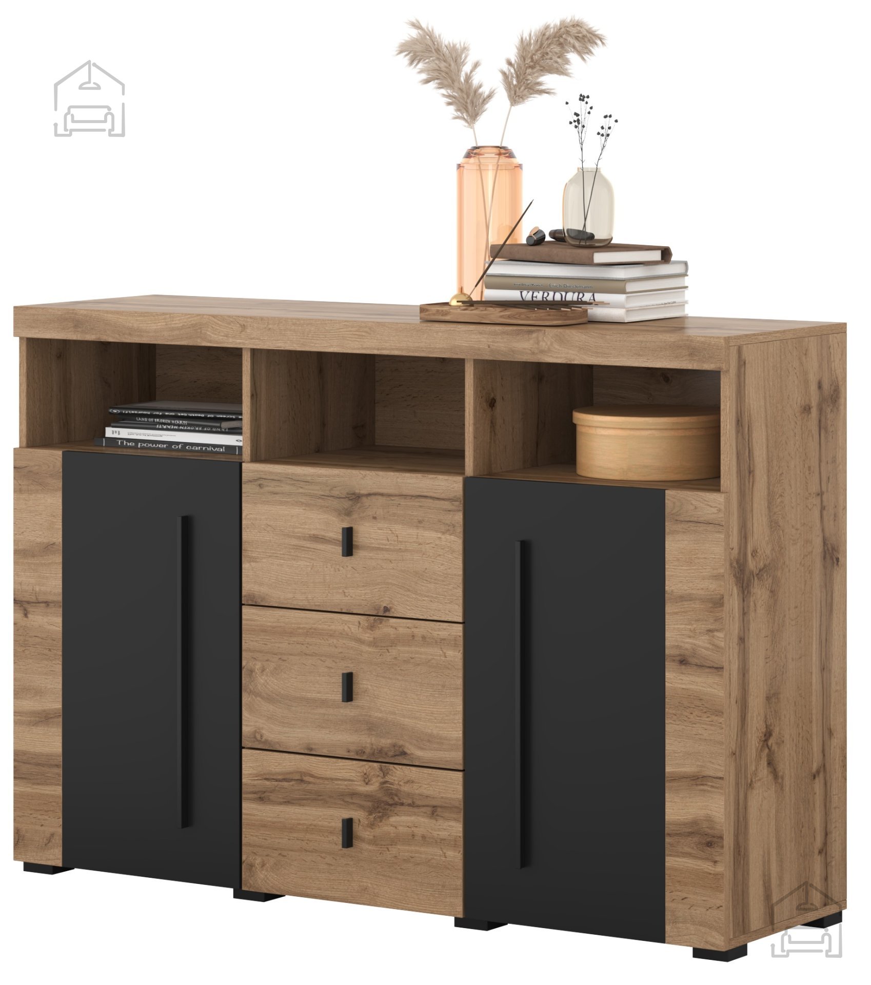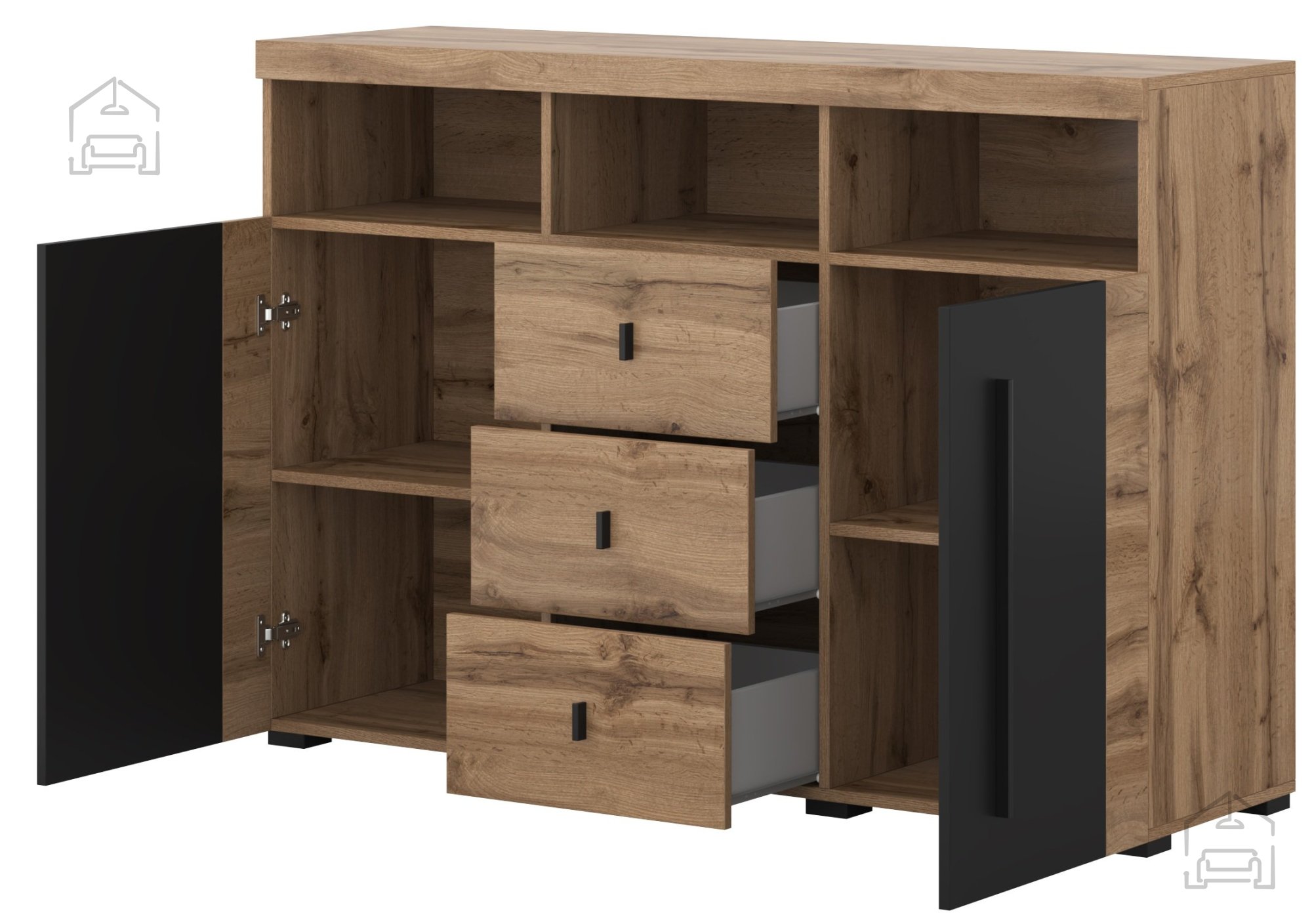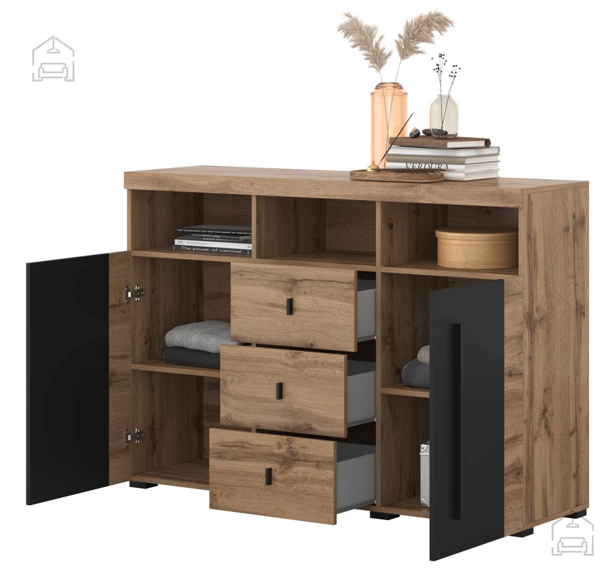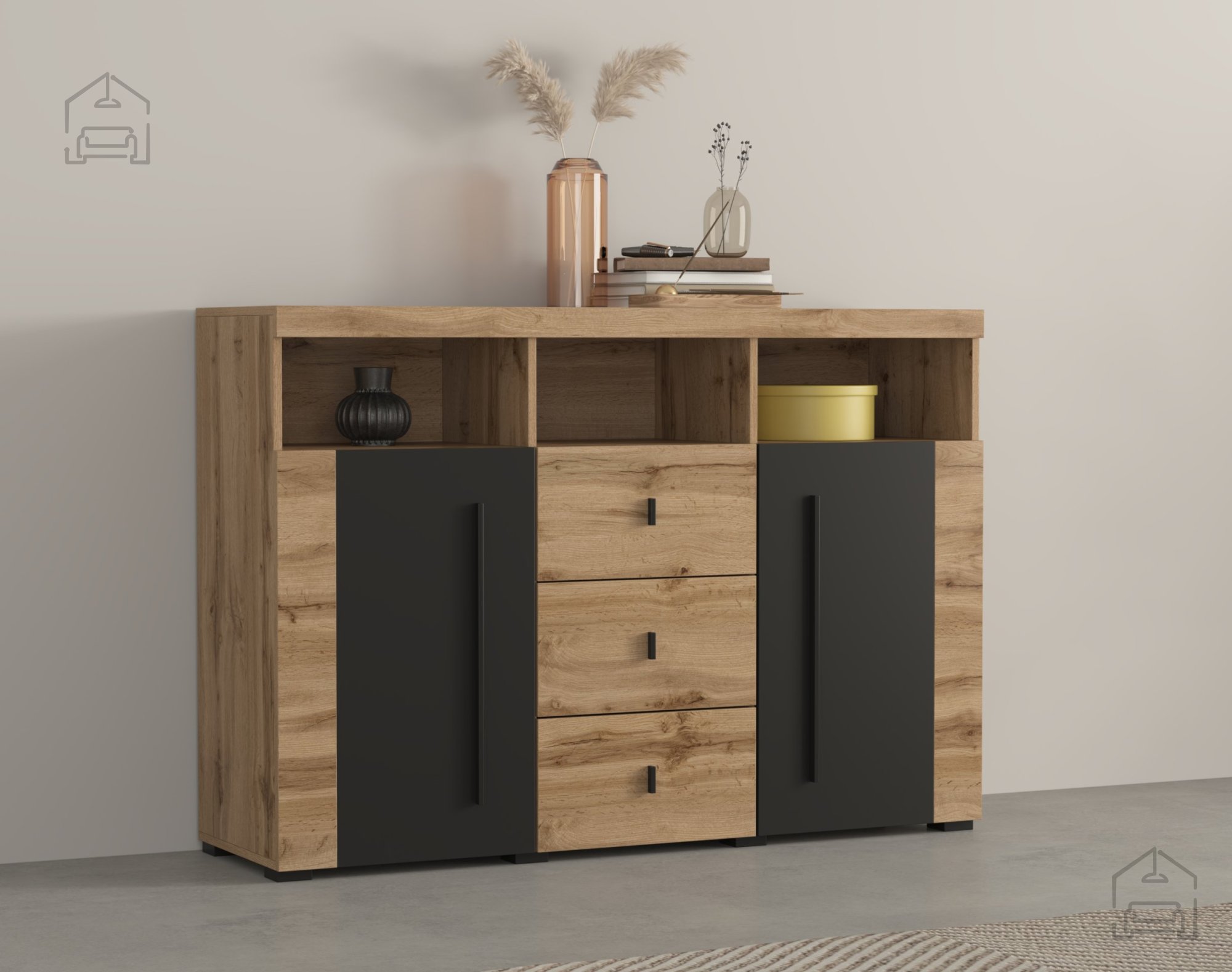 Komoda Roger je funkcionalen in estetsko dovršen kos pohištva, ki združuje sodoben videz z visoko uporabnostjo. Izdelana je iz kakovostne laminirane plošče, odporne na praske in vlago, zato je primerna za vsakodnevno uporabo v dnevni sobi, spalnici ali predsobi. Plošče v dekorju hrasta wotan so toplo obarvane in poudarjajo naravno strukturo lesa, črna mat površina pa doda eleganten kontrast in sodoben značaj. Komoda je zasnovana z mislijo na praktičnost – ponuja dovolj prostora za shranjevanje in hkrati ohranja prečiščeno linijo, ki se lepo zlije z različnimi stili notranje opreme.