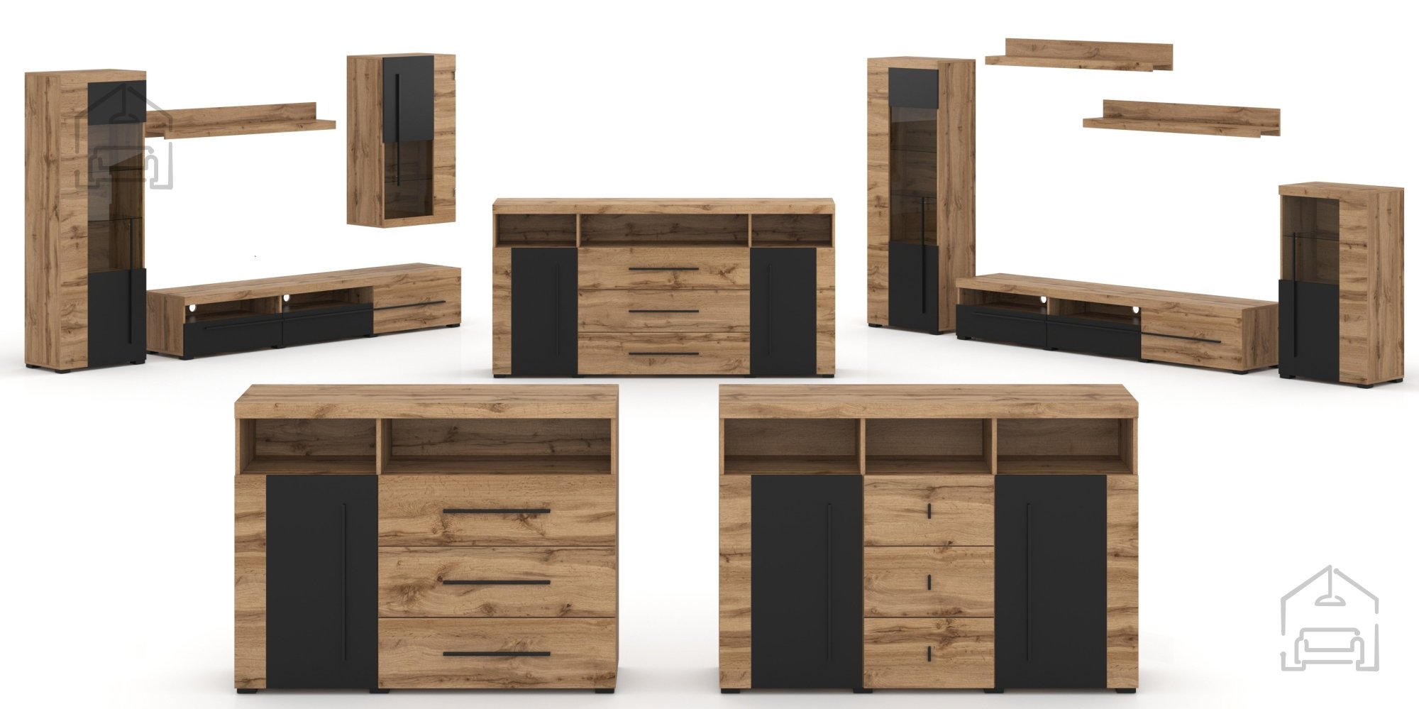 Kombinacija barv hrasta wotan in črne mat površine ustvarja harmoničen, a hkrati sodoben videz. Hrast wotan s svojo toplo, naravno teksturo v prostor vnese občutek domačnosti, medtem ko črna mat poudari linije pohištva in mu doda kanček prestiža. Takšna barvna kombinacija se lepo ujema z drugimi lesenimi ali kovinskimi elementi v notranjosti ter omogoča enostavno kombiniranje z različnimi barvnimi poudarki v prostoru. Komoda se tako zlahka vključi v skandinavski, industrijski ali minimalistični slog opreme.