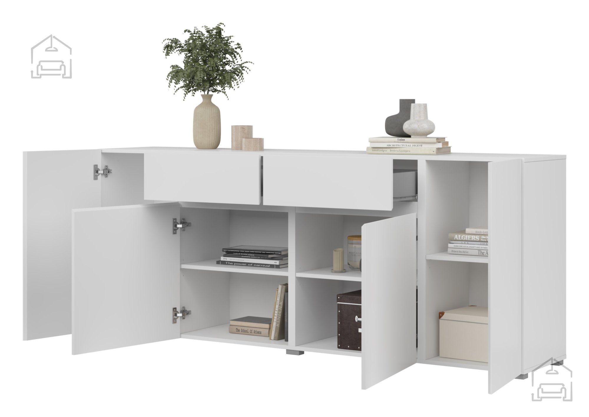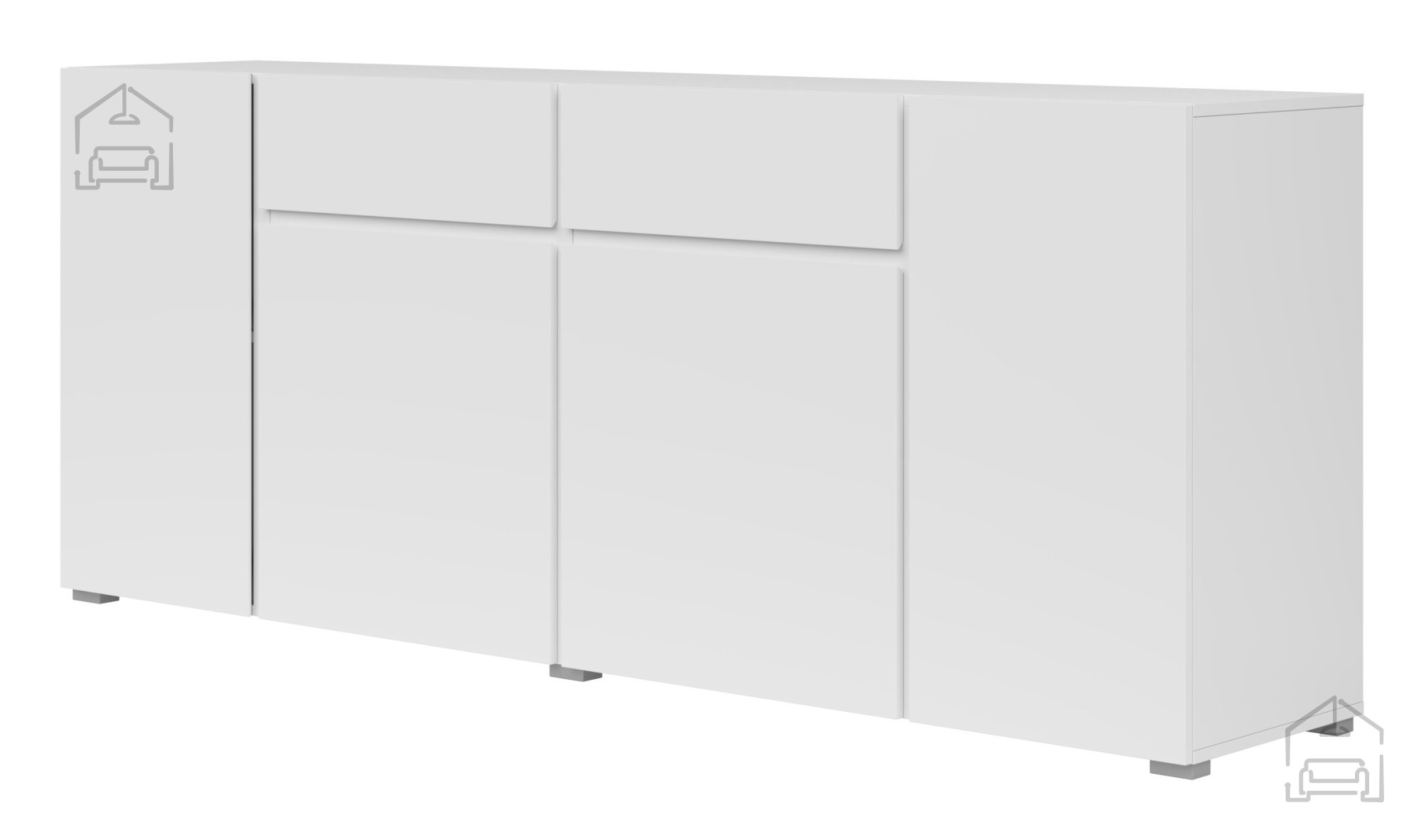 Komoda ponuja štiri vrata in dva prostorna predala, kar omogoča različno organizacijo predmetov. Za vrati se skrivajo uporabne police, kamor lahko pospravite posodo, tekstil ali dokumente. Predala pa sta primerna za drobnejše predmete, kot so jedilni pribor, prti ali dodatki za gospodinjstvo. Zaradi preprostega odpiranja z mehanizmom push-to-open je uporaba komode prijetna in tiha, brez nepotrebnih ročajev, ki bi motili čistost linij.
