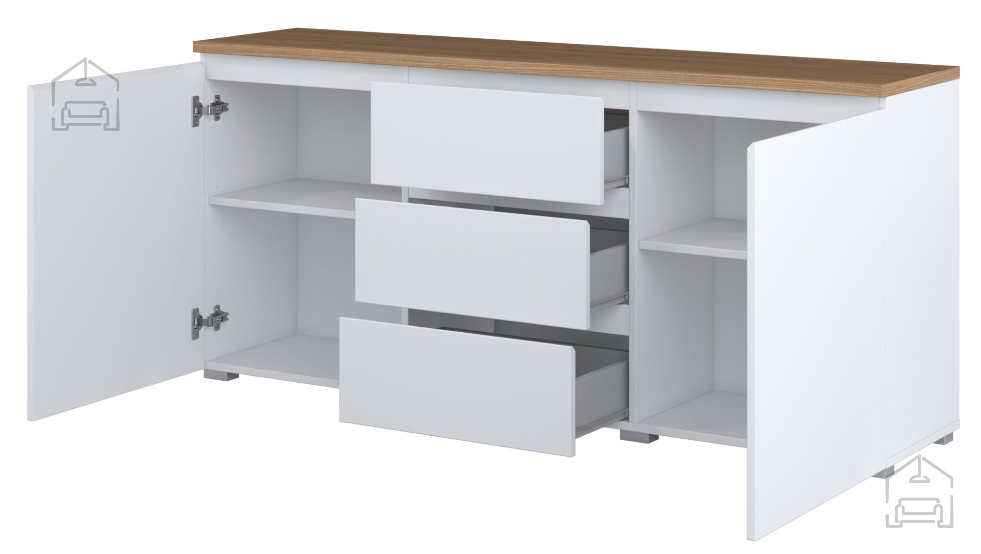 Komoda Modo 247VOJ26 ponuja dva vrata in tri prostorne predale, kar omogoča organizirano shranjevanje različnih predmetov. Predali so primerni za manjše predmete, dokumente ali tekstil, medtem ko prostori za vrati nudijo več prostora za večje stvari, kot so knjige, posoda ali dekorativni dodatki. Uporabna razporeditev notranjosti omogoča, da komoda služi tako kot samostojen kos v dnevni sobi kot tudi kot del večje sestave v spalnici ali jedilnici.