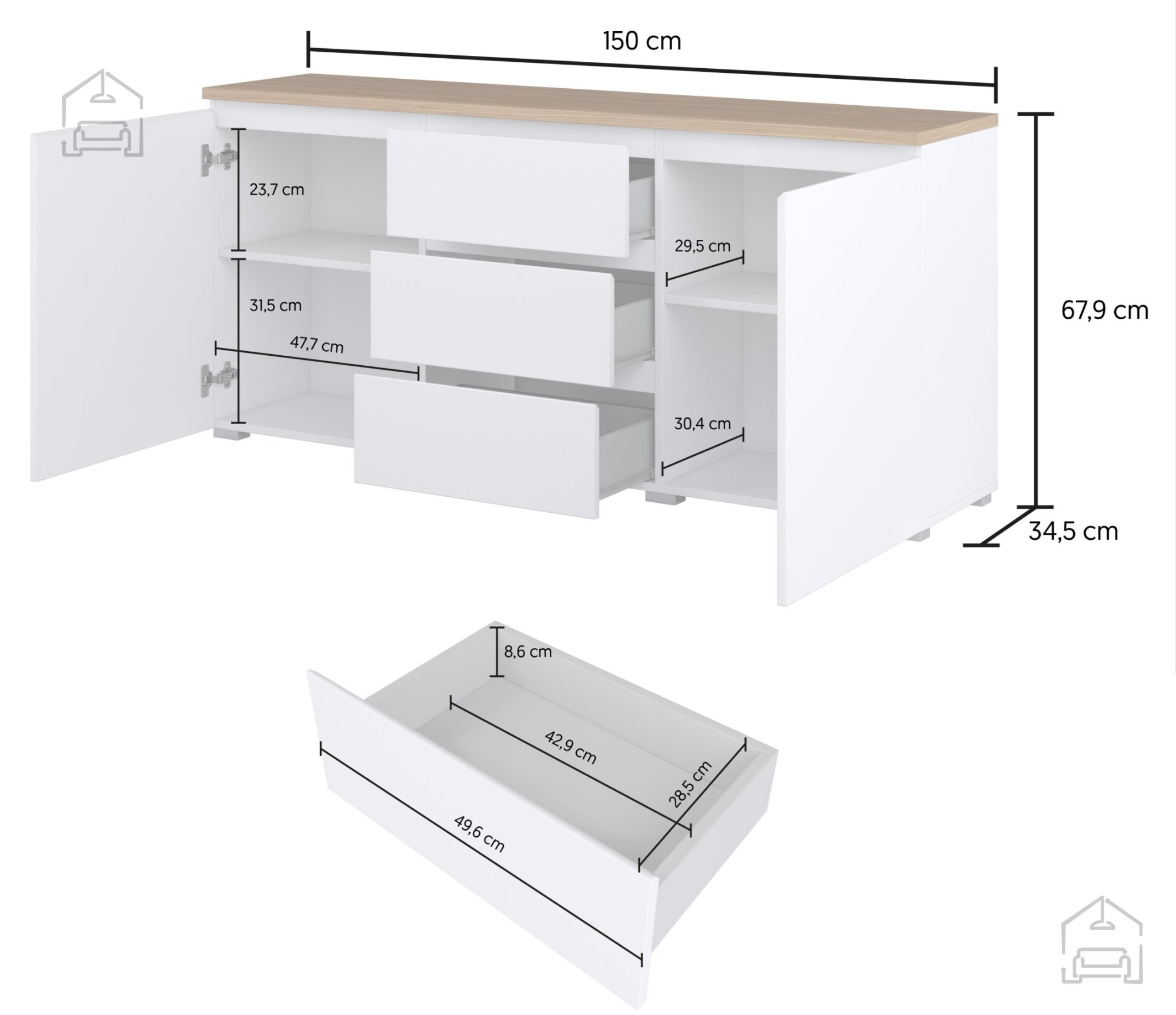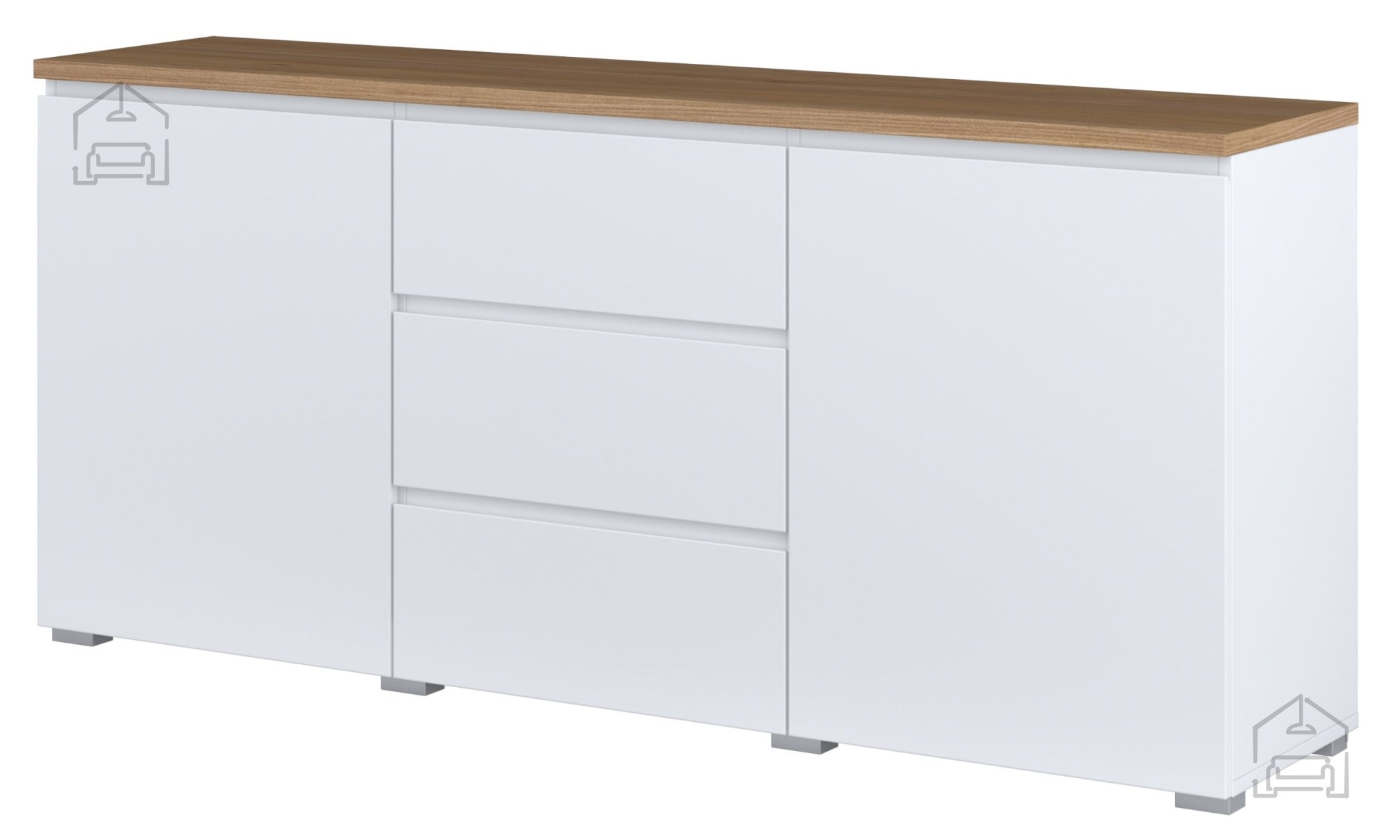 Laminirane površine so enostavne za čiščenje – dovolj je, da jih obrišete z mehko, rahlo vlažno krpo. Za ohranjanje naravnega videza lesa in beline se izogibajte agresivnim čistilom ali abrazivnim gobicam. Komoda je namenjena uporabi v notranjih prostorih in je zasnovana tako, da ohranja svoj videz in funkcionalnost tudi ob vsakodnevni uporabi.