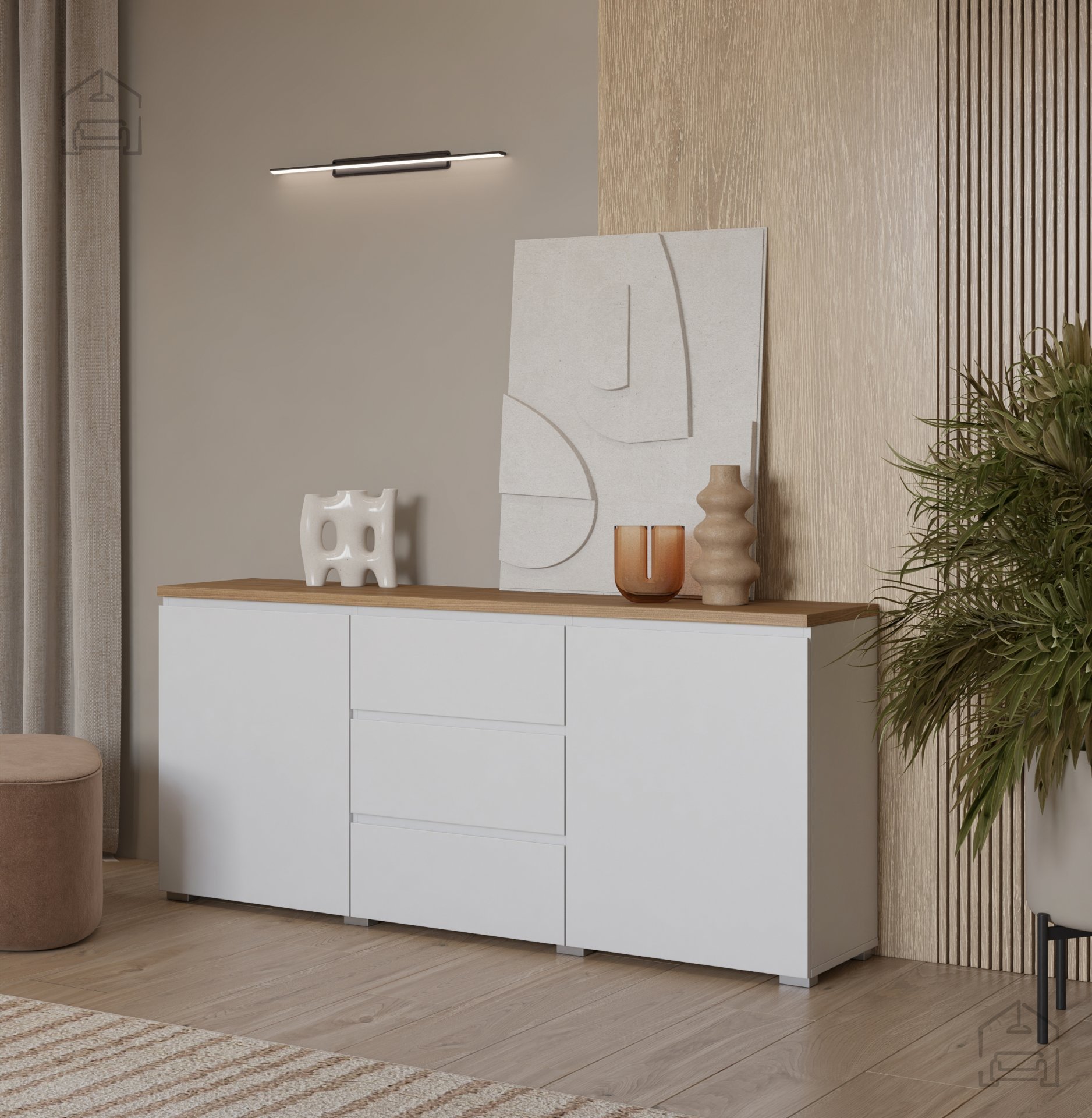 Barvna kombinacija bela/hrast mauvella ustvarja prijeten kontrast med toplino naravnega videza lesa in čisto, sodobno belino. Komoda se lepo ujema z različnimi notranjimi slogi – od minimalističnih do skandinavskih in modernih interierjev. Zaradi svojega nevtralnega videza jo je mogoče enostavno kombinirati z drugimi kosi pohištva iz iste serije ali z obstoječim pohištvom v prostoru.