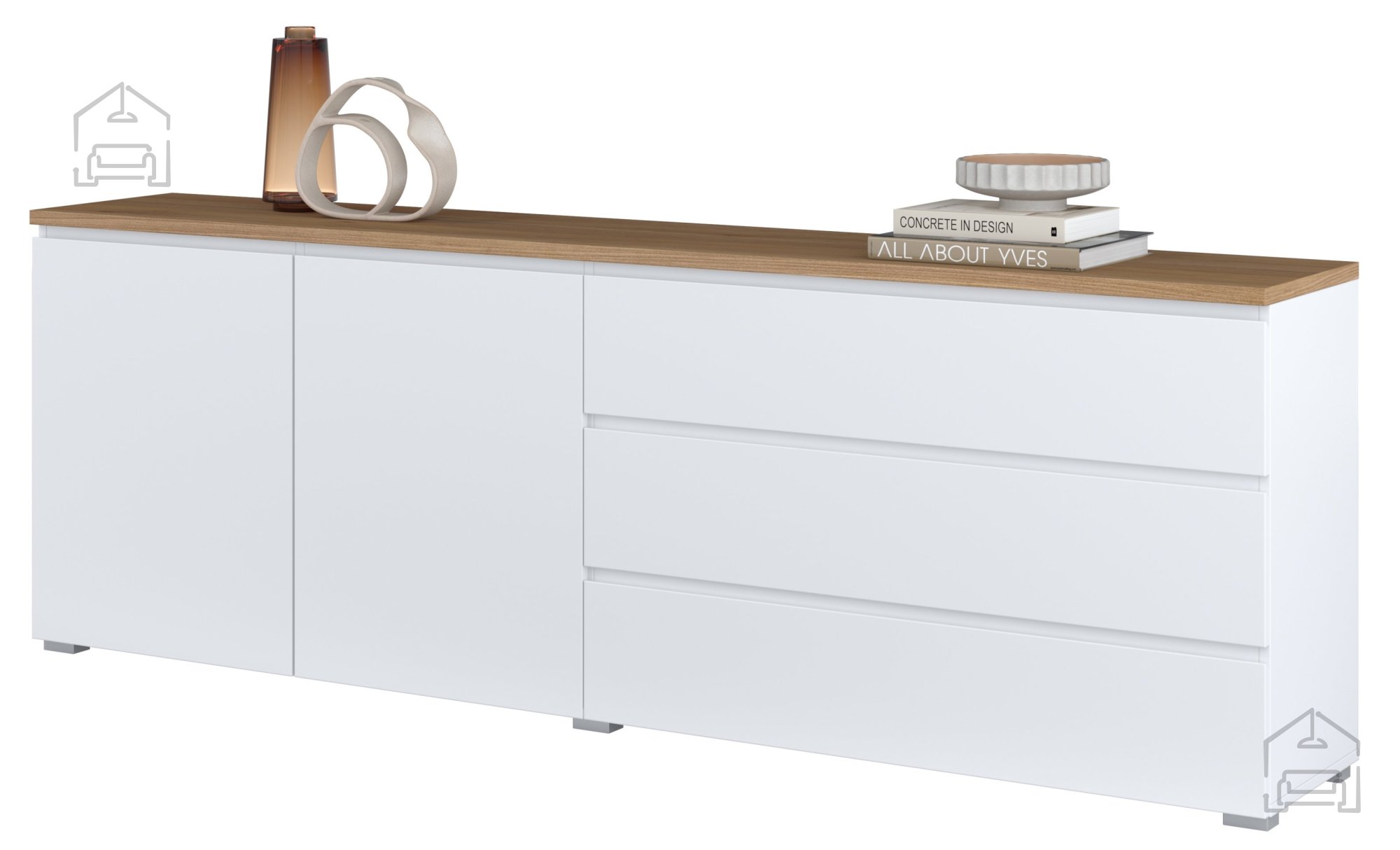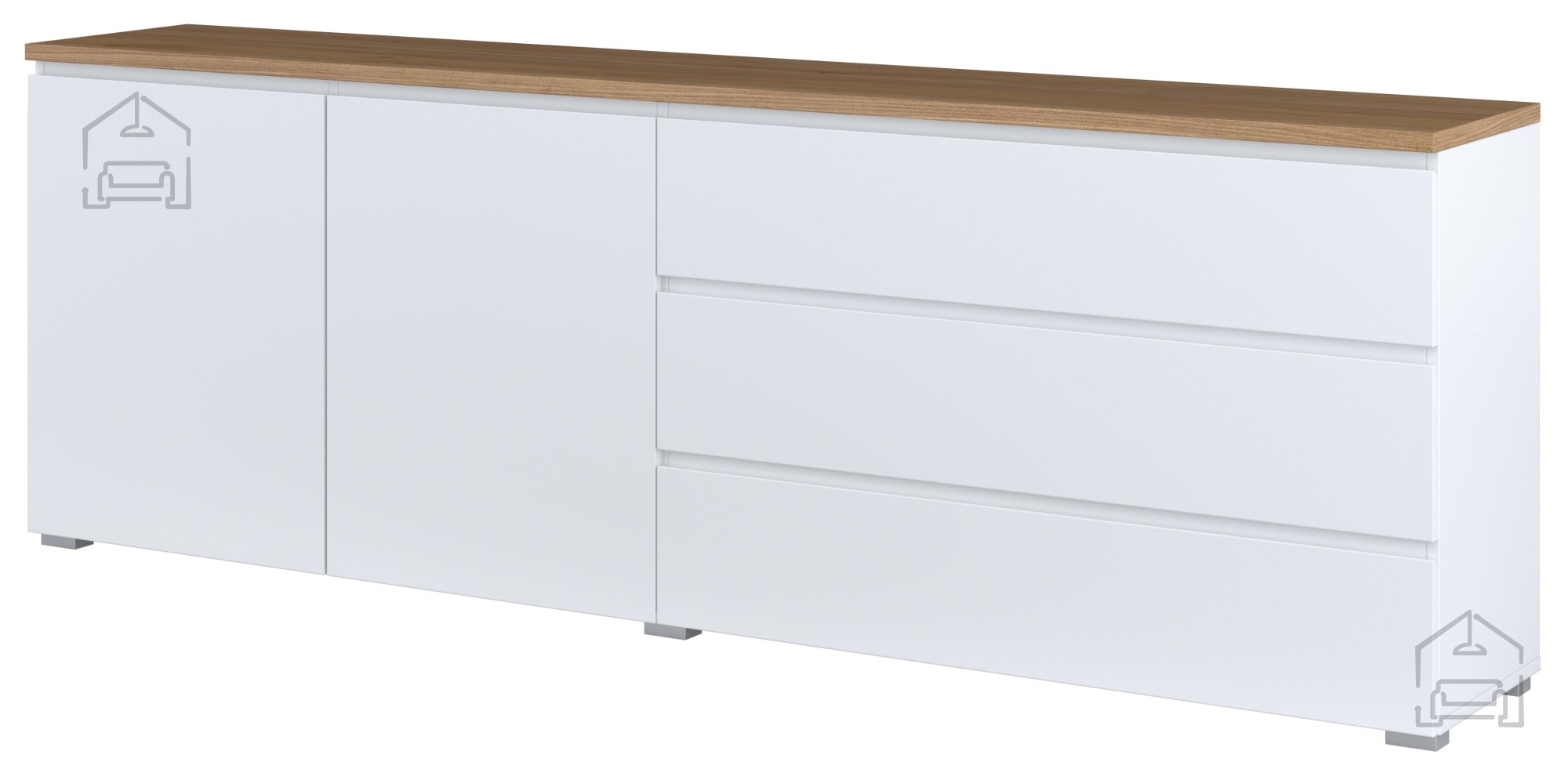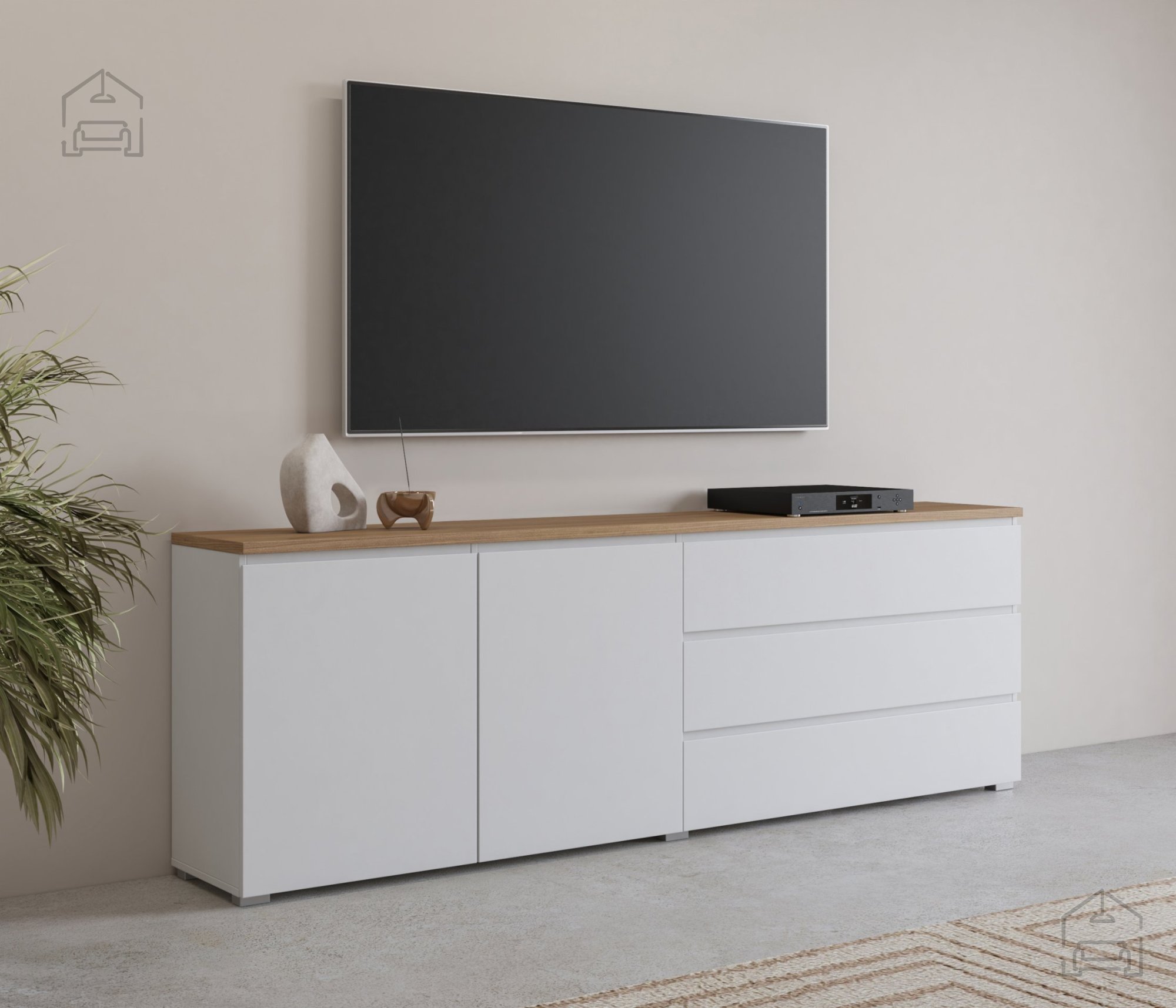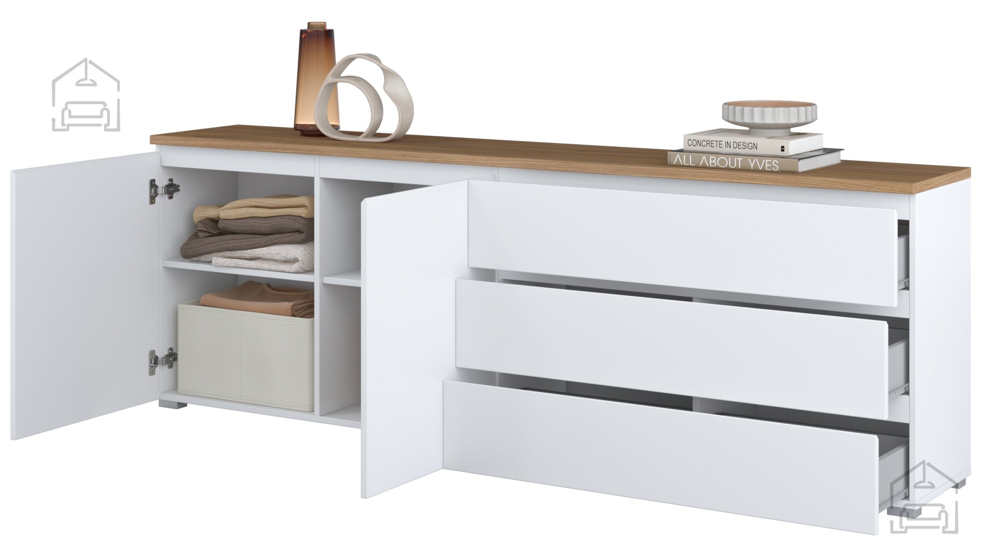 Kombinacija bele barve in hrasta mauvella se zlahka poveže z drugimi pohištvenimi kosi v podobnih tonih. Bela površina prinaša svetlobo in občutek prostornosti, medtem ko dekor hrasta dodaja toplino in naravni pridih. Komodo lahko postavite ob steno, pod televizor ali za shranjevanje v jedilnici. Zaradi svoje univerzalne oblike se lepo ujema z različnimi tipi talnih oblog – od svetlega parketa do sivih ploščic – in omogoča ustvarjanje harmonične notranje podobe.