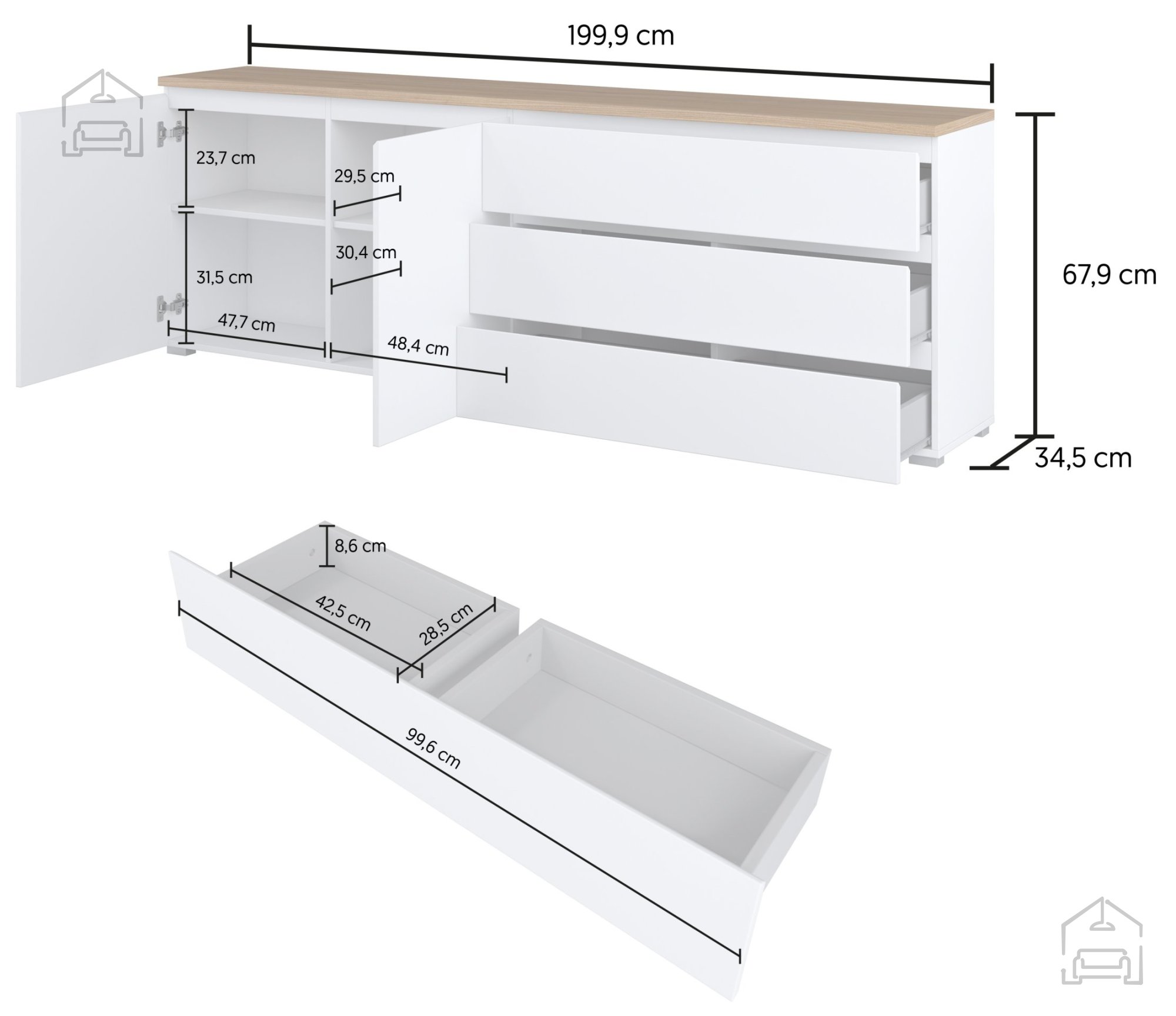 Komoda vključuje tri vrata in tri predale, kar omogoča pregledno razporeditev predmetov v dnevni sobi, jedilnici ali spalnici. Predali so primerni za shranjevanje dokumentov, tekstila ali manjših predmetov, medtem ko prostorni notranji deli za vrati ponujajo dovolj prostora za večje kose, kot so posoda, knjige ali dodatki za dom. Zaradi premišljene postavitve lahko komoda uspešno nadomesti več posameznih omaric, zato je idealna izbira za tiste, ki želijo ohraniti red in elegance v enem kosu pohištva.