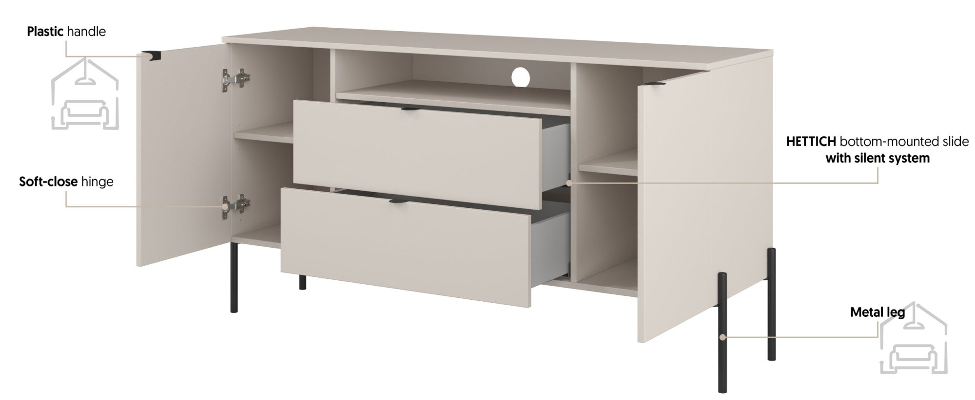 Komoda Ore ni le estetsko dovršena, temveč tudi praktična. Opremljena je s plastičnimi ročaji, ki se lepo ujemajo z minimalističnim dizajnom in omogočajo udobno odpiranje vrat. Tečaji z mehkim zapiranjem zagotavljajo tiho in tekoče zapiranje, kar preprečuje neprijetno pokanje in podaljšuje življenjsko dobo pohištva. Takšna rešitev omogoča prijetnejšo uporabniško izkušnjo in pripomore k ohranjanju brezhibnega videza skozi čas.