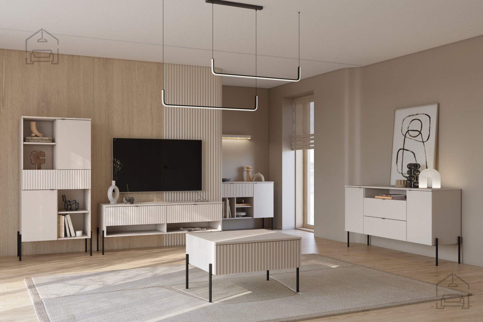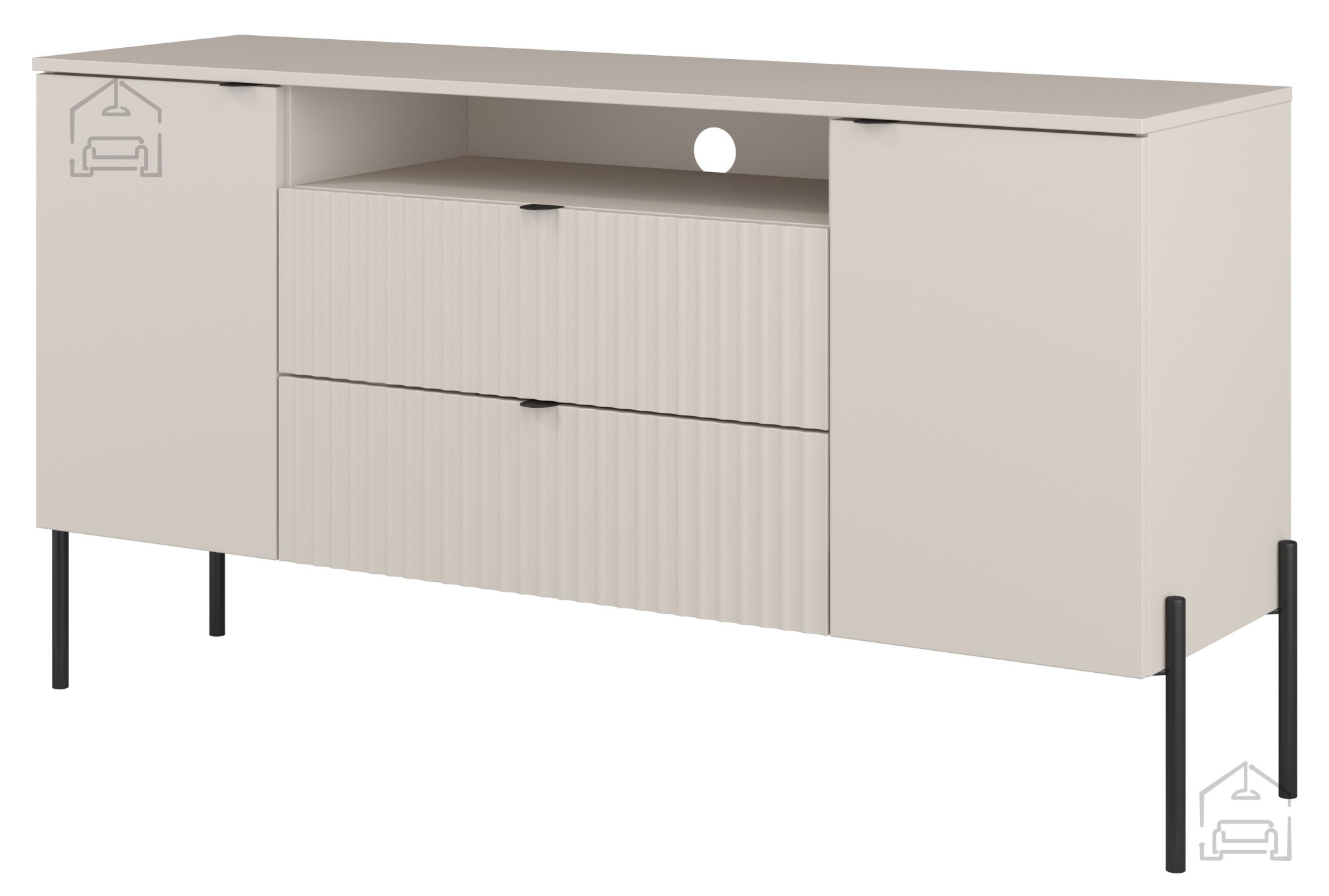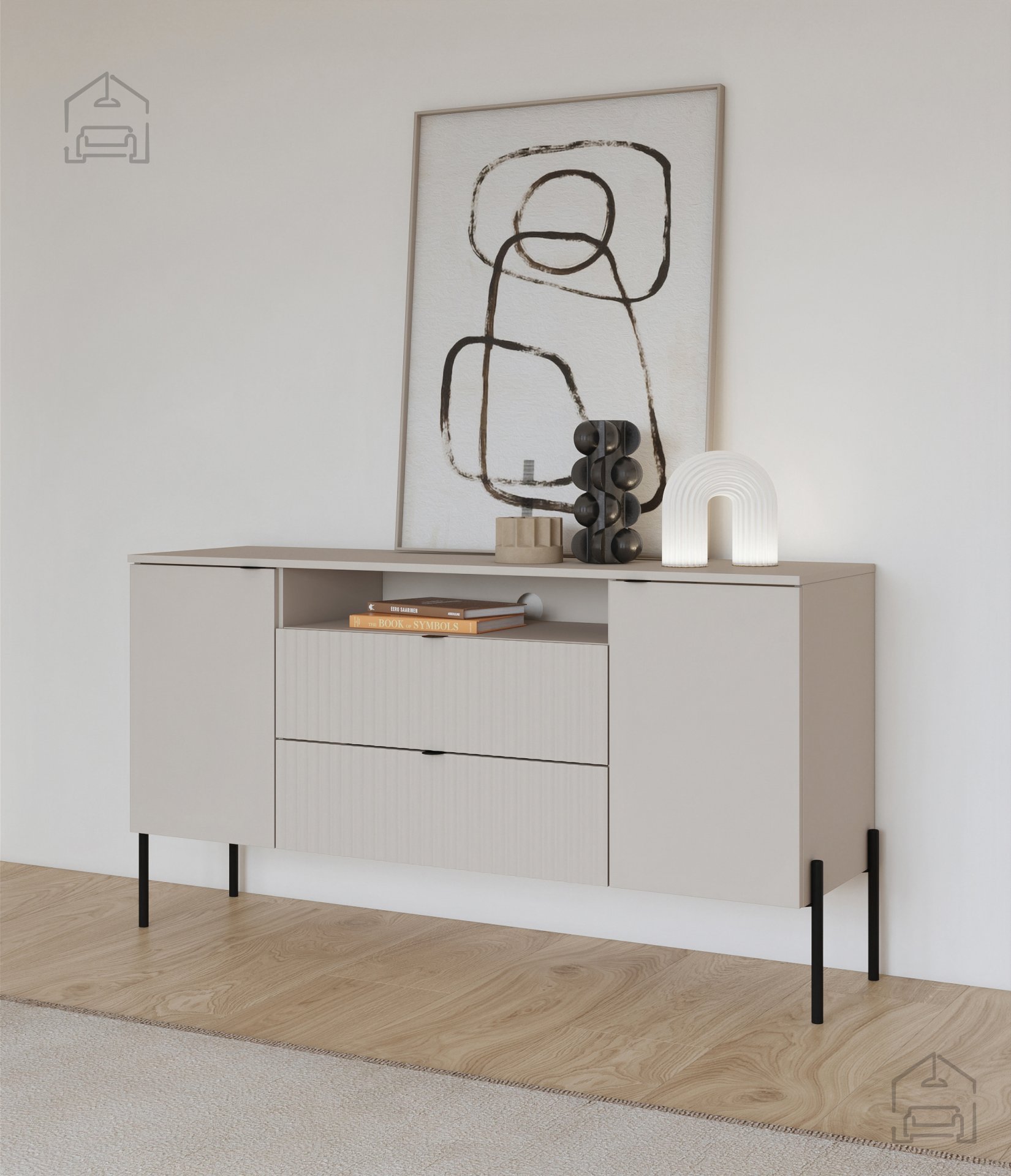 Barva kašmir je izjemno priljubljena zaradi svoje topline in nevtralnosti, ki se lepo ujema z različnimi toni lesa, kamna ali tekstila. Rebrasta struktura površine ustvarja igro svetlobe in sence, kar daje komodi dodatno globino. Črni mat elementi prispevajo k elegantnemu videzu, medtem ko kovinske noge dodajo pridih industrijske robustnosti. Takšna kombinacija naredi komodo Ore vsestransko izbiro za različne prostore – bodisi kot shranjevalni element v dnevni sobi bodisi kot praktičen kos v predsobi ali spalnici.