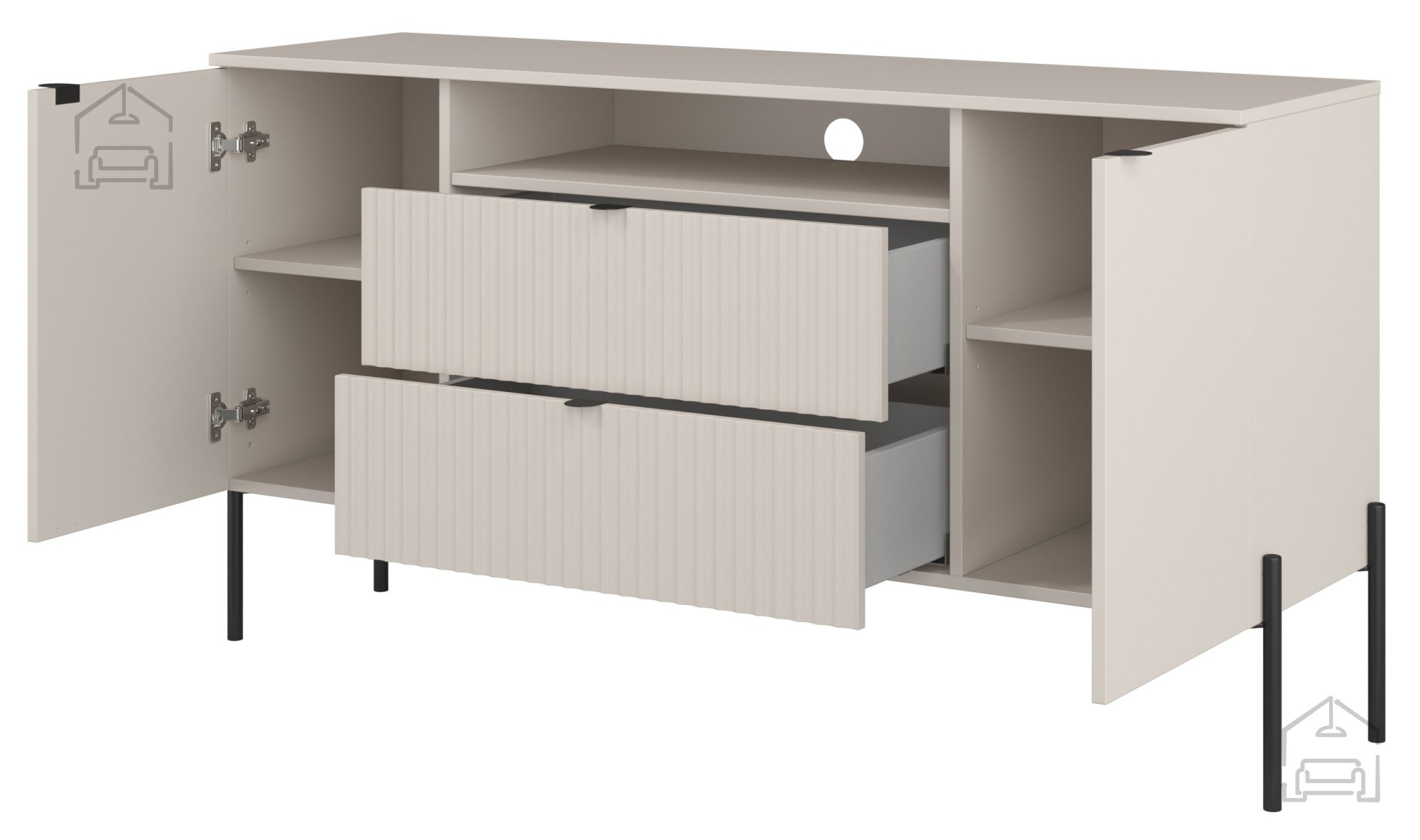 Osnovni material komode je laminirana plošča debeline 15 mm, ki zagotavlja stabilnost in enostavno vzdrževanje. Površina v barvi kašmir z značilno rebrasto strukturo doda izdelku tridimenzionalni učinek in vizualno dinamiko. Kombinacija z mat črnimi kovinskimi elementi ustvarja kontrast, ki poudarja sodoben značaj pohištva. Kovinske noge višine 270 mm (štirje kosi) nudijo trdno oporo in omogočajo enostavno čiščenje tal pod komodo. Robovi so zaključeni z ABS ali papirnimi trakovi, kar dodatno ščiti plošče pred udarci in vlago.
