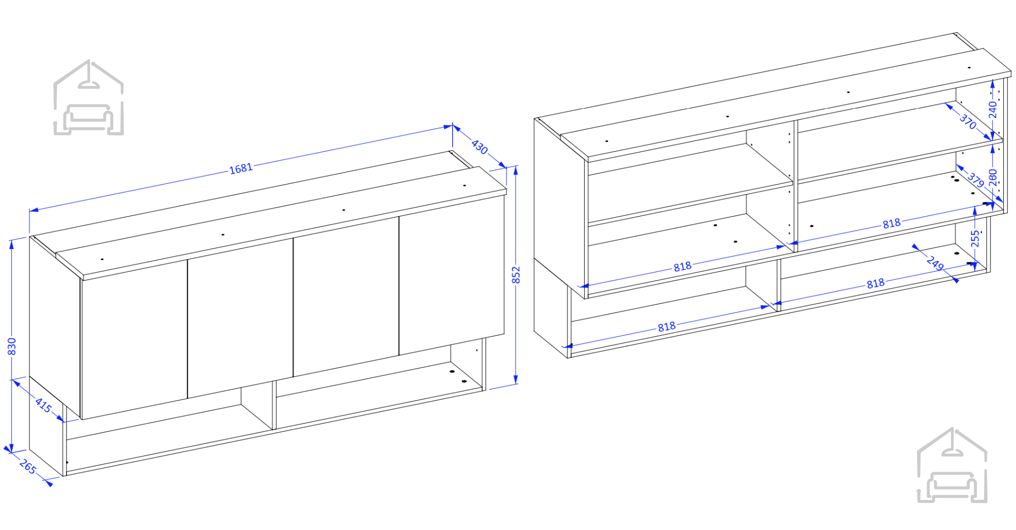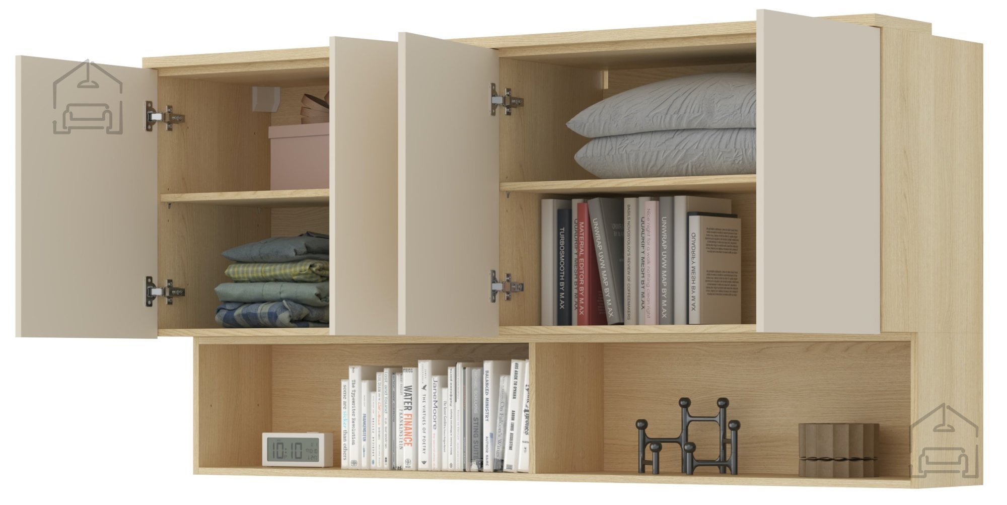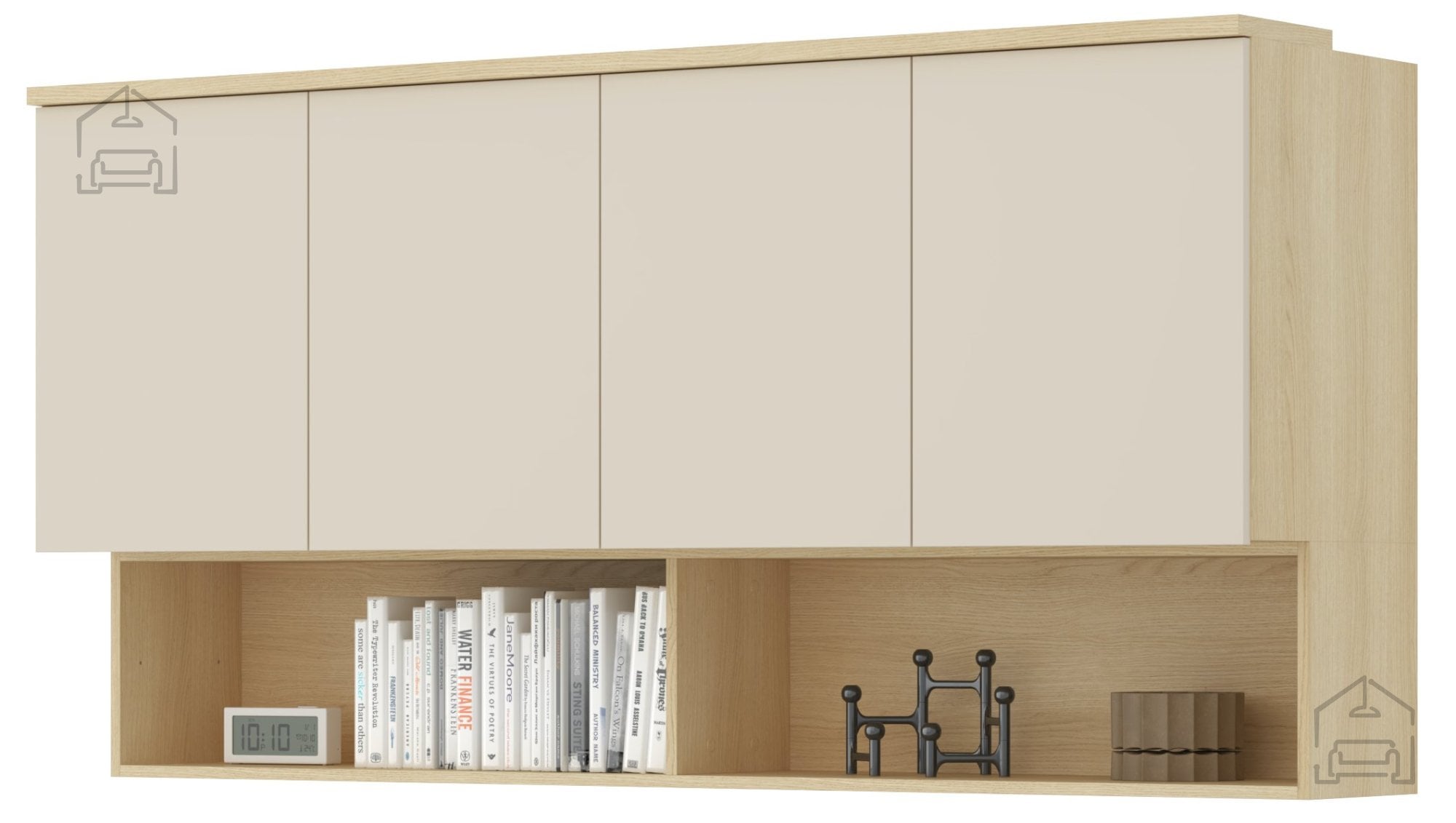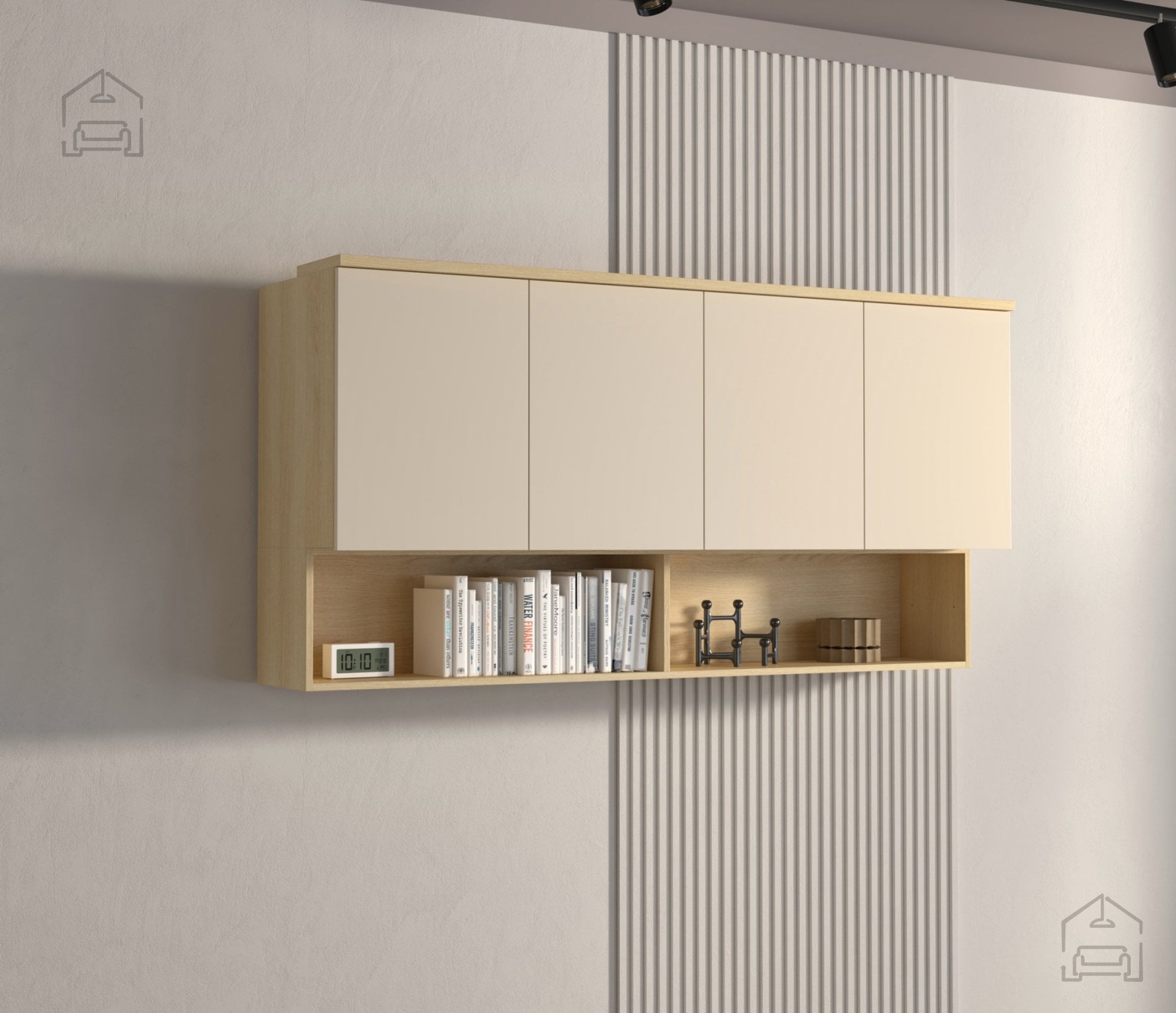 Zaradi svoje konstrukcije je omarica namenjena montaži na steno, kar omogoča lažje čiščenje talnega prostora in vizualno razbremeni prostor. Viseča postavitev ustvari vtis lebdenja, kar je značilno za sodobne pohištvene trende. Omarica vključuje štiri vrata, ki se odpirajo levo in desno, kar omogoča praktično shranjevanje različnih predmetov – od posode in steklenin do dokumentov ali dekorativnih dodatkov. Notranjost je razdeljena tako, da omogoča preglednost in optimalno izrabo prostora.